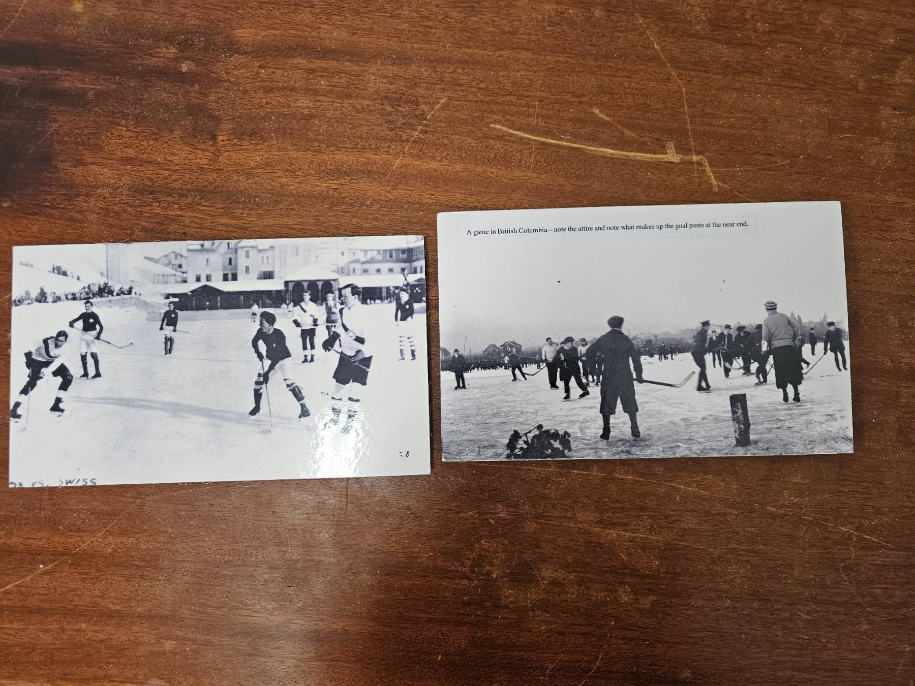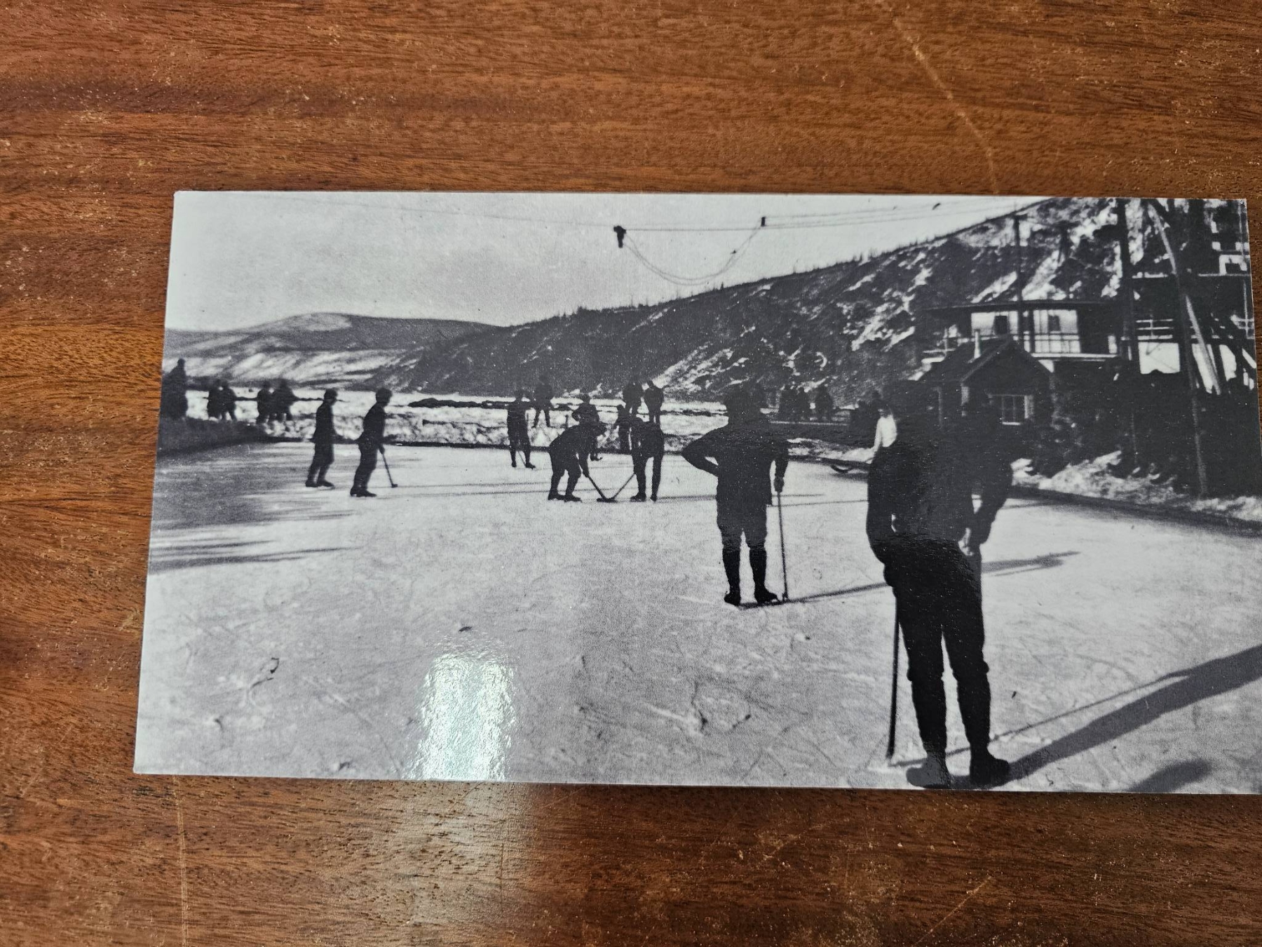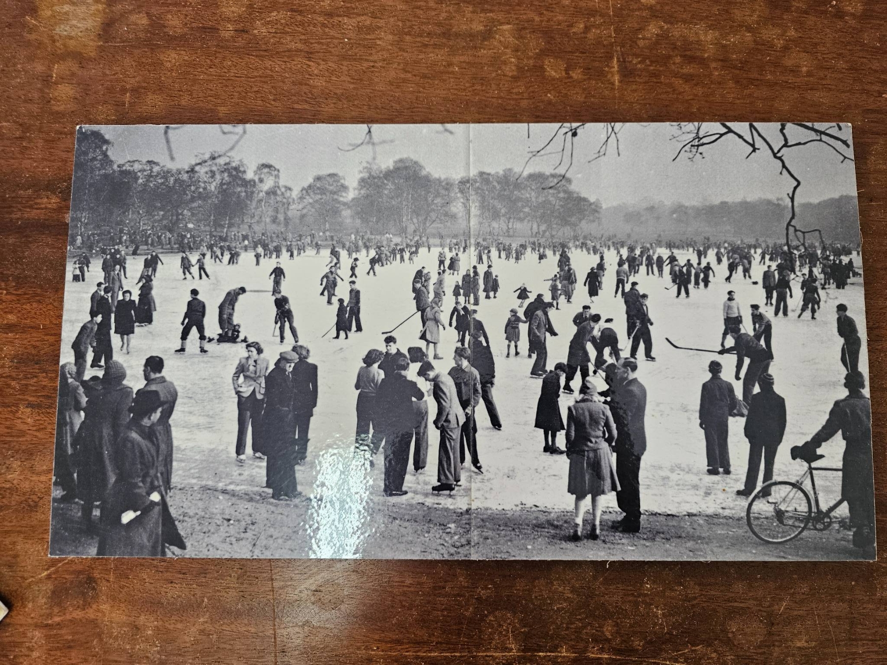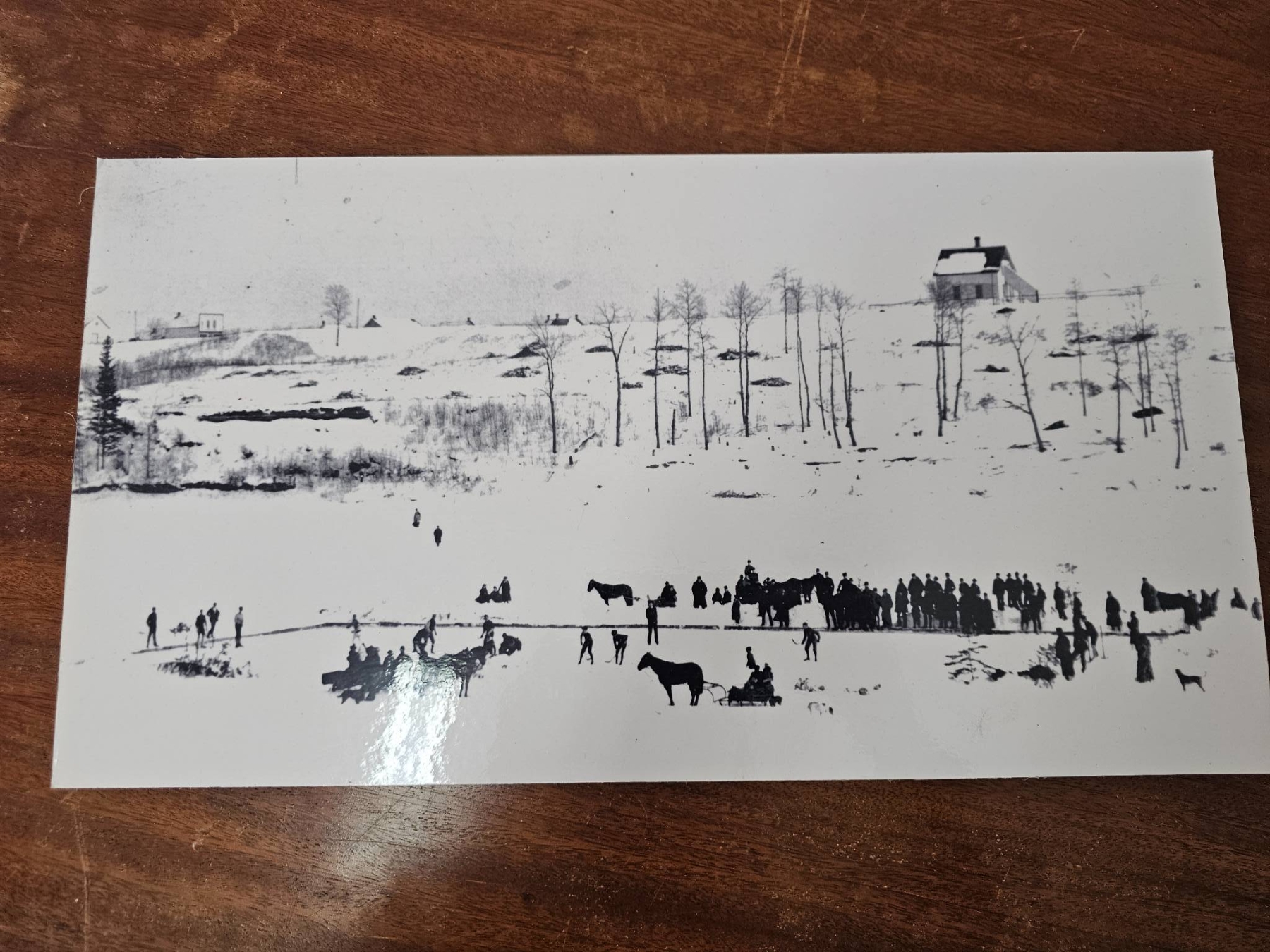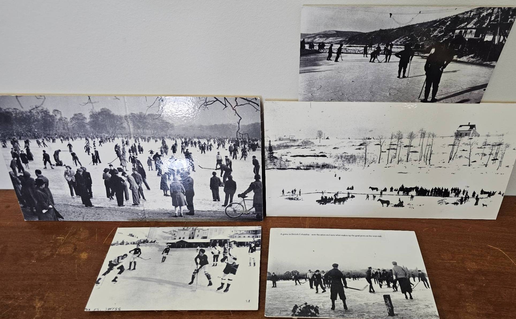 Vintage black-and-white photographs depicting historical ice skating and winter scenes. Includes six pieces featuring various settings, from crowded ice-skating gatherings to rural winter landscapes. Some include people engaged in winter activities. All prints are in monochrome and appear mounted on cardstock. Condition shows moderate signs of wear consistent with age, such as minor scratches or discoloration.
