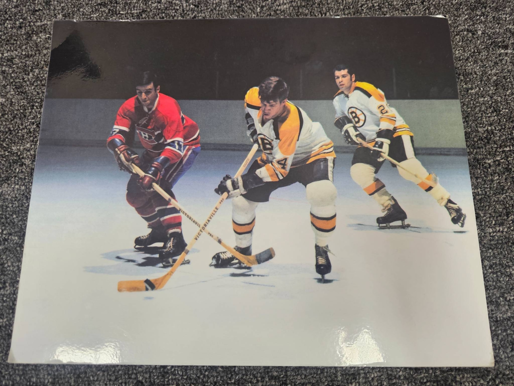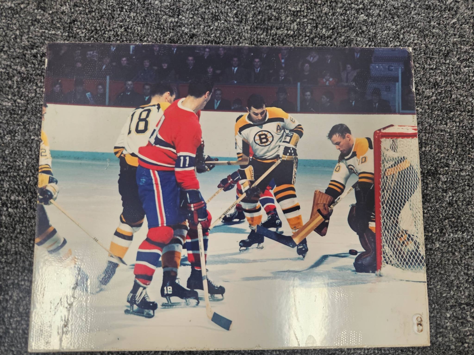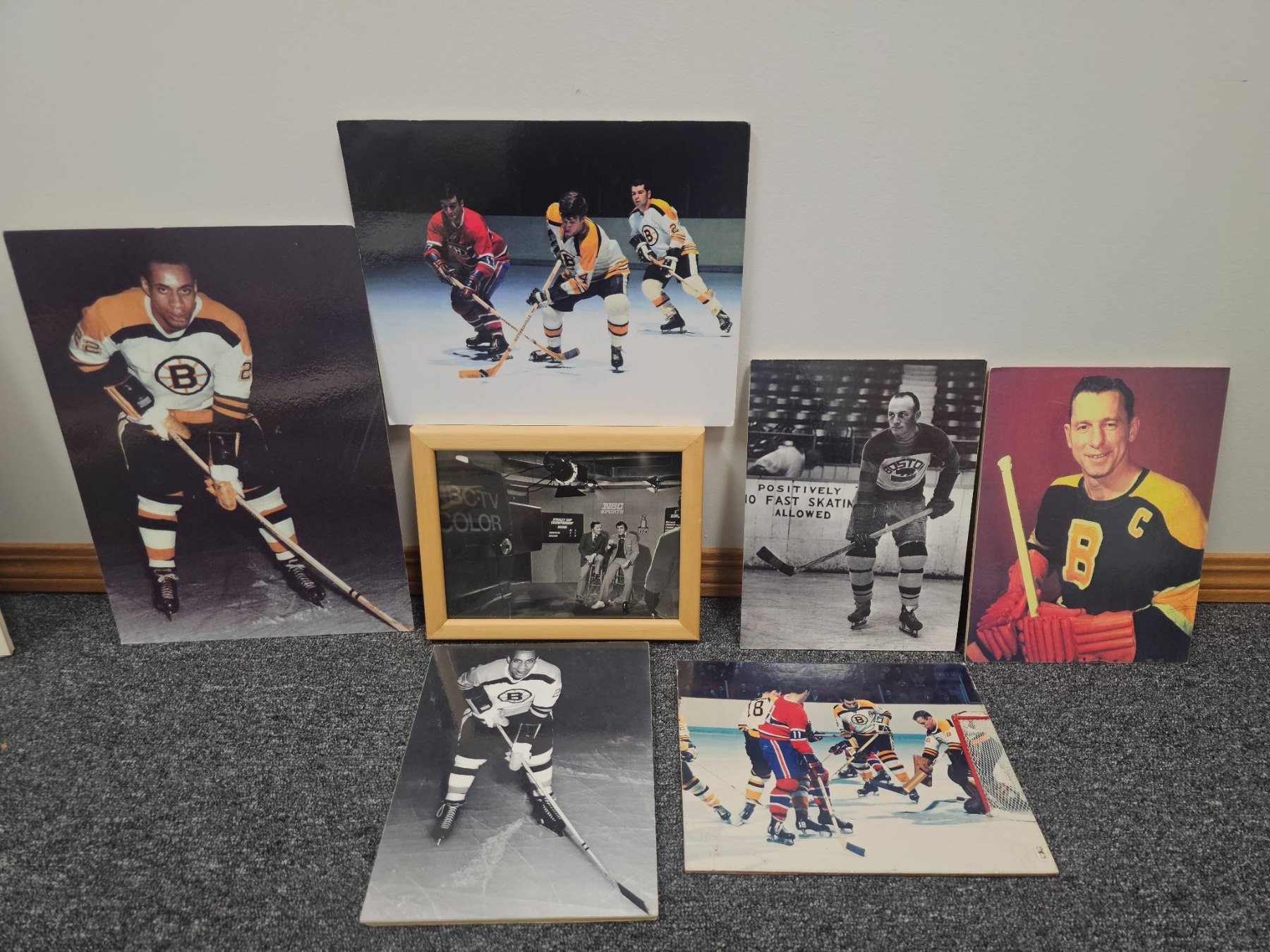 Comprehensive lot featuring seven Boston Bruins hockey-themed photographs, including a mix of color and black-and-white prints. Some depict legendary players in action, wearing iconic Bruins jerseys. Also includes a framed black-and-white team-related photograph. Ideal for hockey enthusiasts or Bruins memorabilia collectors. Condition varies; overall good presentation.