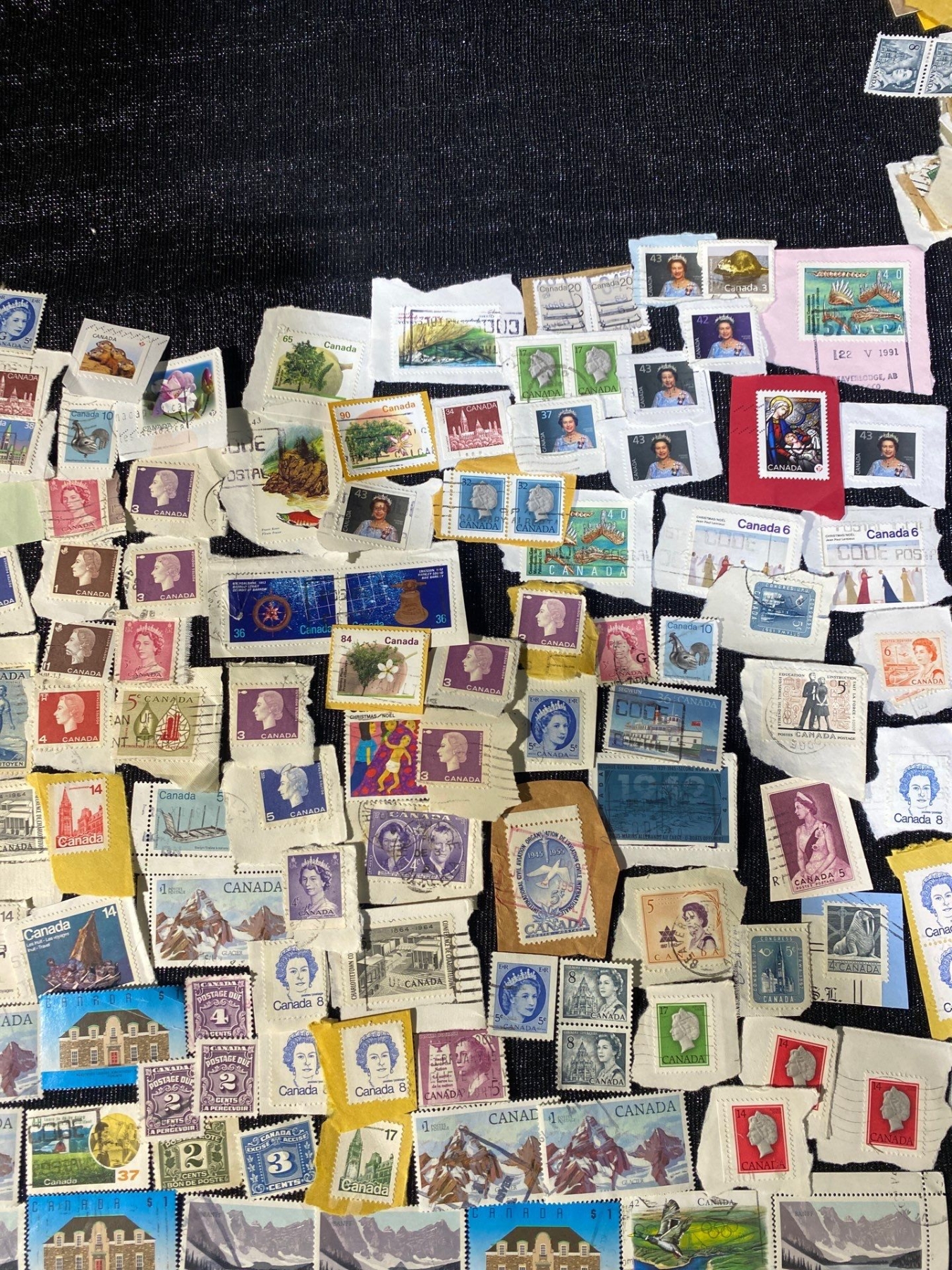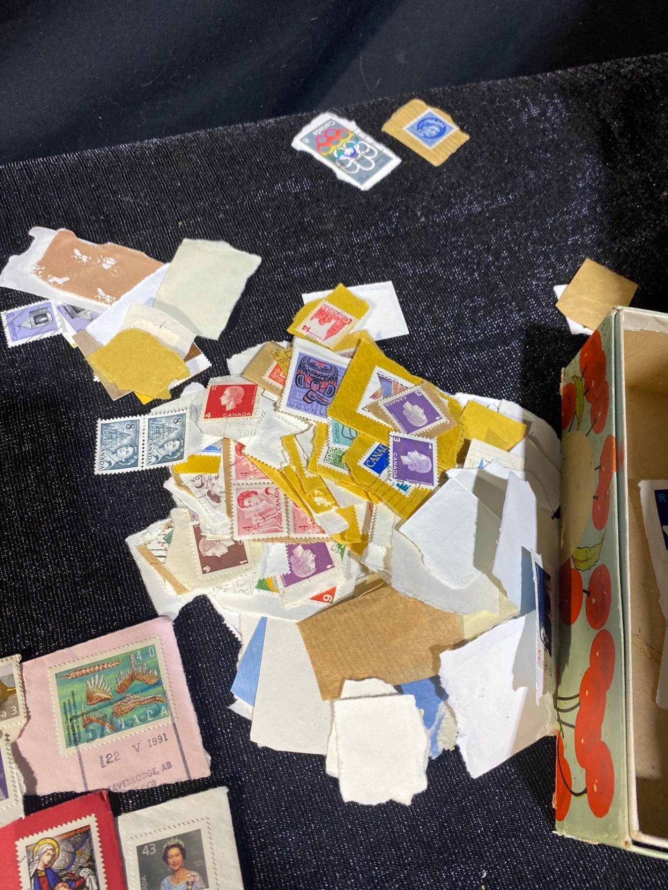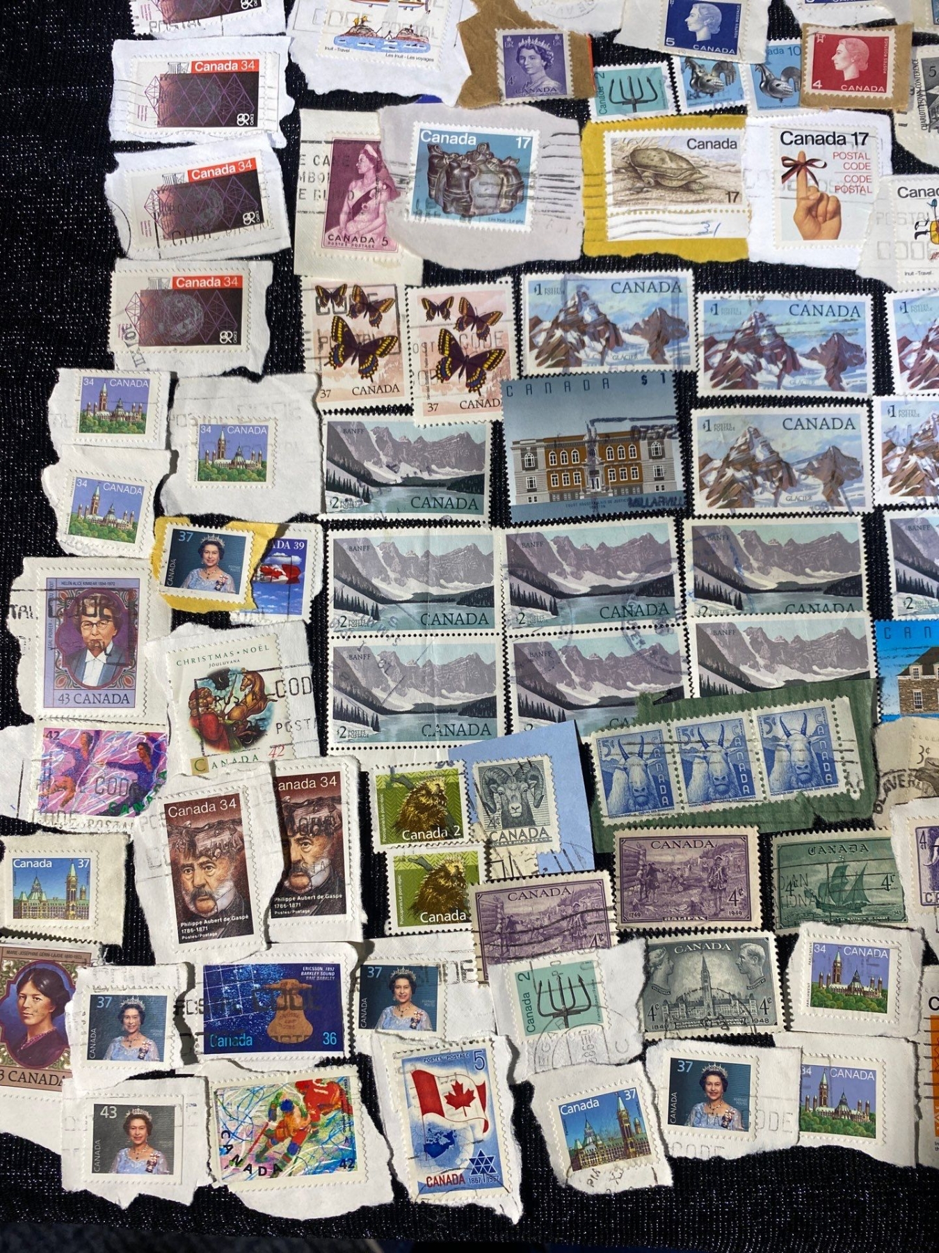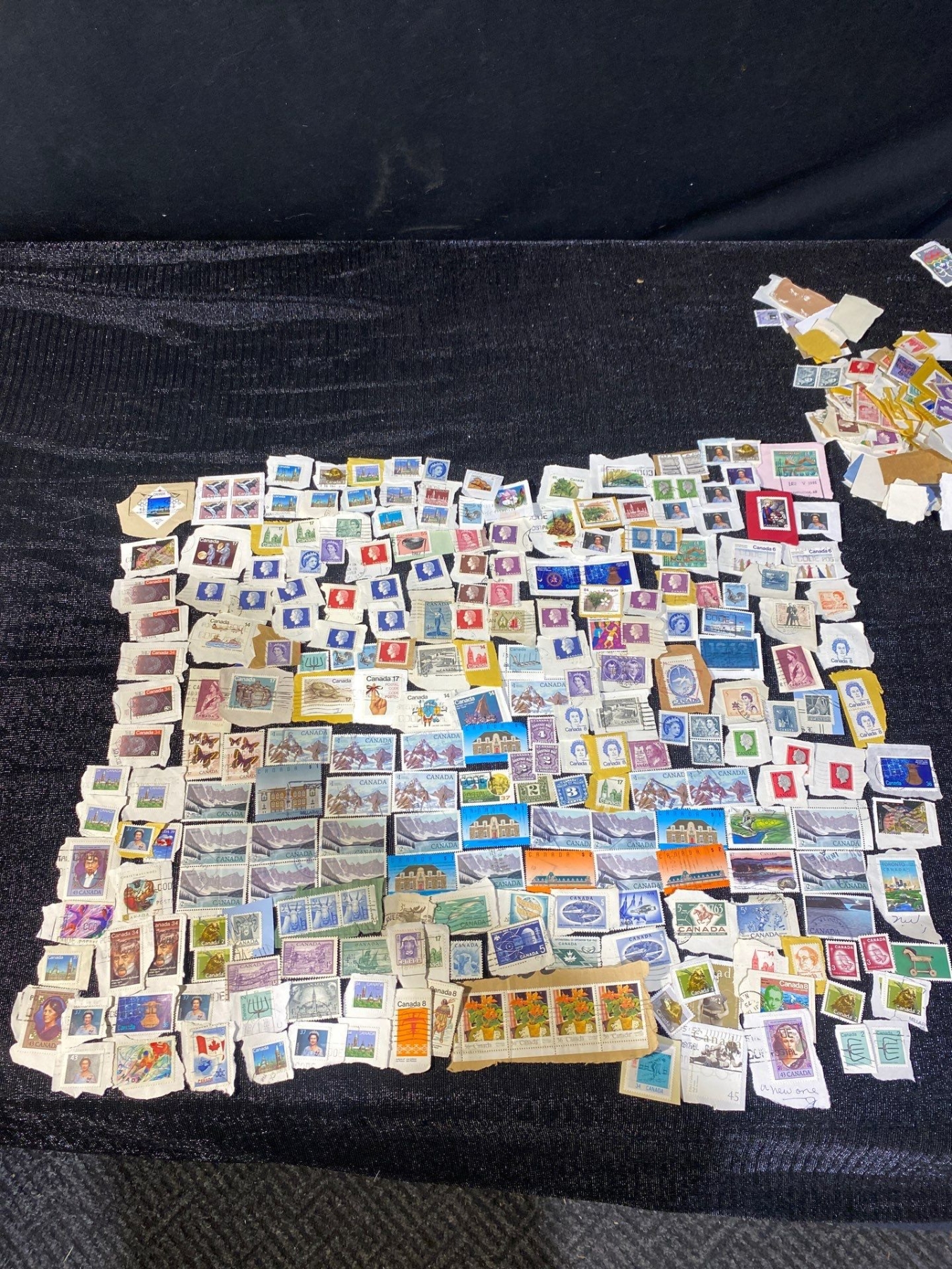A mixed accumulation of vintage Canadian postage stamps presented in a small box and tin. This group includes a variety of commemorative and definitive issues from multiple eras, reflecting notable themes, events, and personalities from Canada’s postal history. The lot contains both used and unused examples with condition ranging from fair to very good, typical of estate-sourced collections. An excellent opportunity for collectors to sort, organize, and hunt for better pieces, cancellations, and potential surprises.