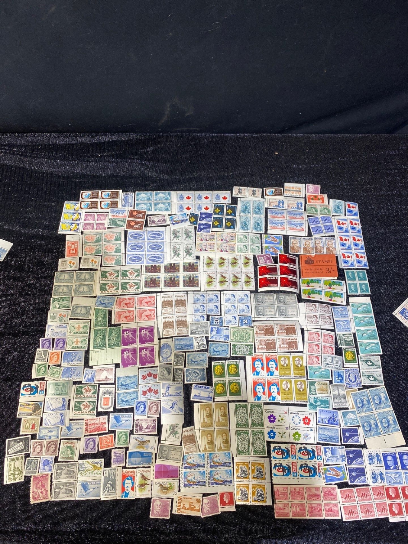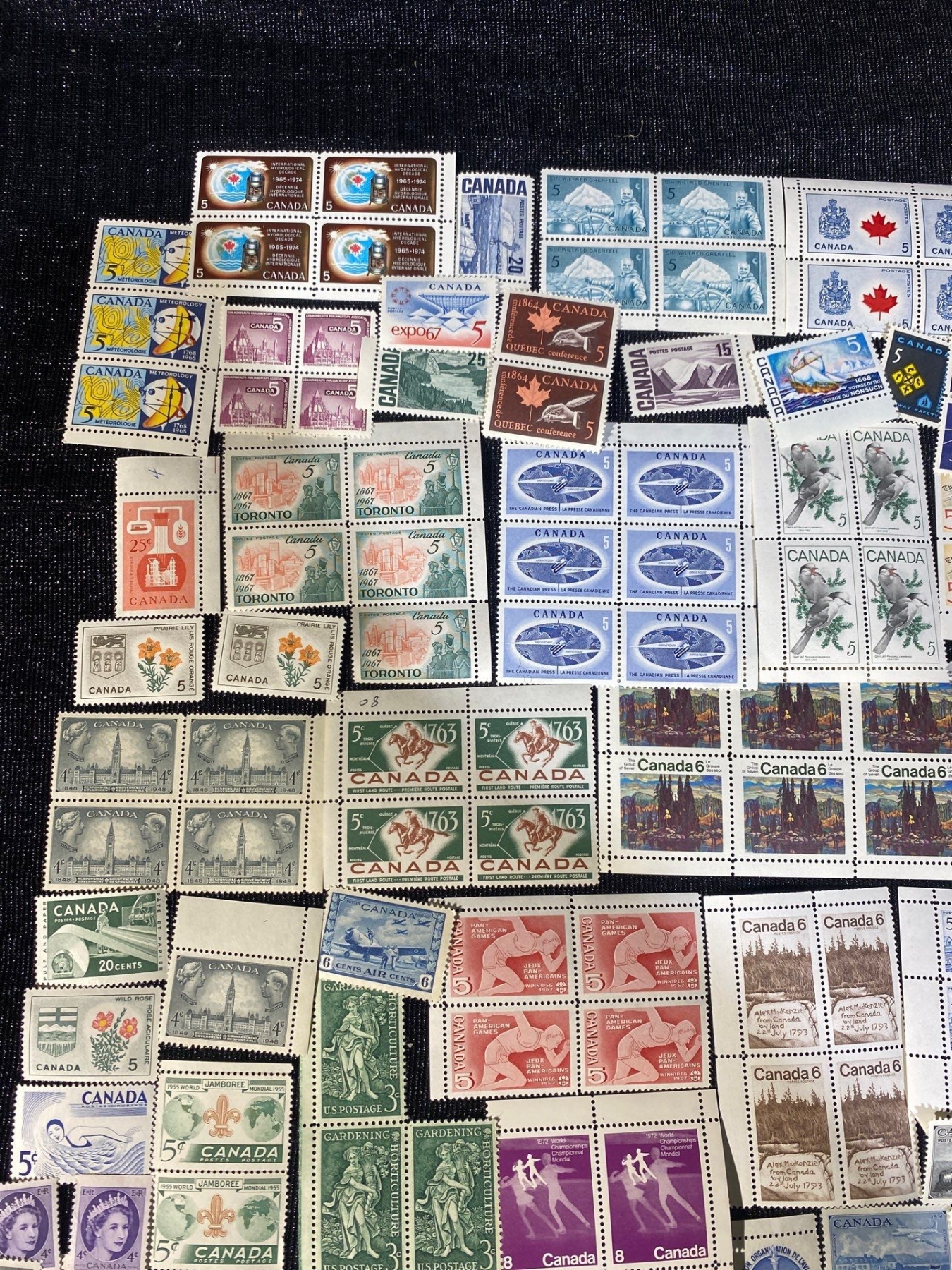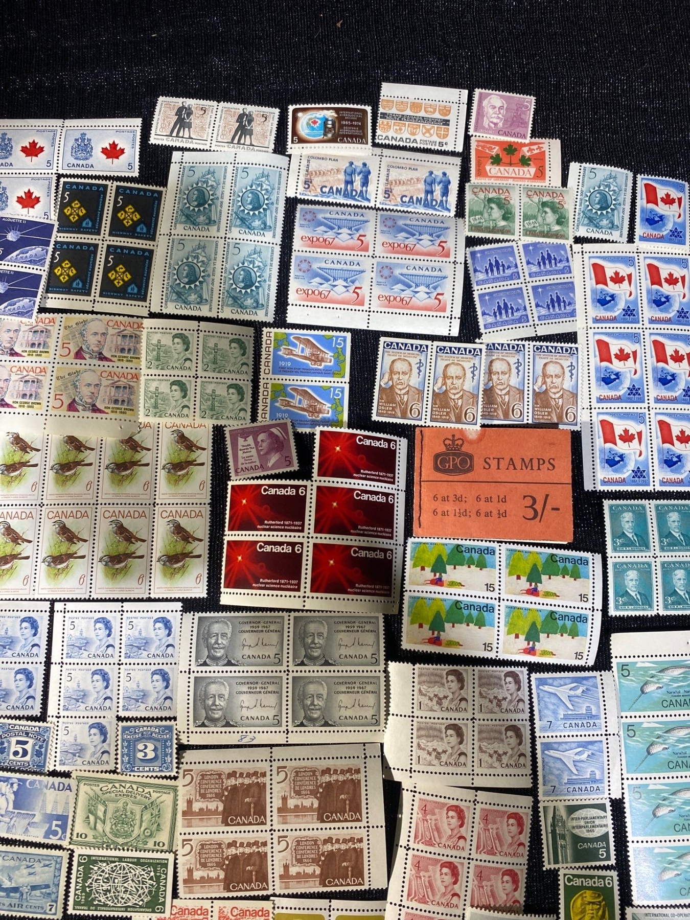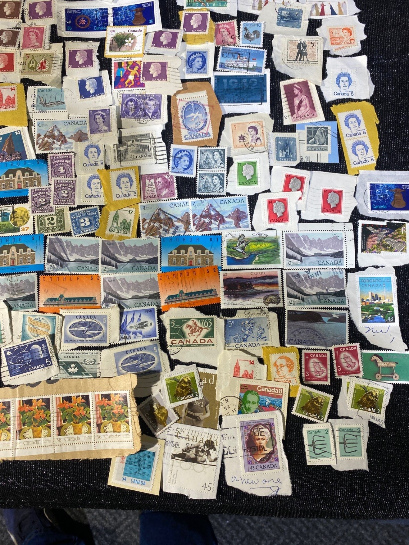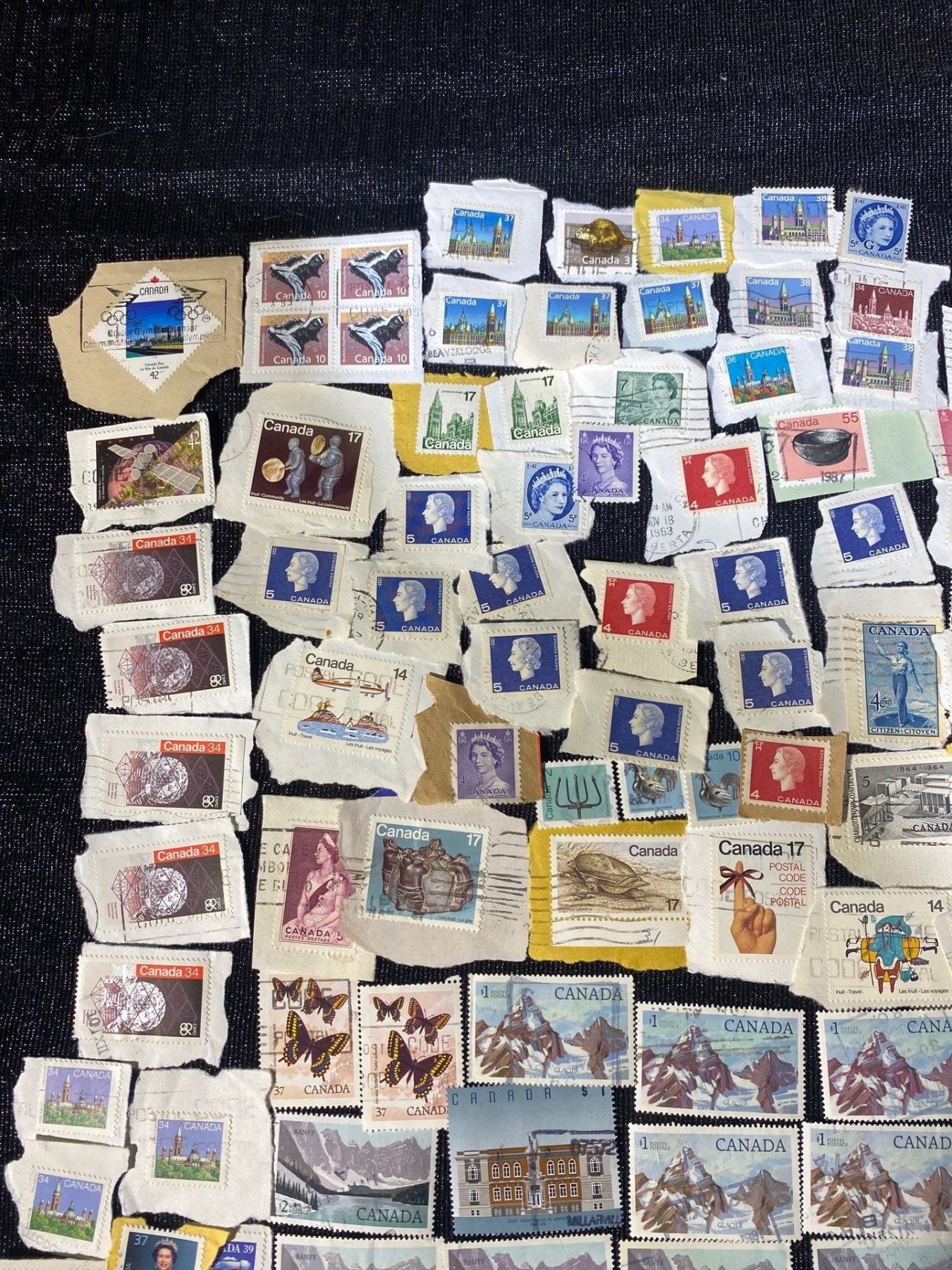 A mixed accumulation of vintage Canadian postage stamps presented in a small box and tin. This group includes a variety of commemorative and definitive issues from multiple eras, reflecting notable themes, events, and personalities from Canada’s postal history. The lot contains both used and unused examples with condition ranging from fair to very good, typical of estate-sourced collections. An excellent opportunity for collectors to sort, organize, and hunt for better pieces, cancellations, and potential surprises.
