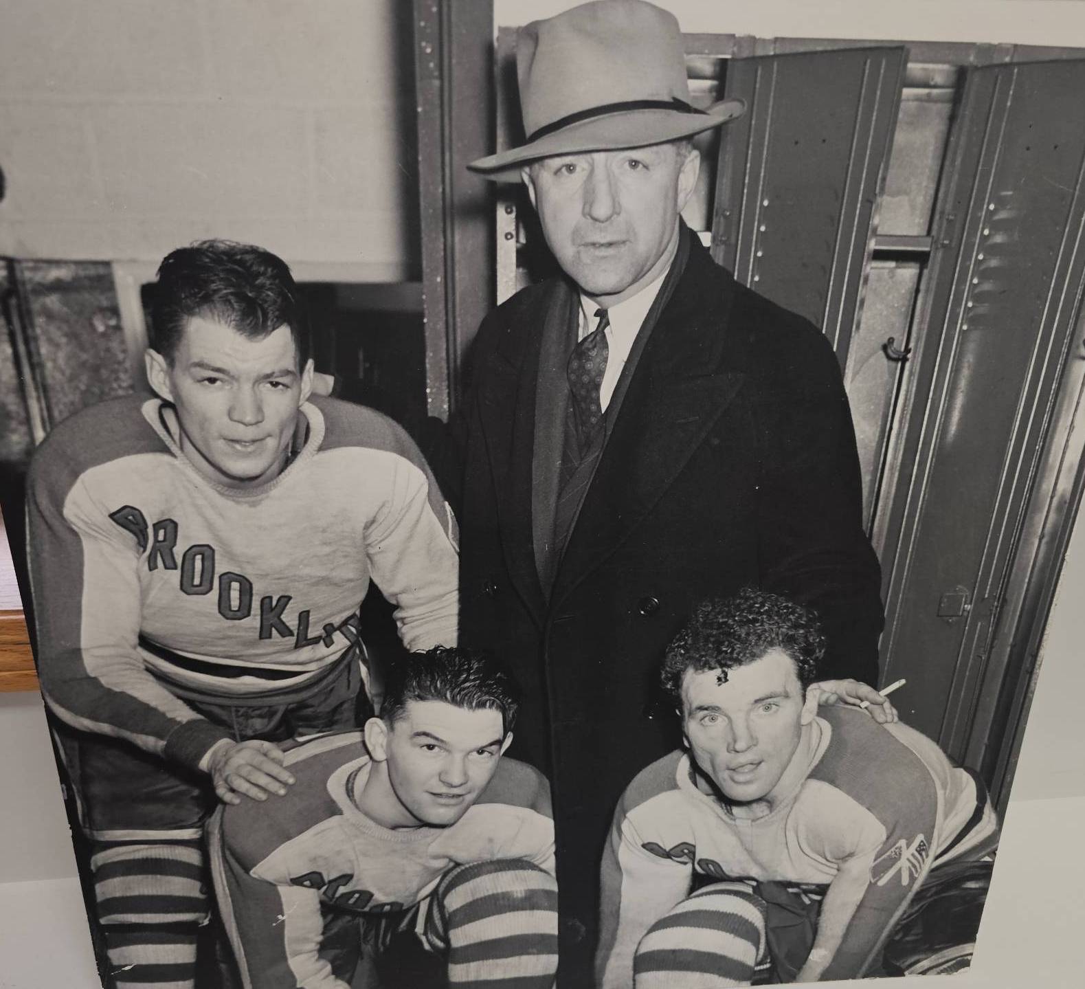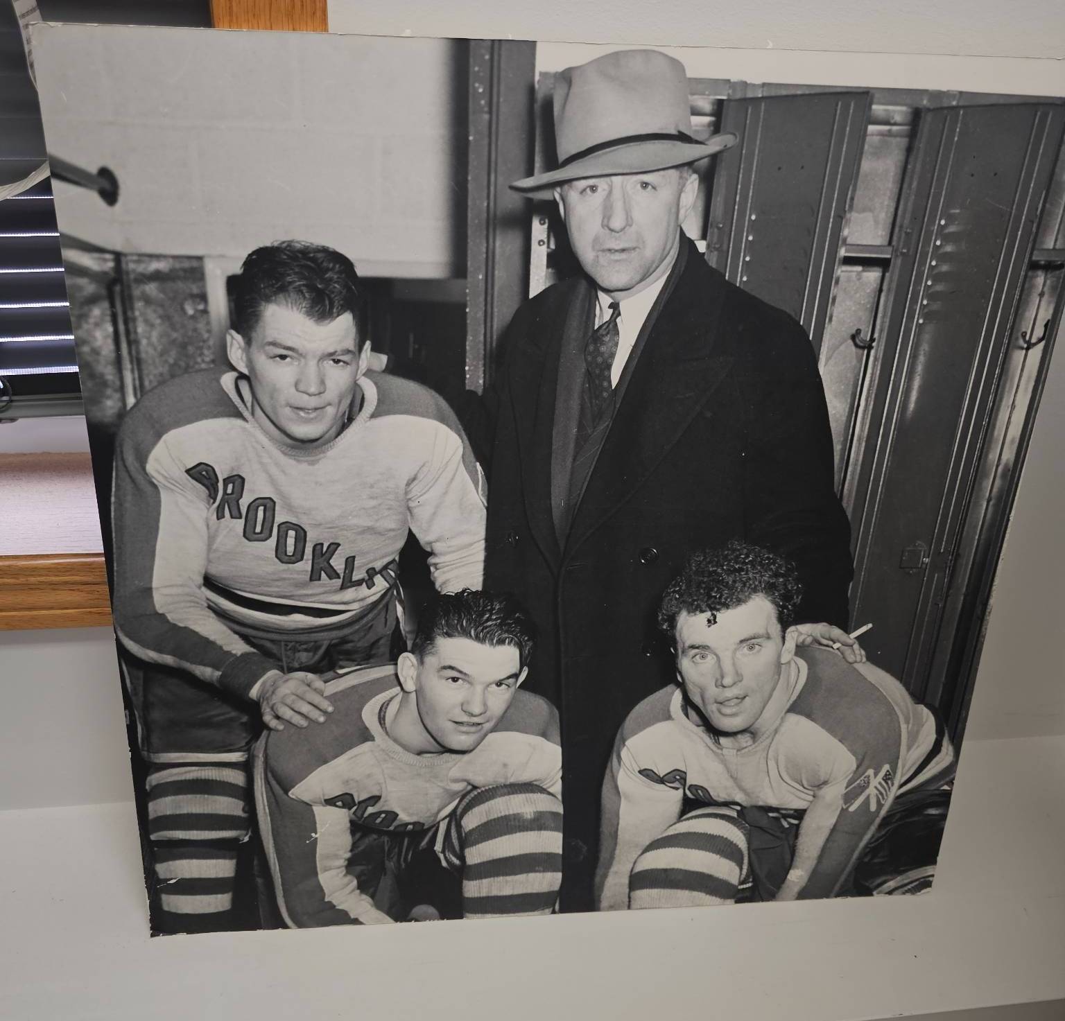 Black and white photograph featuring a Brooklyn sports team, showcasing three players in striped jerseys and an individual in formal attire. The image measures 21x22", making it an ideal size for display. Likely a historical piece, capturing a moment in sports history.