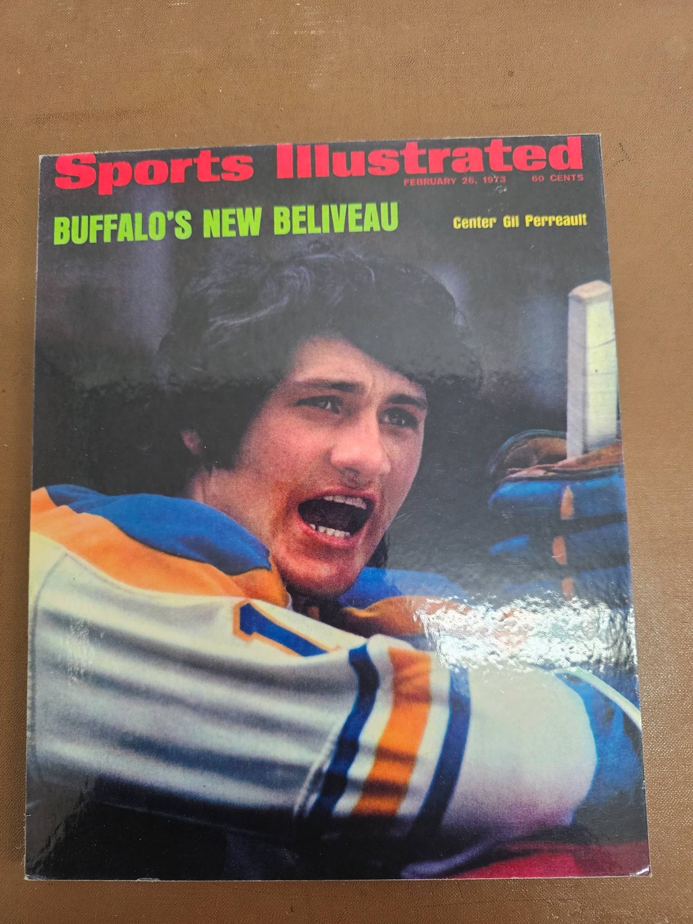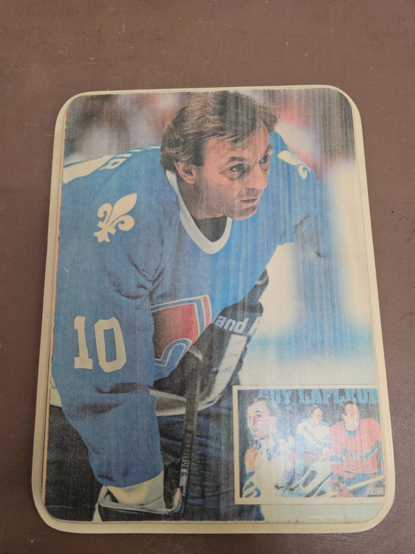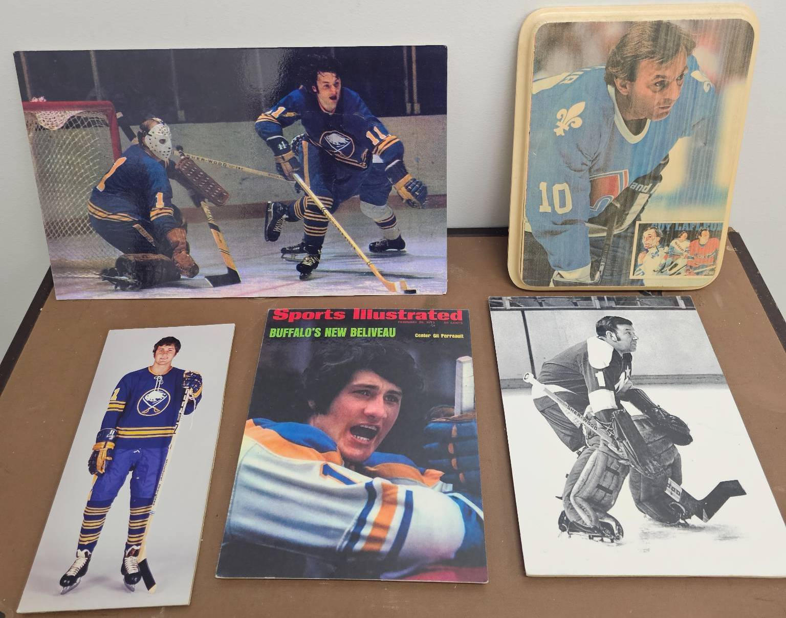 Vintage hockey memorabilia, including multiple full-color and black-and-white photographs showcasing players in action and poses, as well as a Sports Illustrated magazine issue headlined Buffalo's New Beliveau. Among the items is a wood-mounted image of a player in a Quebec Nordiques jersey. Ideal for fans or collectors of hockey history.