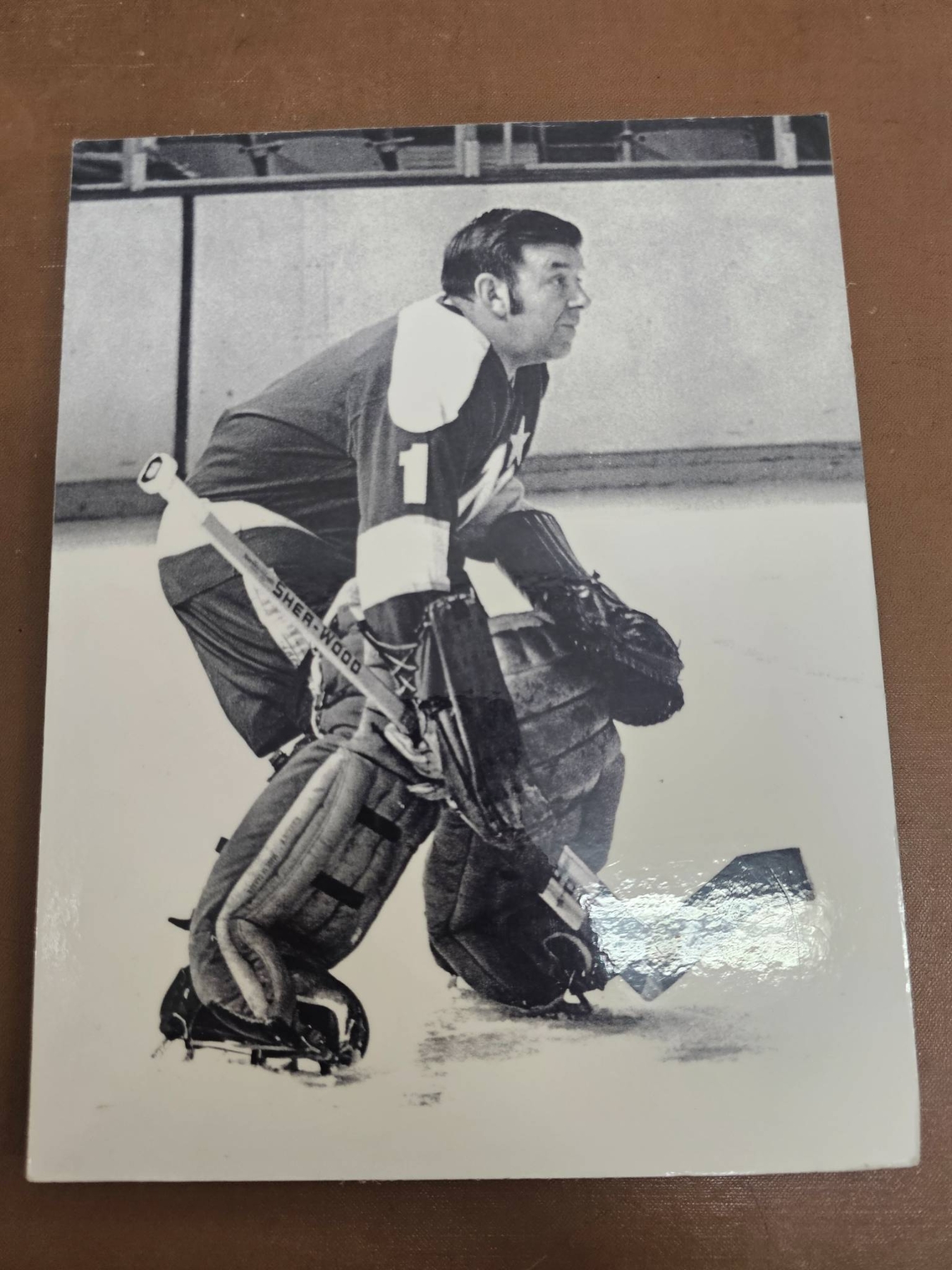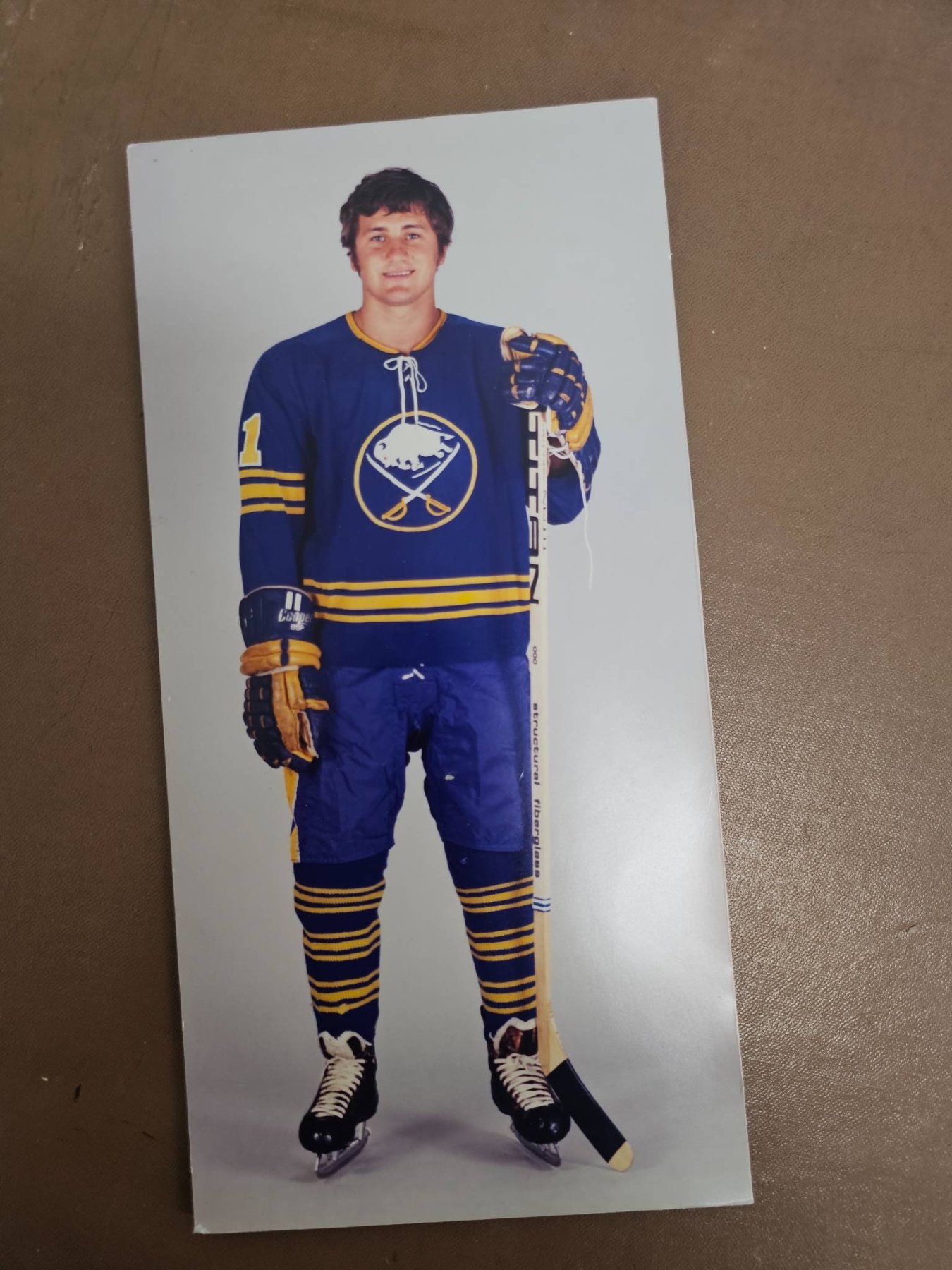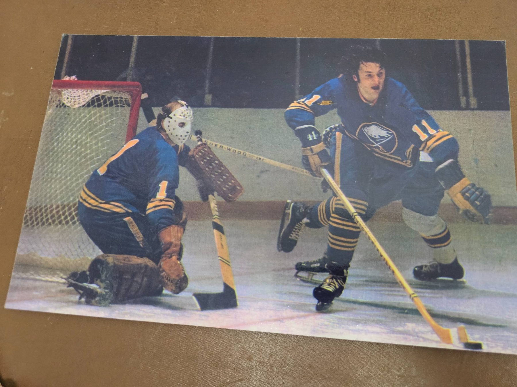 Vintage hockey memorabilia, including multiple full-color and black-and-white photographs showcasing players in action and poses, as well as a Sports Illustrated magazine issue headlined Buffalo's New Beliveau. Among the items is a wood-mounted image of a player in a Quebec Nordiques jersey. Ideal for fans or collectors of hockey history.