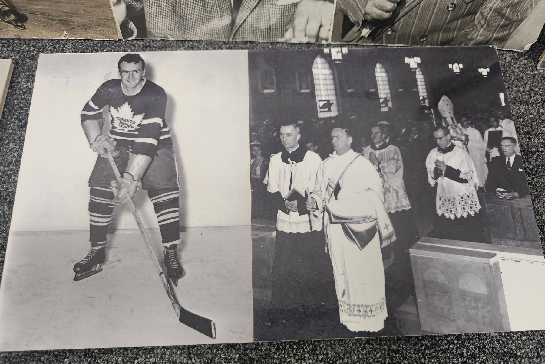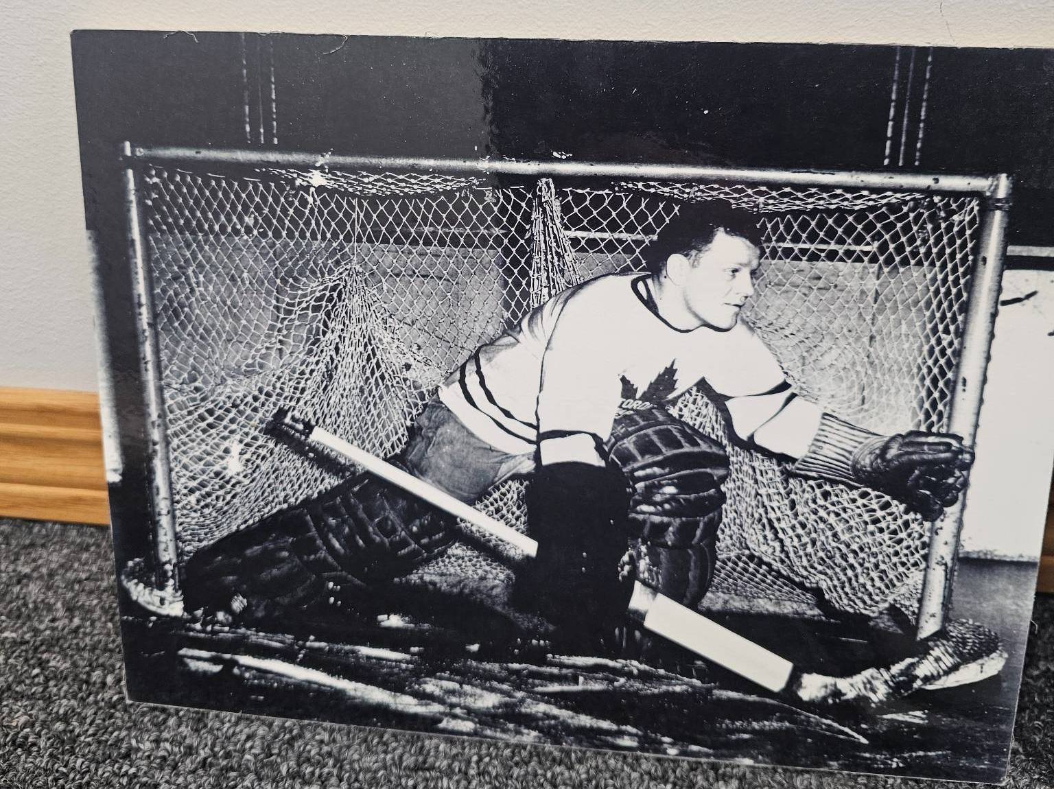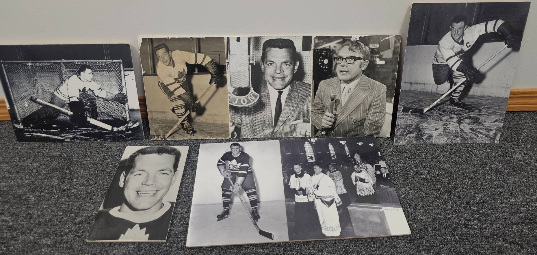 Seven vintage black-and-white photographs showcasing Canadian hockey legends, including images of players in action, portraits, and ceremonial moments. These photographs, printed on sturdy medium, are a nostalgic tribute to hockey's history in Canada. Some photos include handwritten identification or context on the back. Condition is consistent with age.
