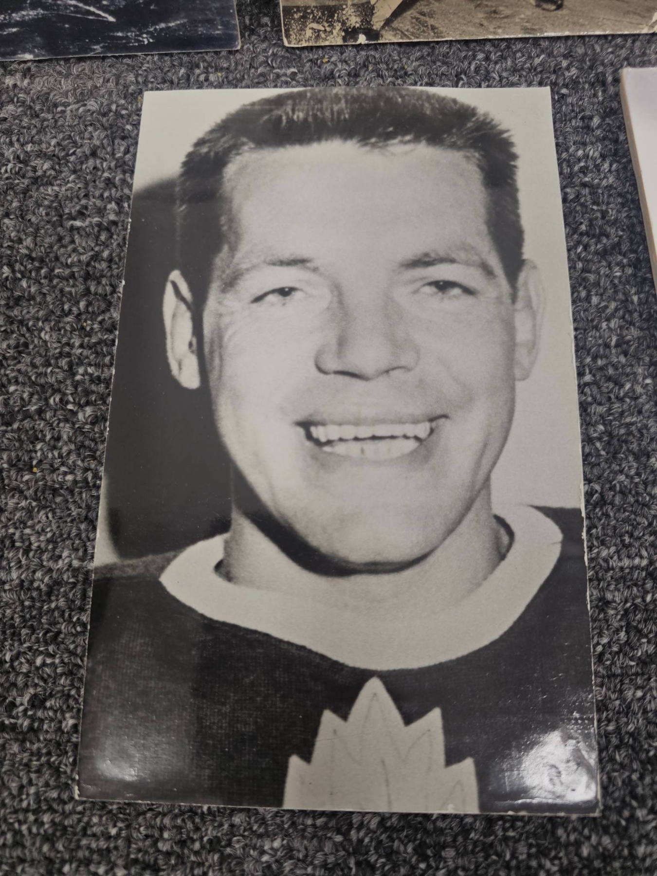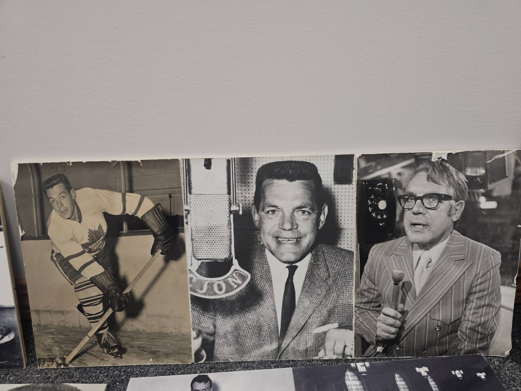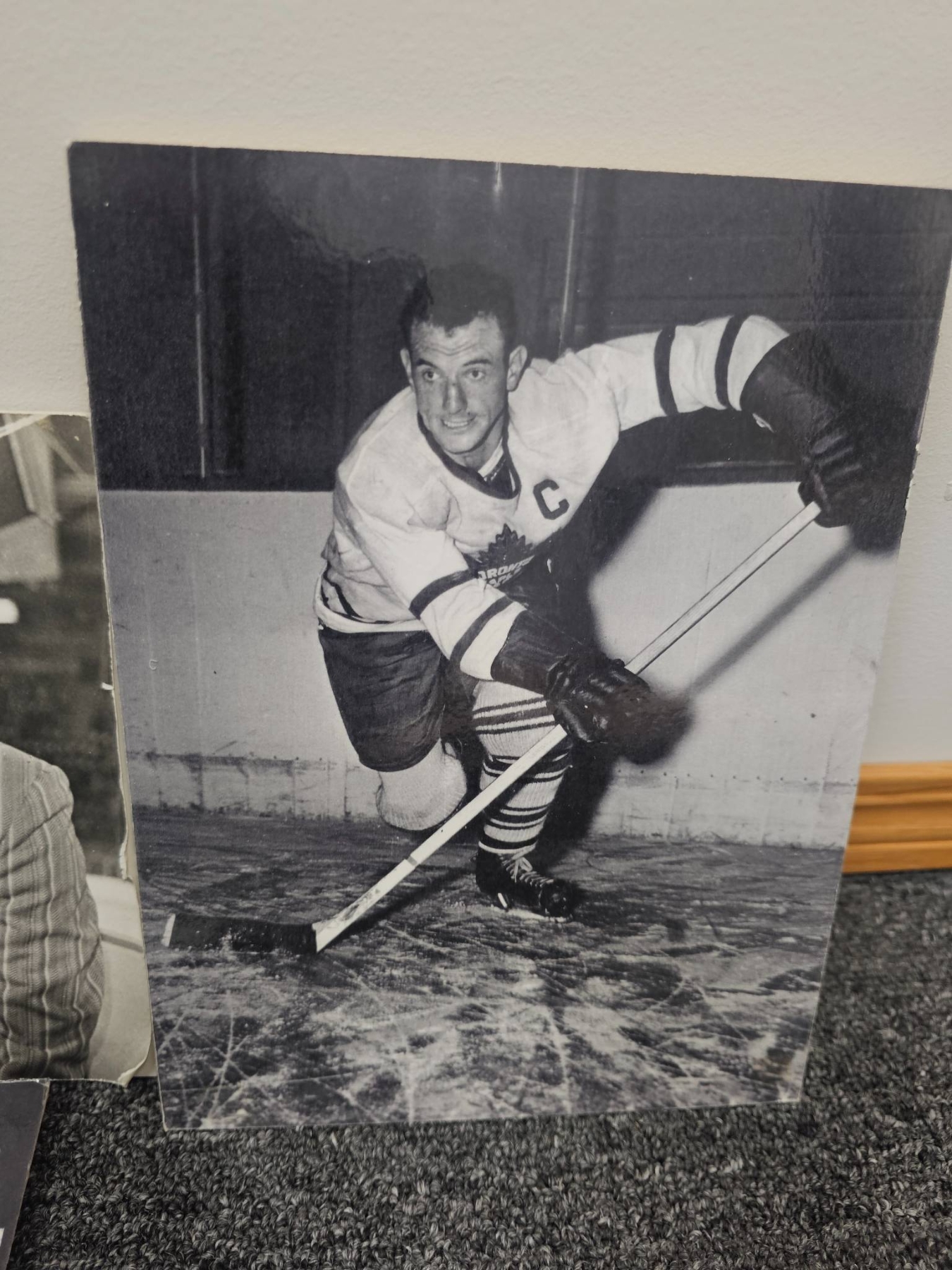 Seven vintage black-and-white photographs showcasing Canadian hockey legends, including images of players in action, portraits, and ceremonial moments. These photographs, printed on sturdy medium, are a nostalgic tribute to hockey's history in Canada. Some photos include handwritten identification or context on the back. Condition is consistent with age.