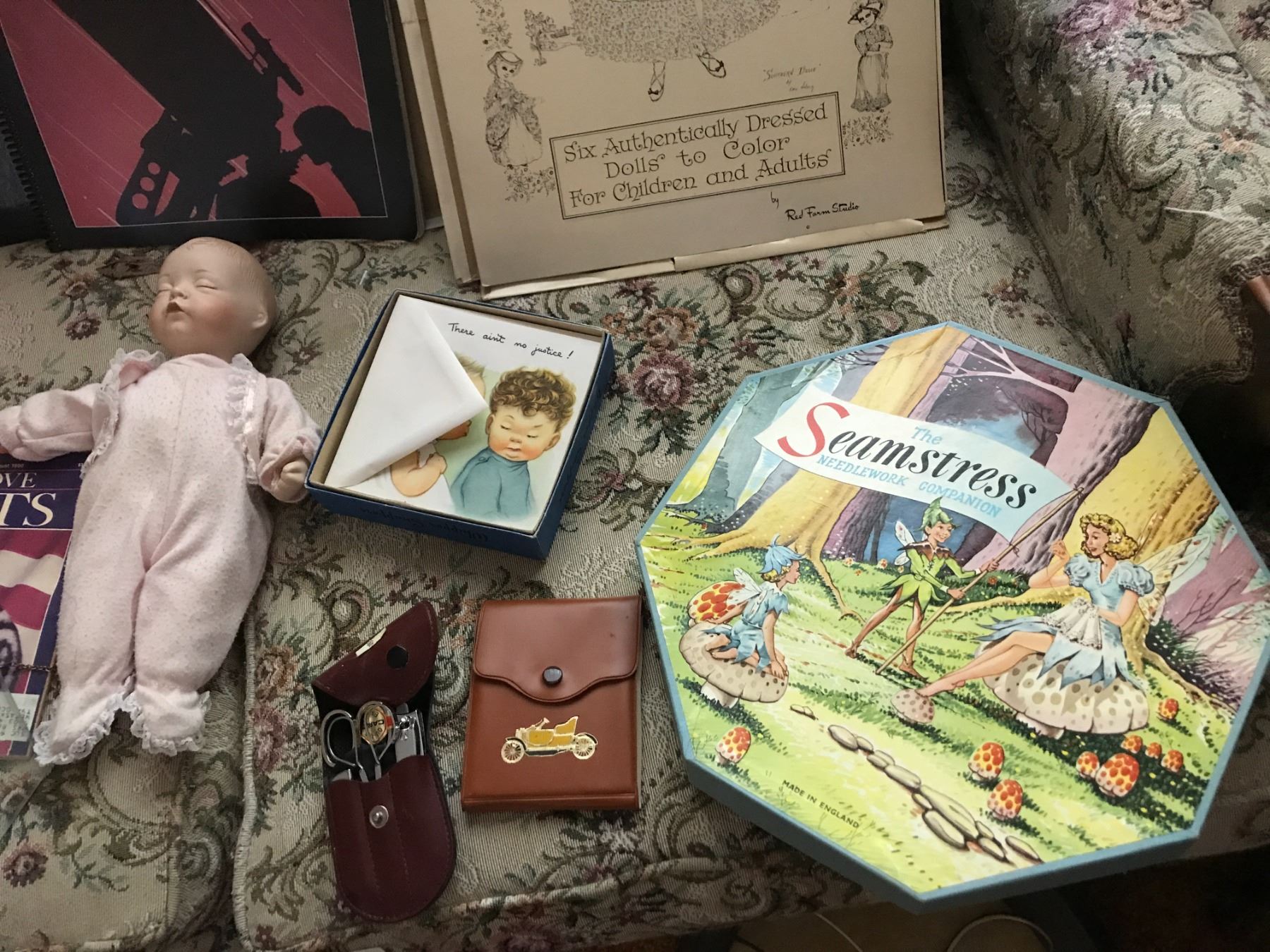 Vintage Ceiling Light, Placemats, Baby Doll, Heritage Doll Coloring Book, Asst Books/Cards Etc
