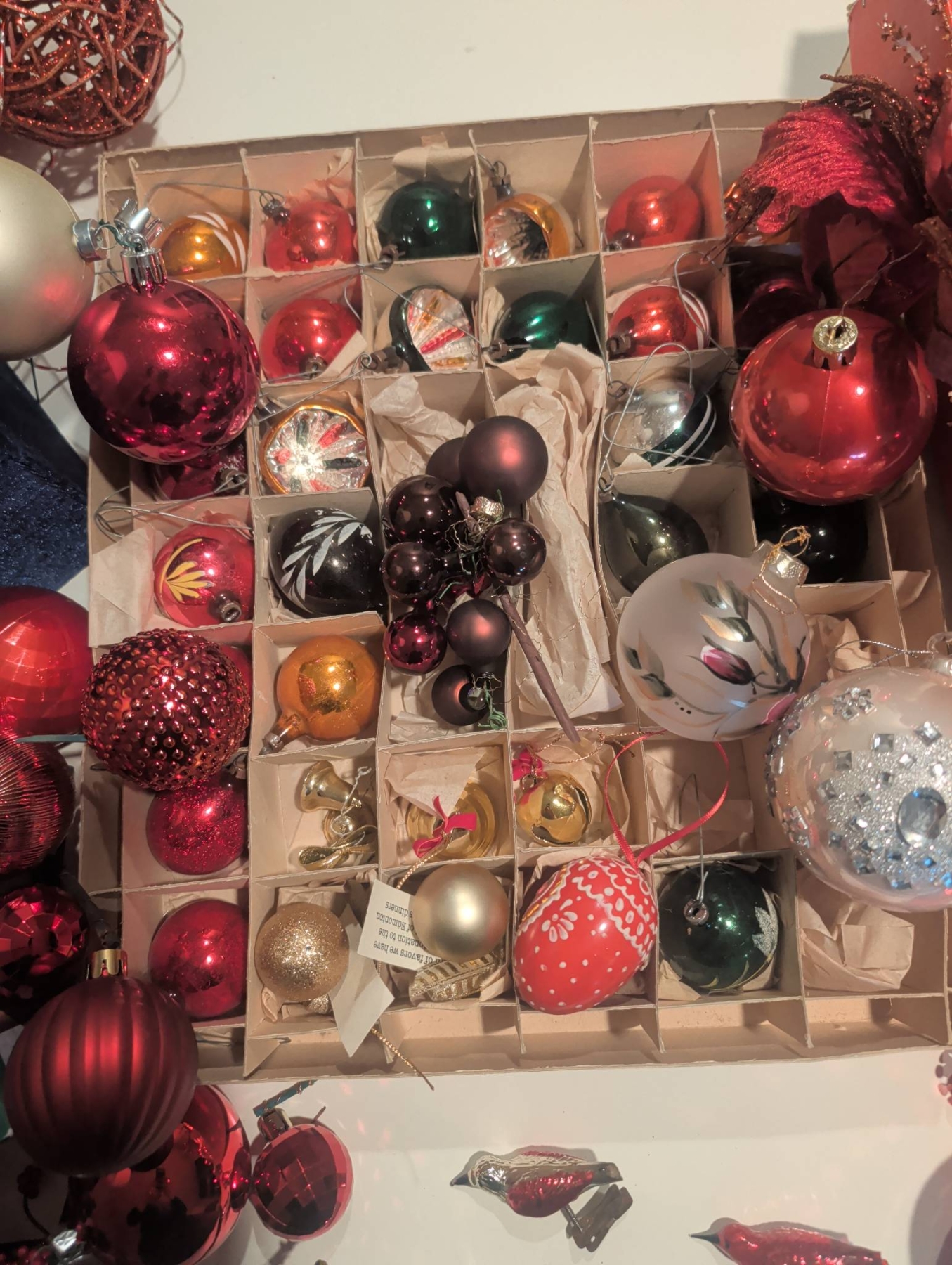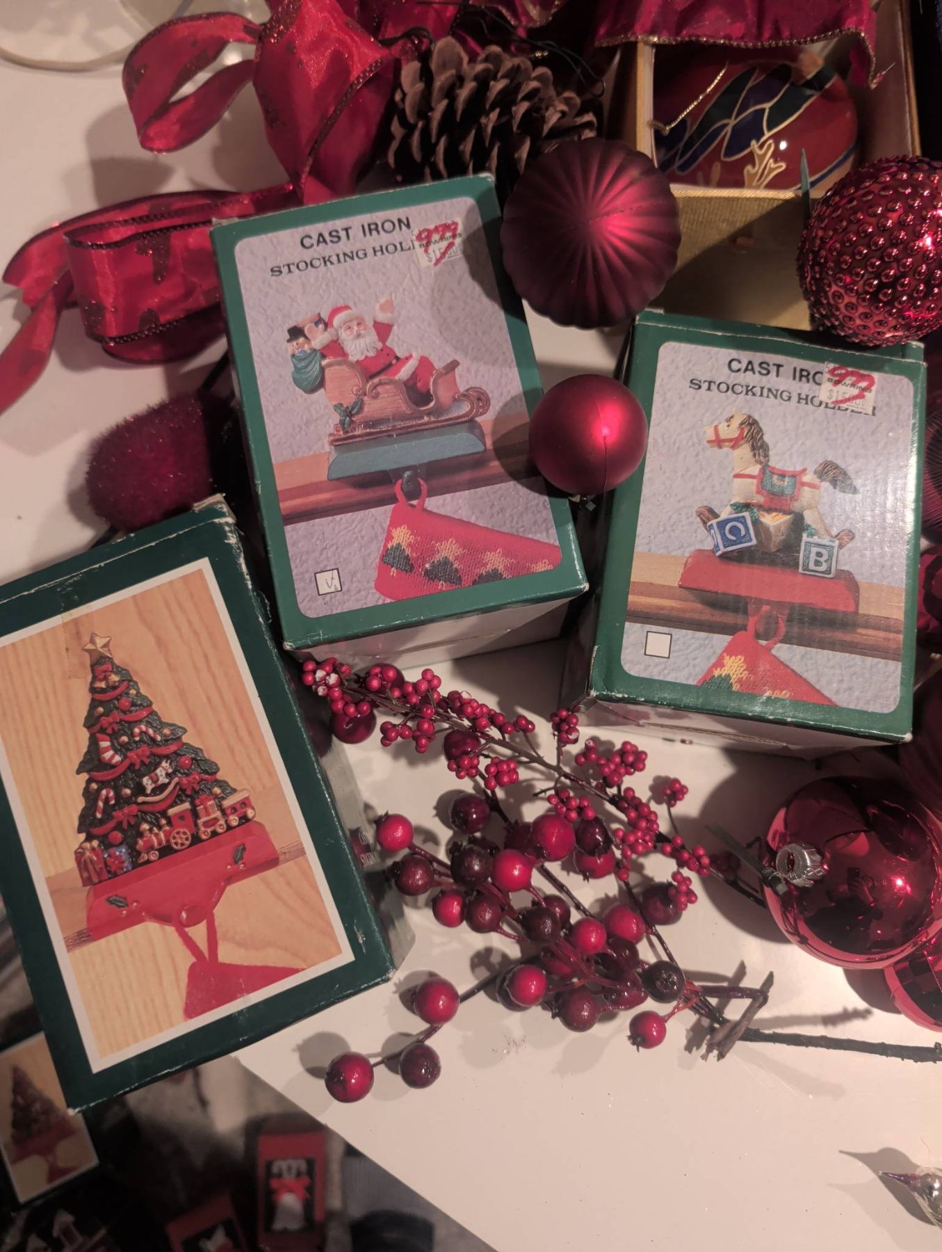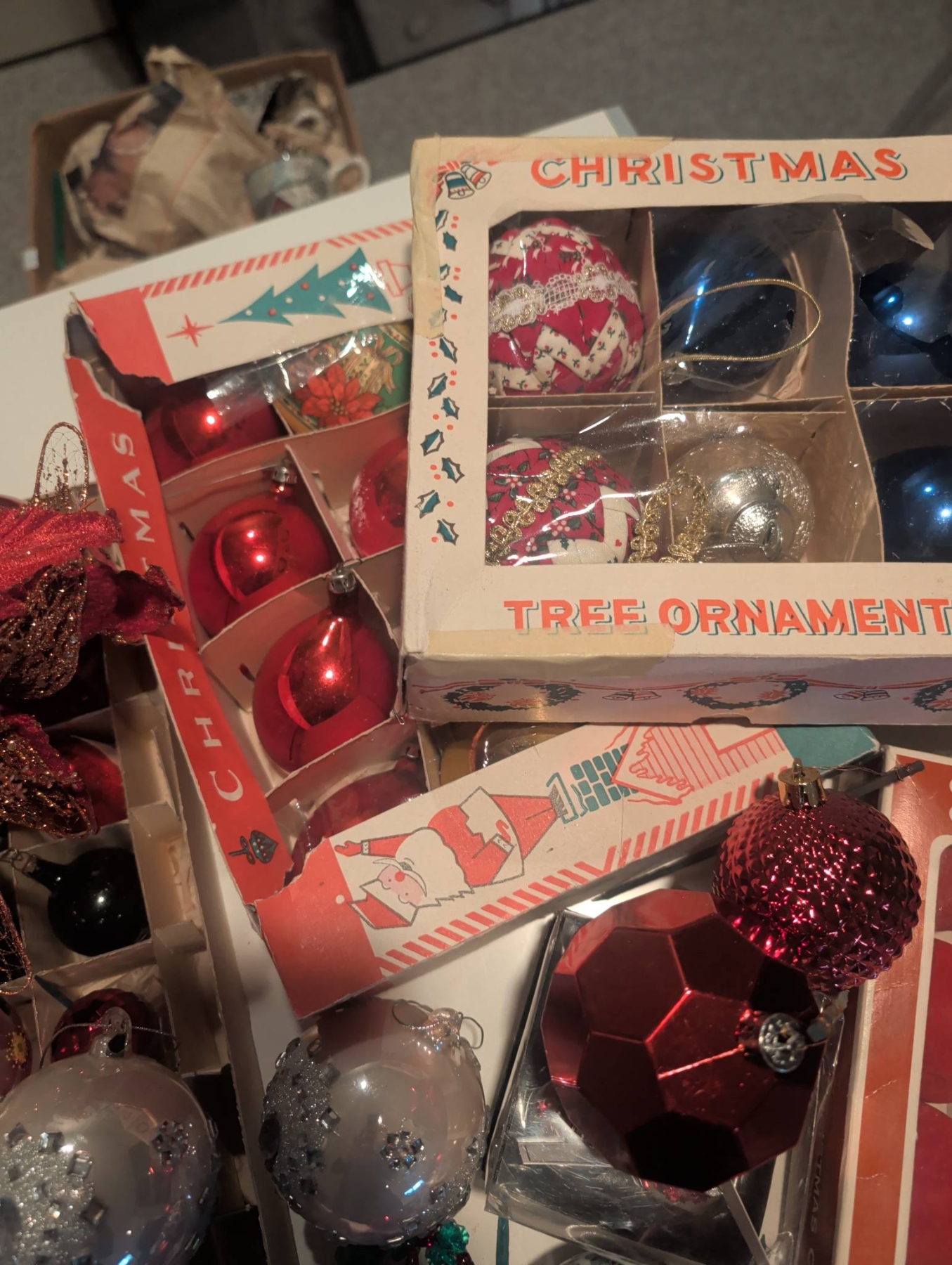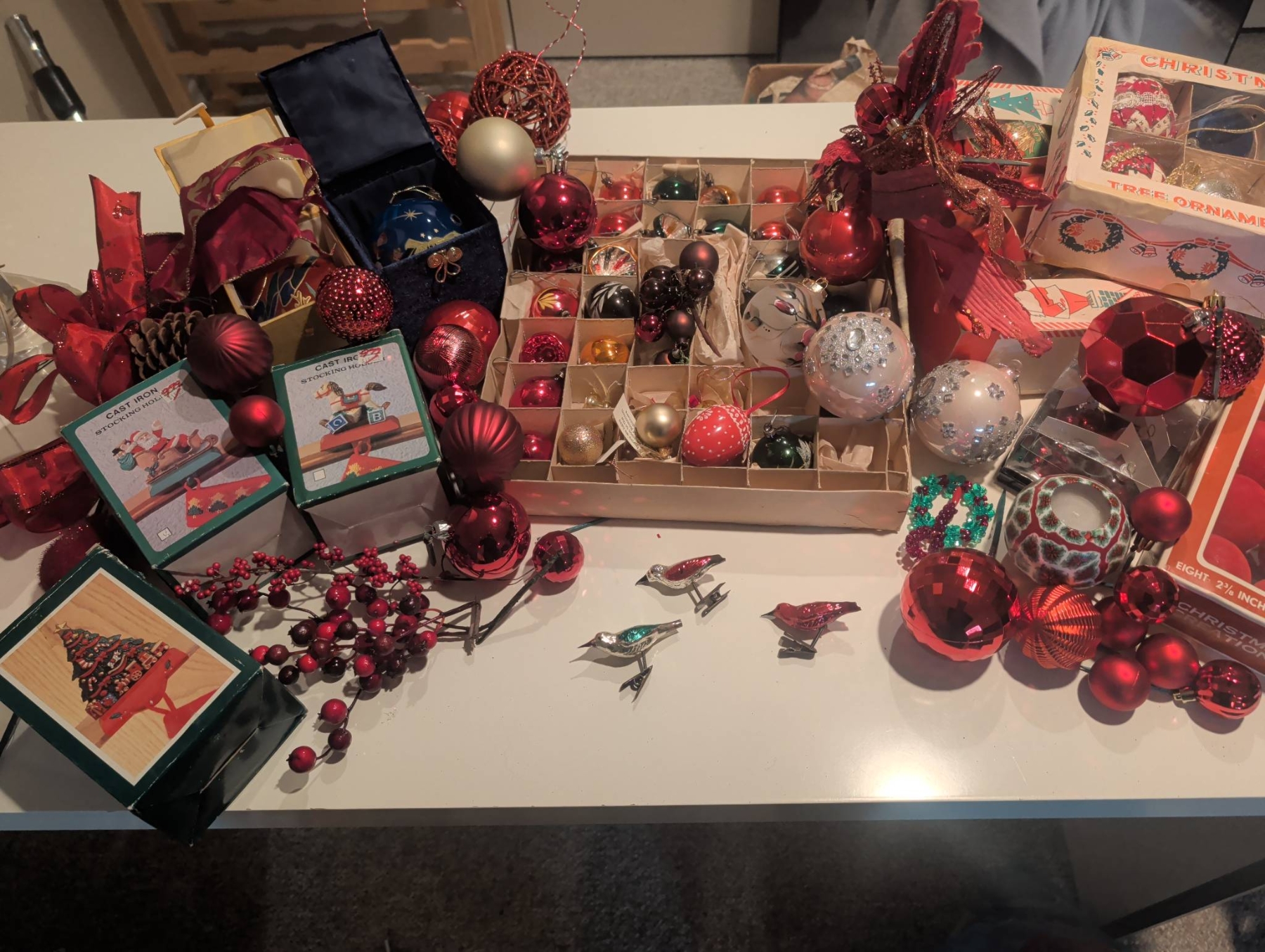 A diverse assortment of Christmas ornaments and seasonal decorations. Includes vintage-style glass baubles, painted ornaments (approx. 3 inches in diameter), clip-on bird ornaments (approx. 4 inches long), decorative cast iron stocking holders, and boxed sets of ornaments. Several items come in their original packaging or decorative boxes. Some pieces show wear consistent with age. Lot dimensions: the largest box is approx. 16in x 12in x 3in.