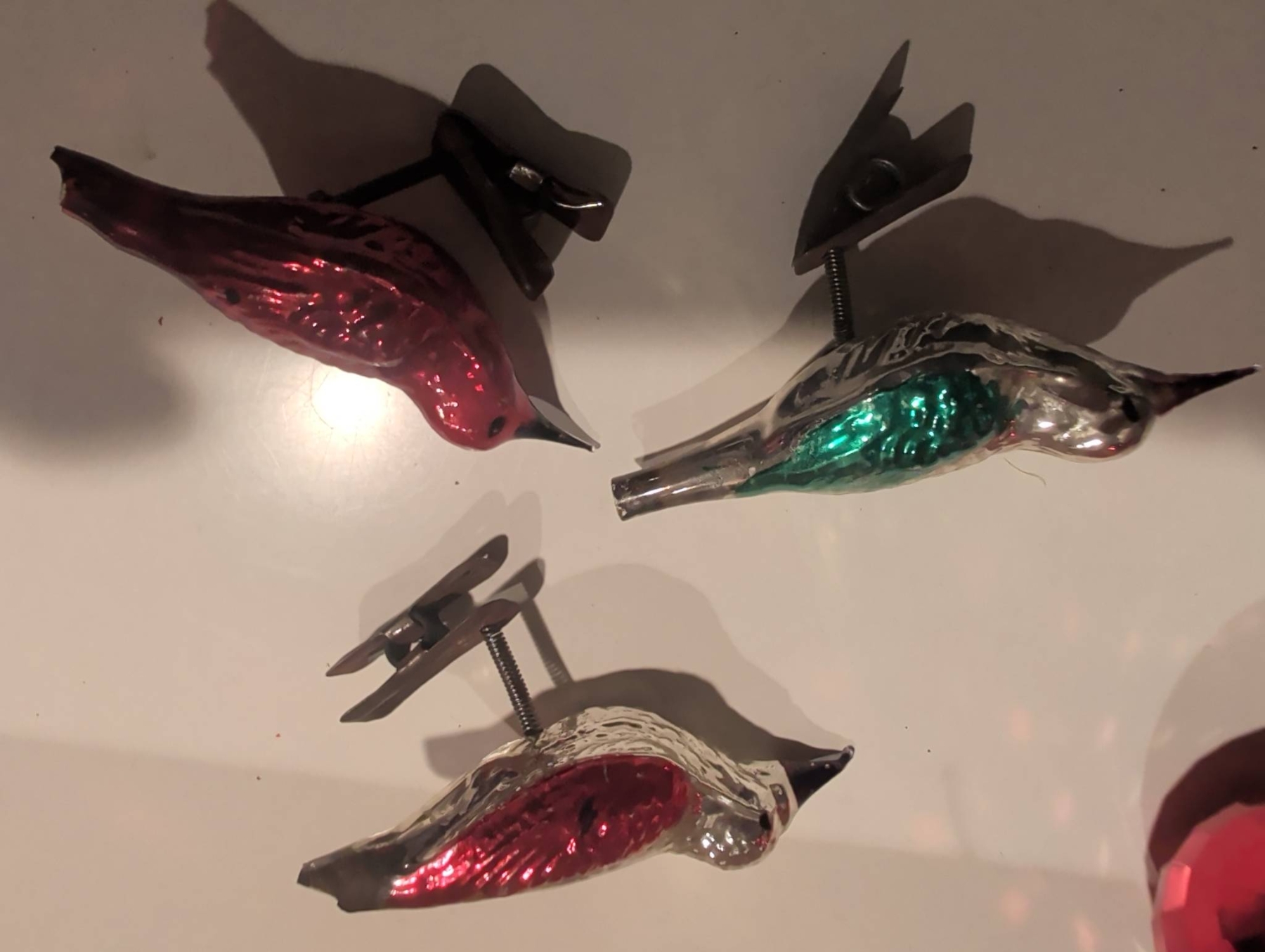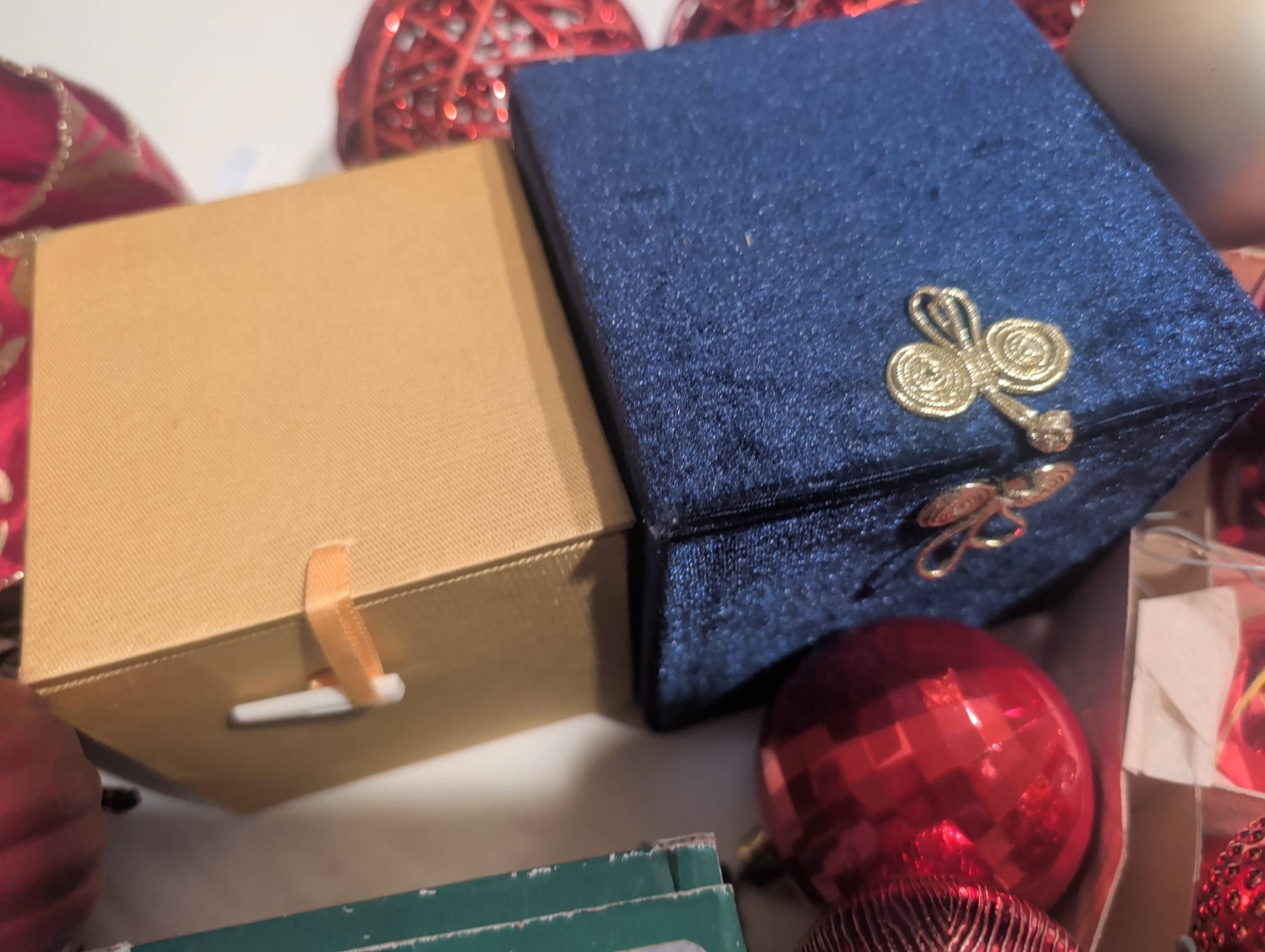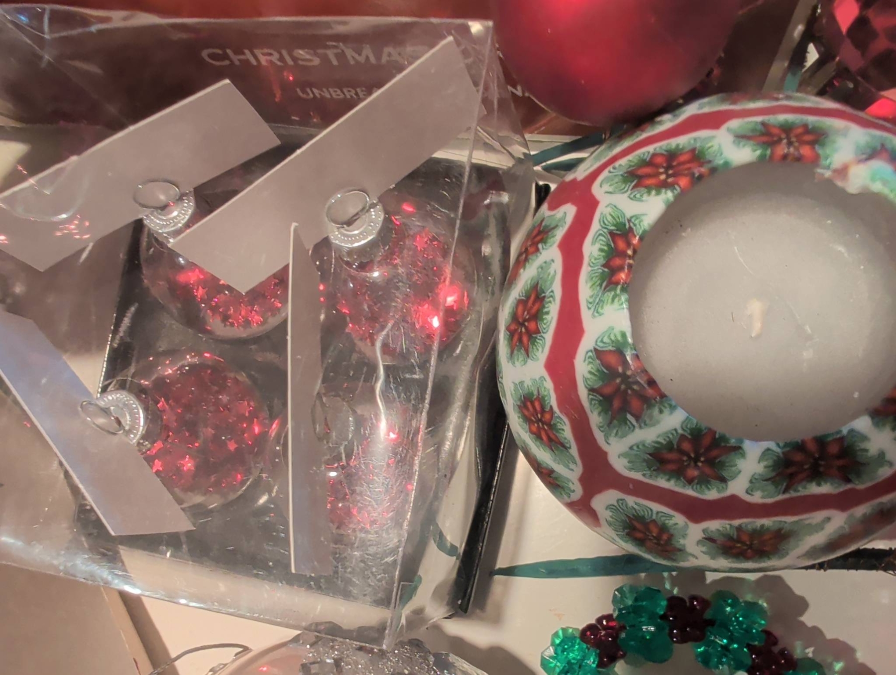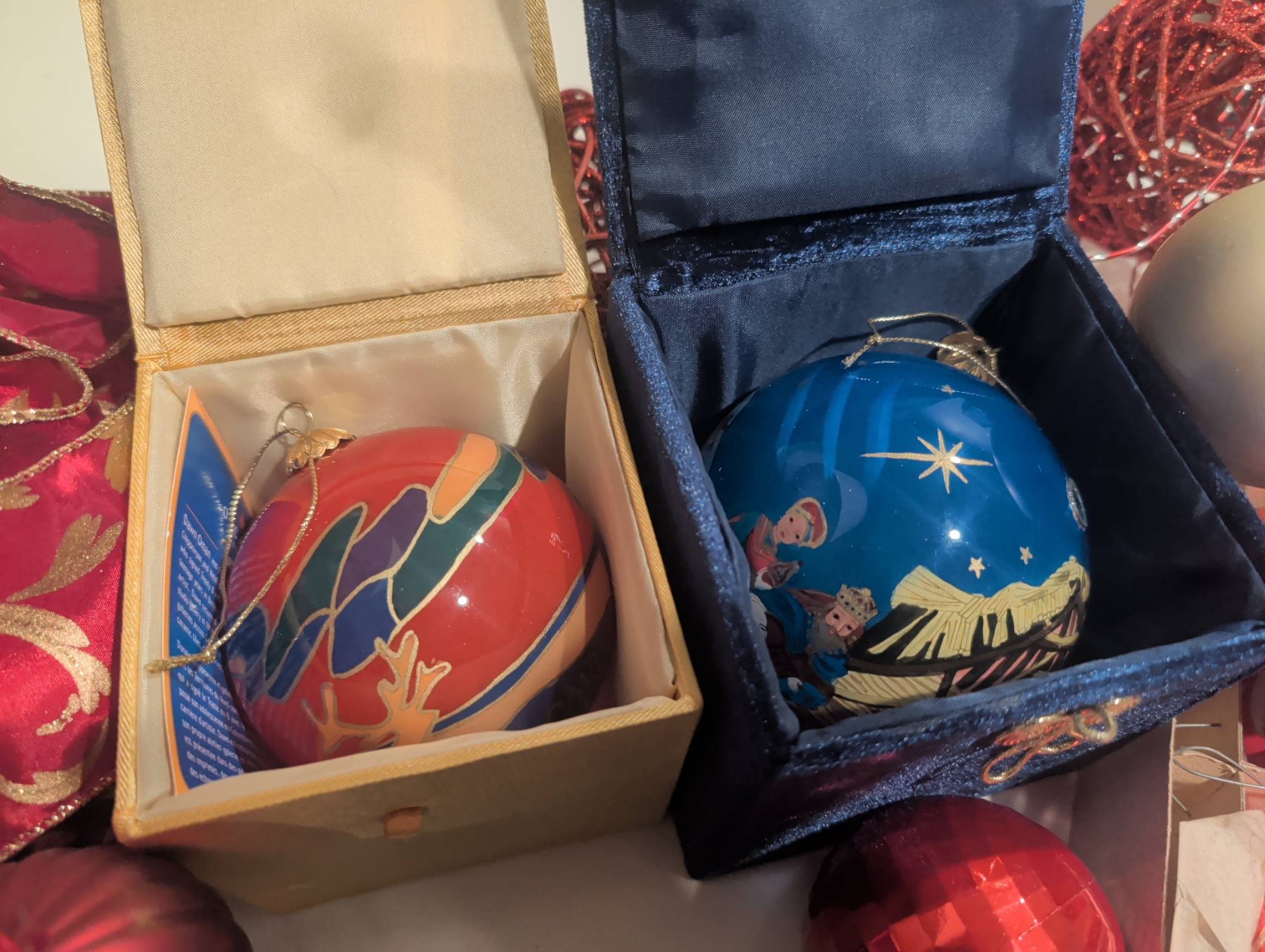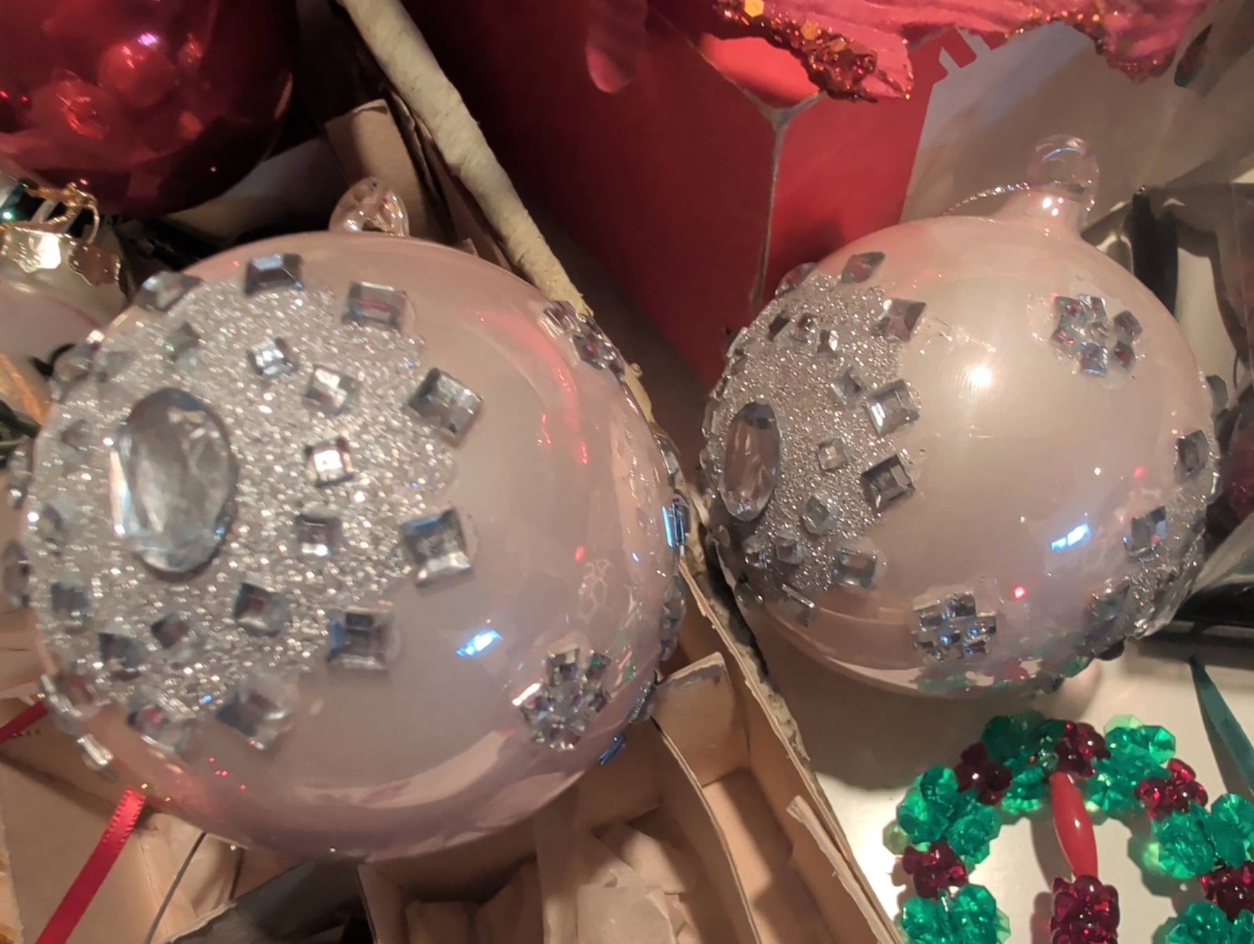 A diverse assortment of Christmas ornaments and seasonal decorations. Includes vintage-style glass baubles, painted ornaments (approx. 3 inches in diameter), clip-on bird ornaments (approx. 4 inches long), decorative cast iron stocking holders, and boxed sets of ornaments. Several items come in their original packaging or decorative boxes. Some pieces show wear consistent with age. Lot dimensions: the largest box is approx. 16in x 12in x 3in.