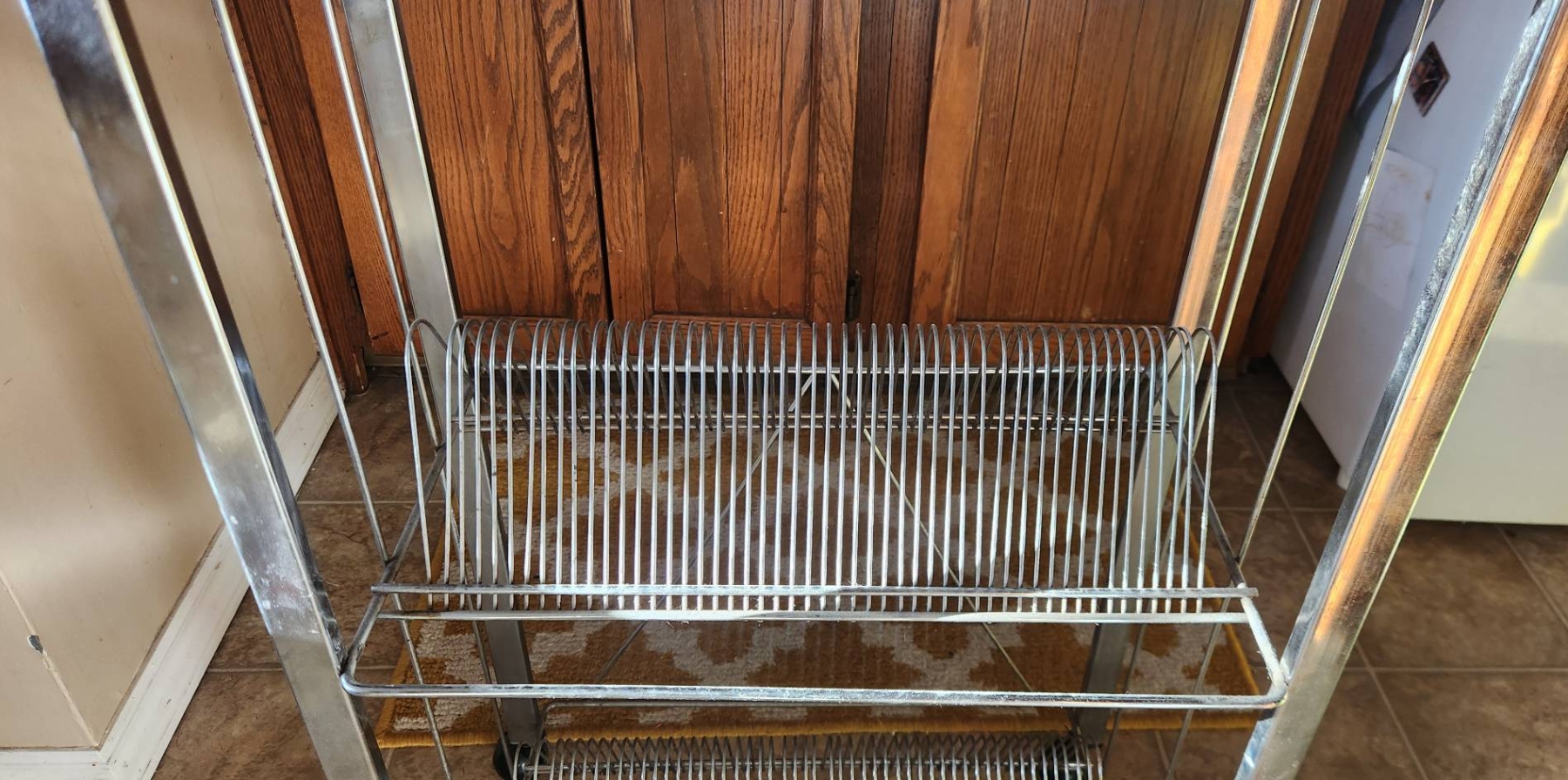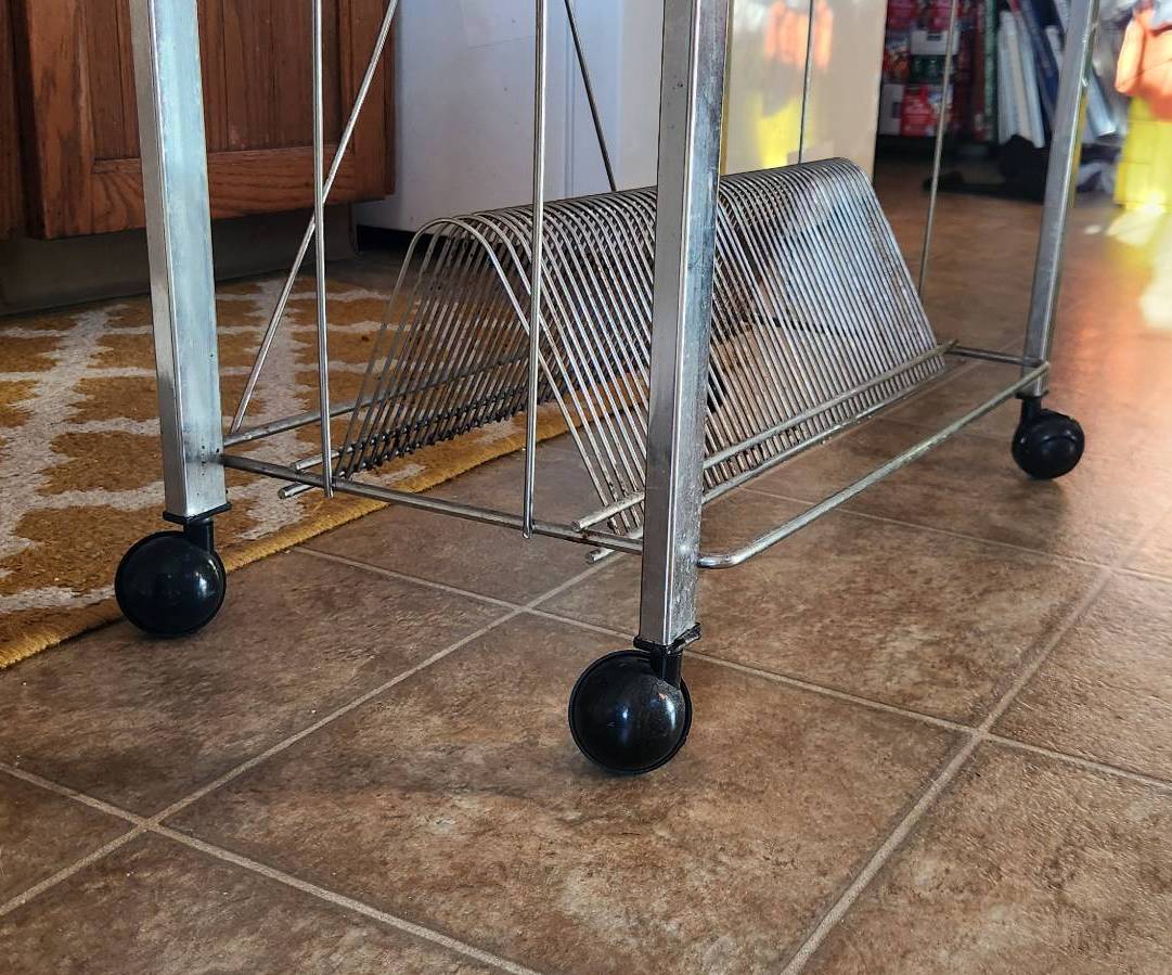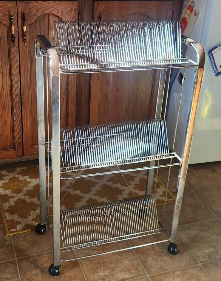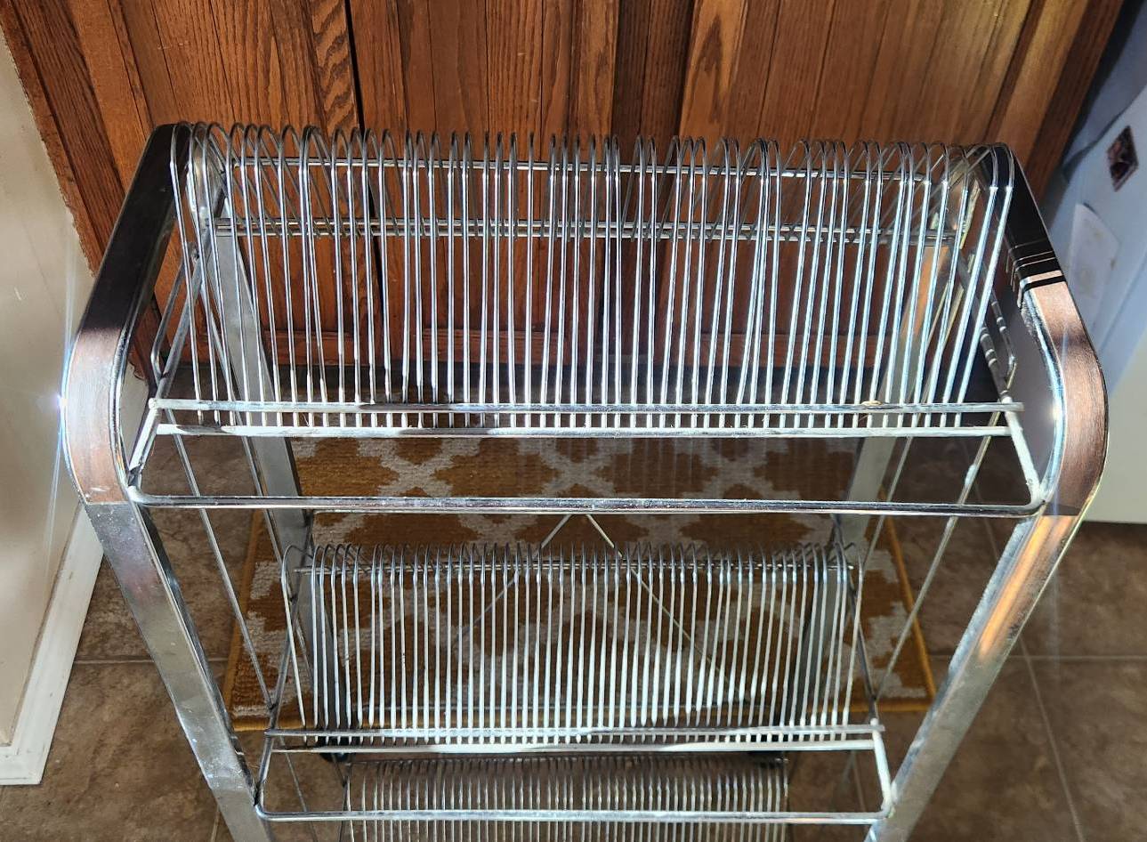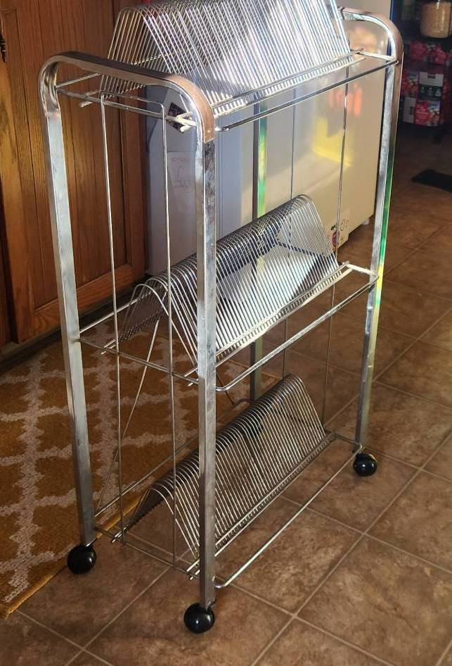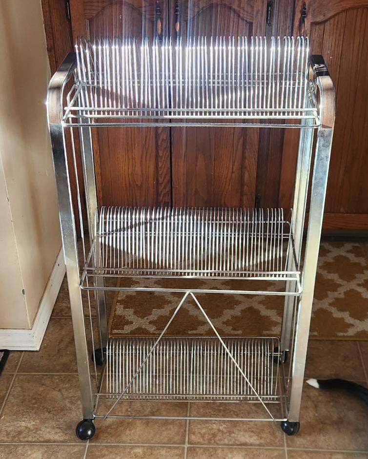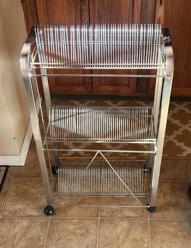 This chrome record racking unit offers a sleek, functional three-tier design. | | | It is built with three distinct shelving sections for storing records or other items, and is equipped with smooth-rolling wheels for easy mobility. | | | Measuring approximately 33 inches tall, 19.5 inches wide, and 11 inches deep, it combines durability with practicality. | | | Its classic chrome finish makes it a great addition to any space.