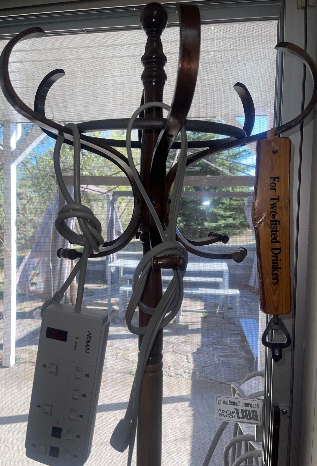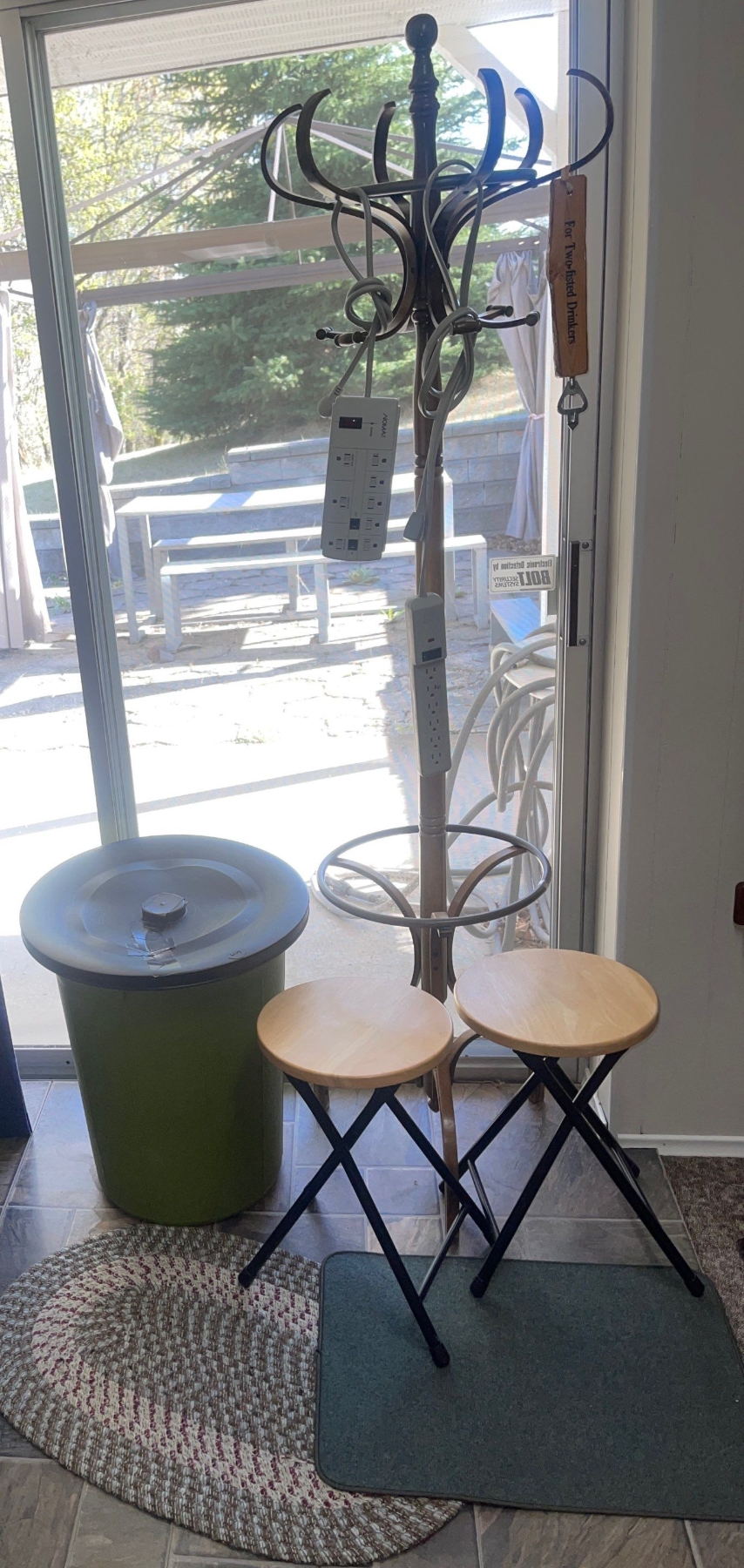 Vintage Coat Tree, Rubber Trash Can, Two Stools & Power Bars +sm rugs