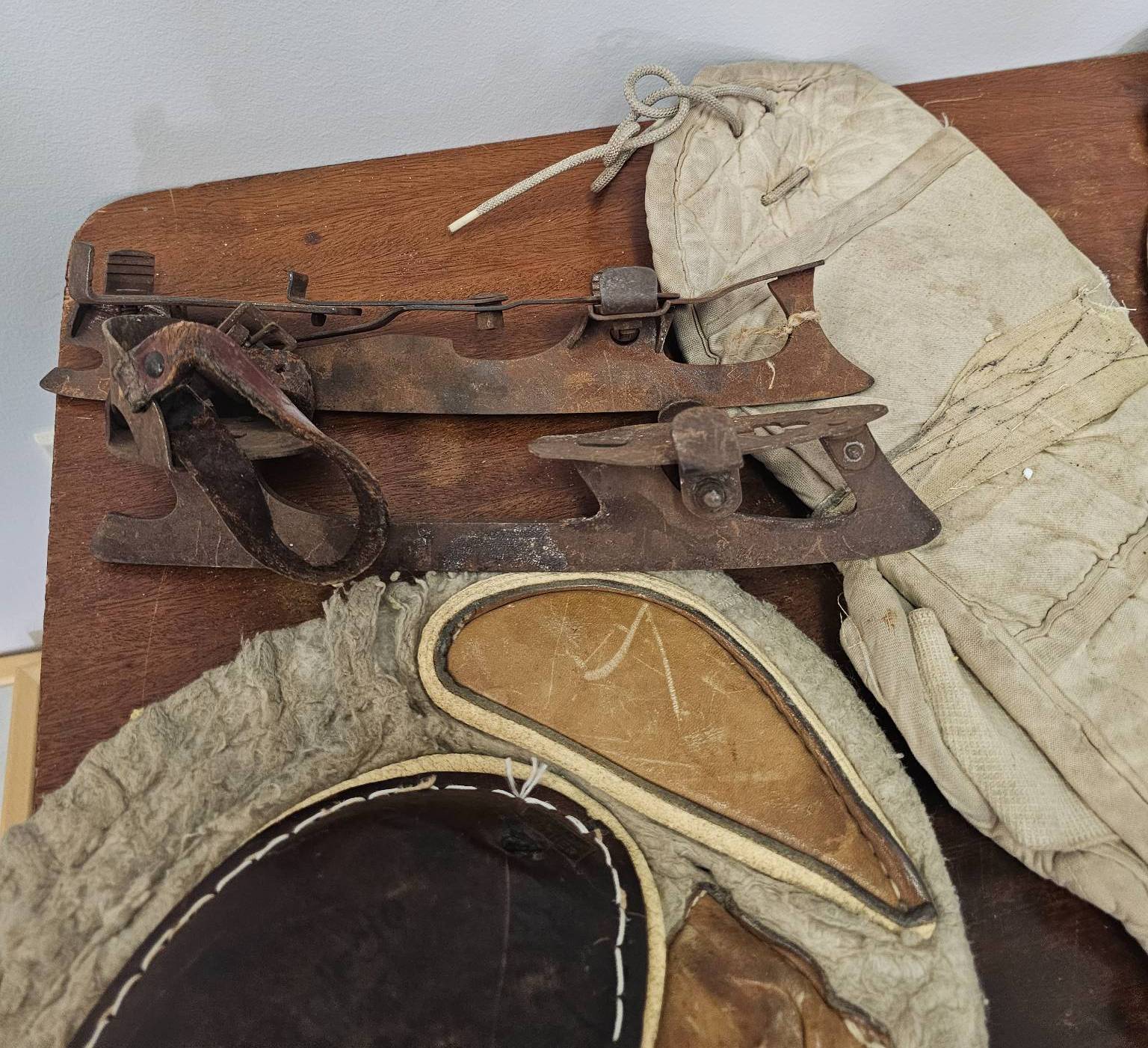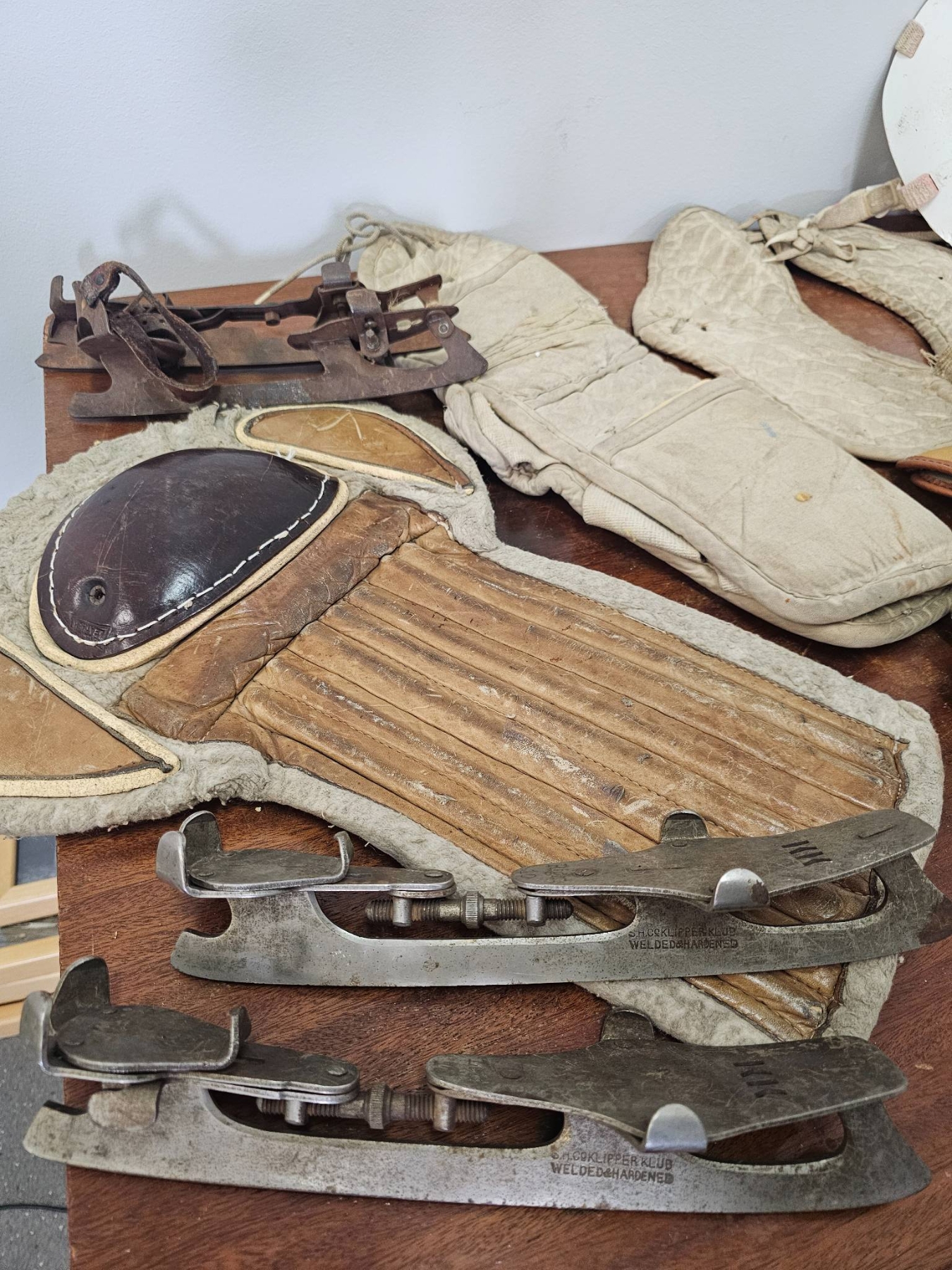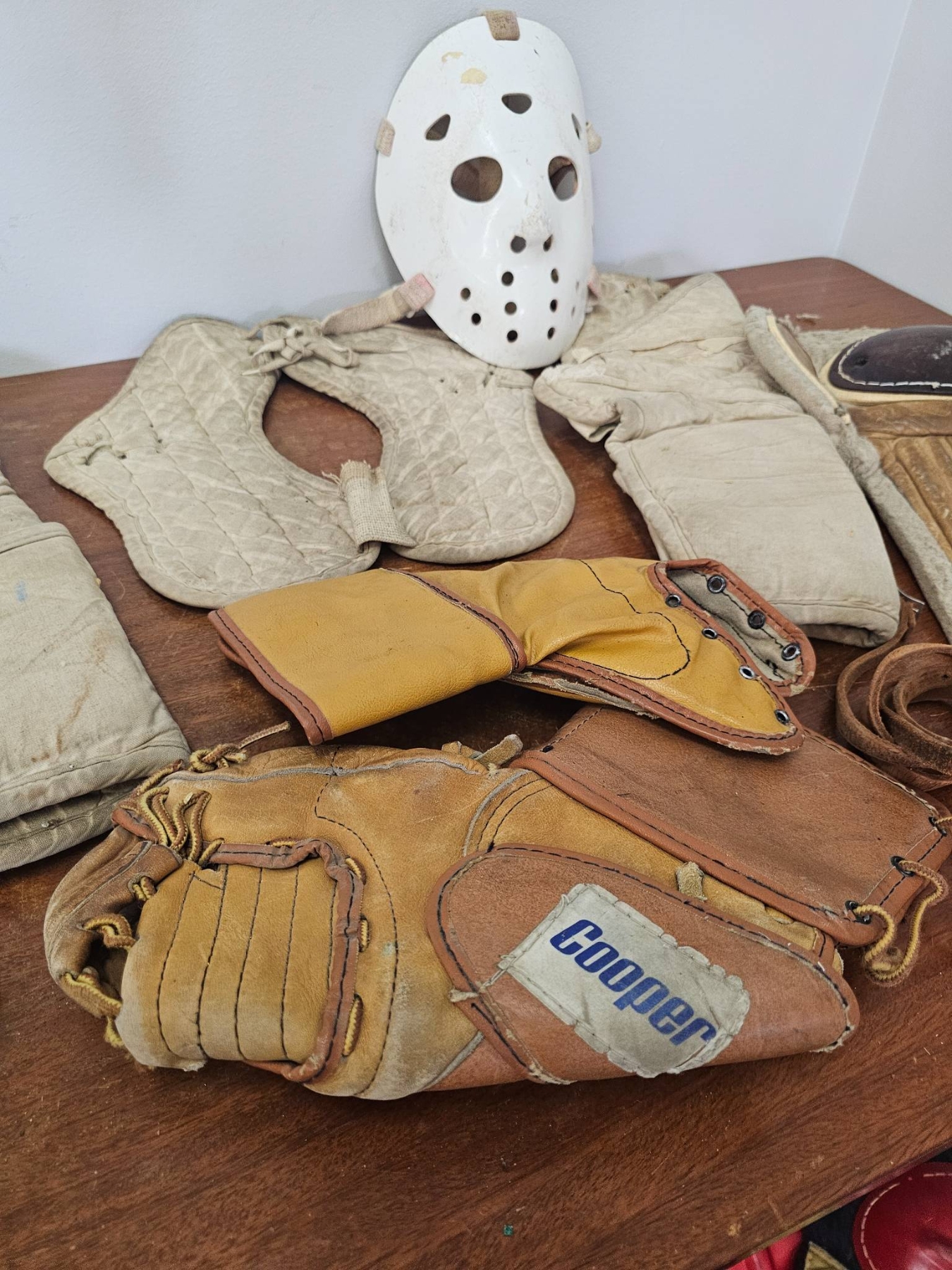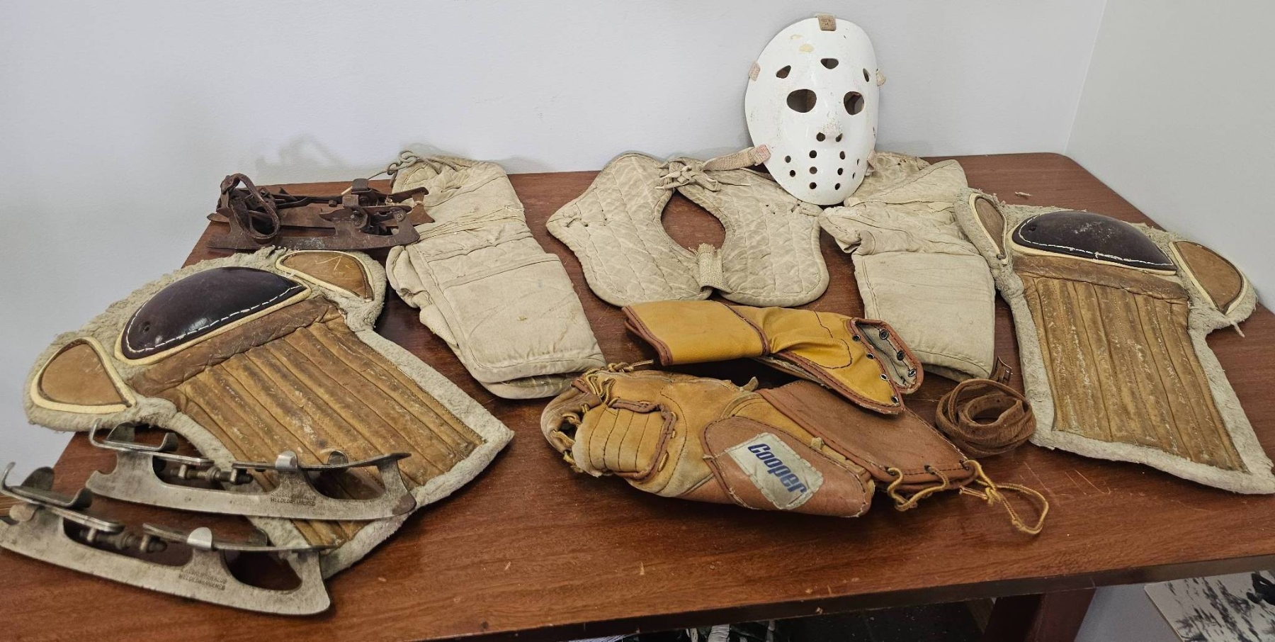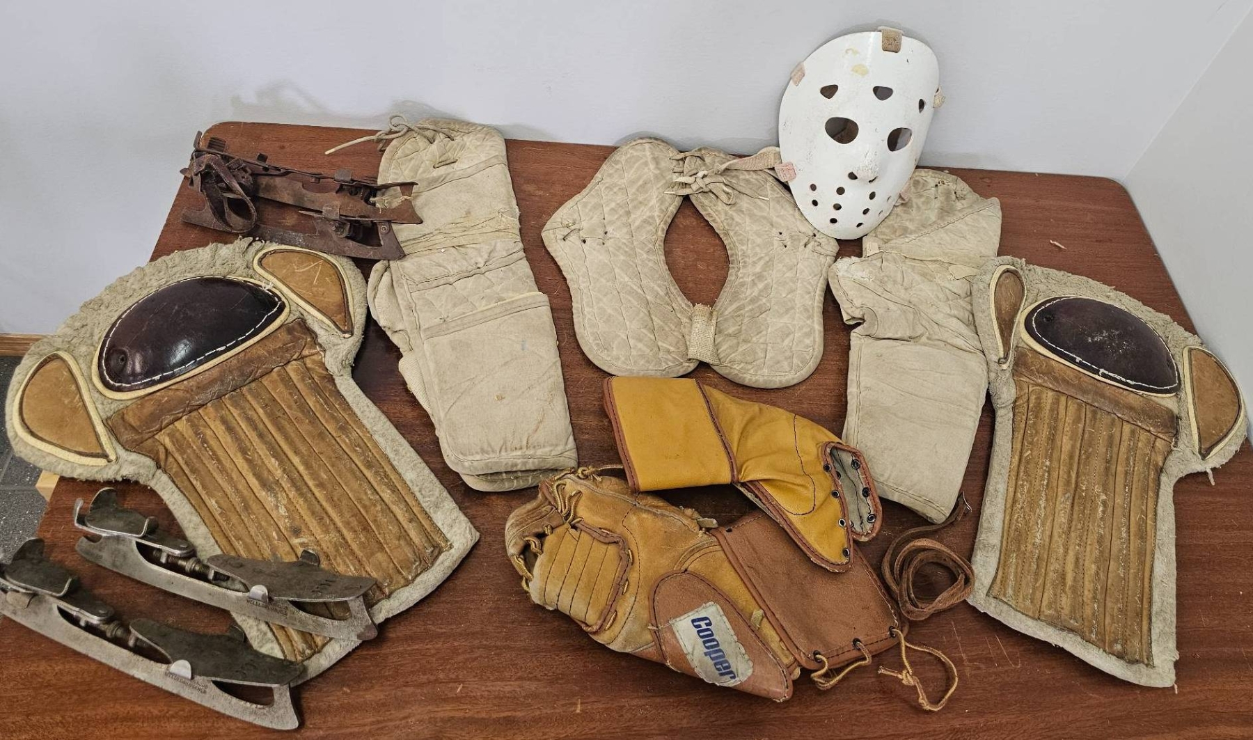Vintage hockey gear, including a white protective mask, a pair of leather goalie pads with distinct wooden inserts, a pair of metal ice skates, cotton-padded protective gear, and a leather catching glove marked 'Cooper.' Items show signs of age and wear consistent with use, making them ideal for collectors or enthusiasts of classic sports equipment.