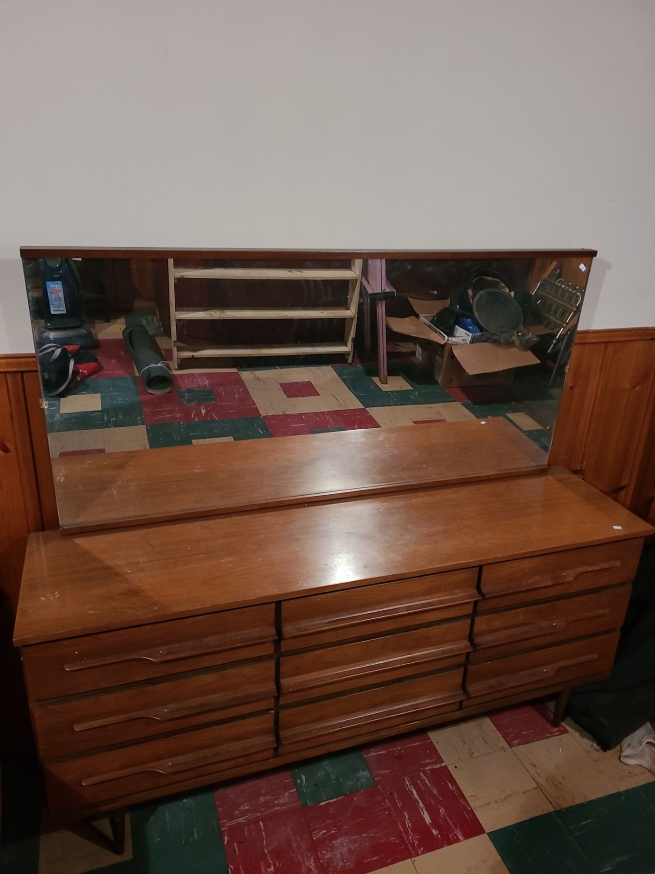 Vintage Dresser with 9 Drawers and Attached Mirror 60 T, 37 L, 17 W