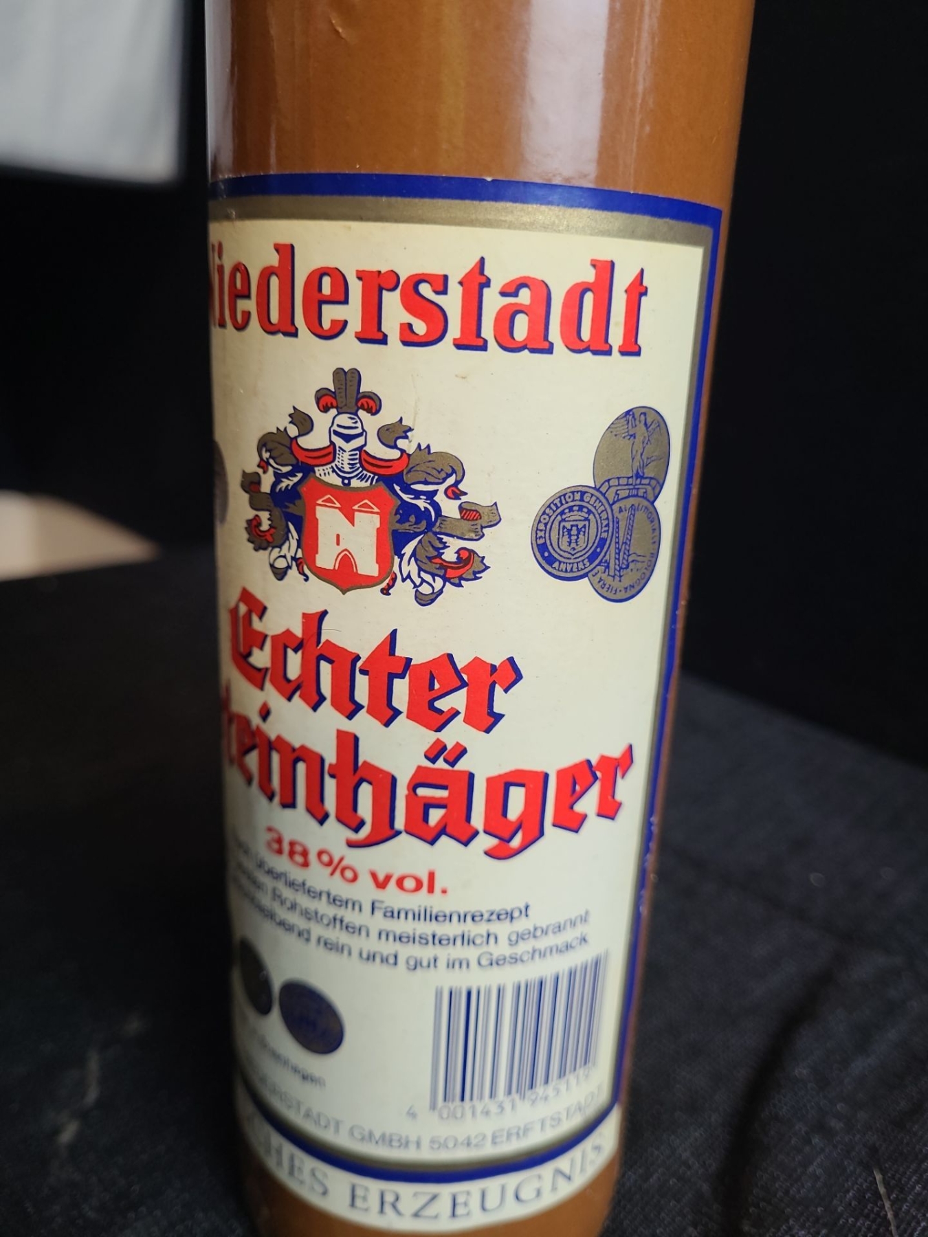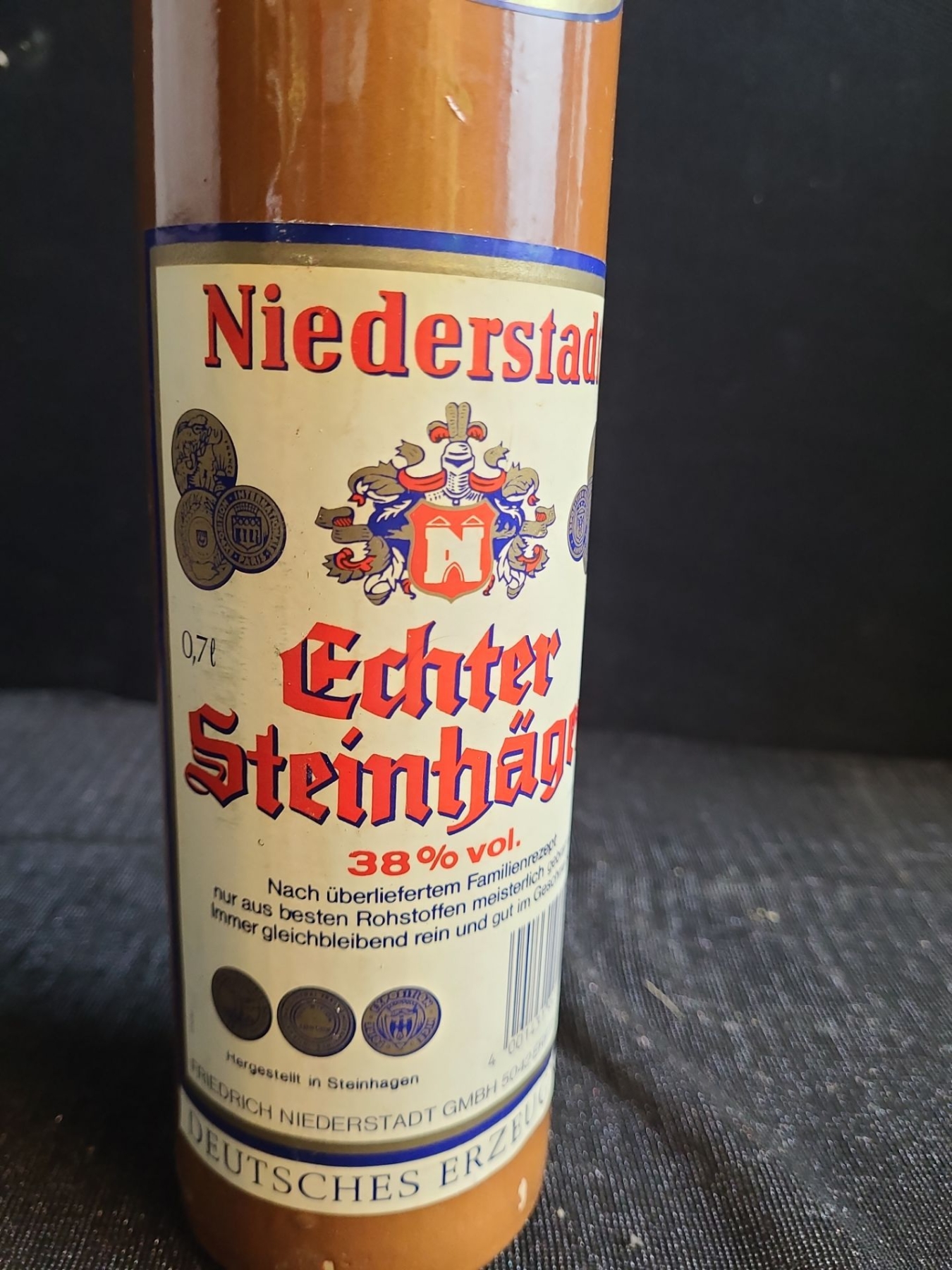 This a German spirit similar to gin, but it is typically distilled from fermented grain mash and juniper berries. The name come from the town of Steinhagen in Germany. Comes in a stone wear bottle and appears to be possibly from the 1970s.