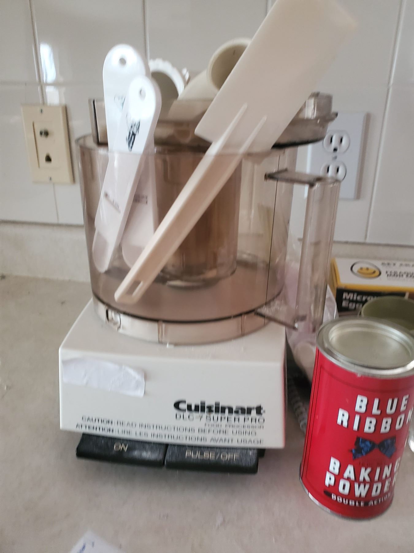 Vintage Cuisinart food processor and various vintage baking and kitchen ware.