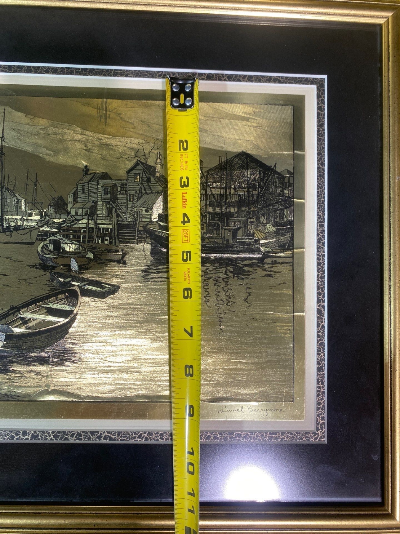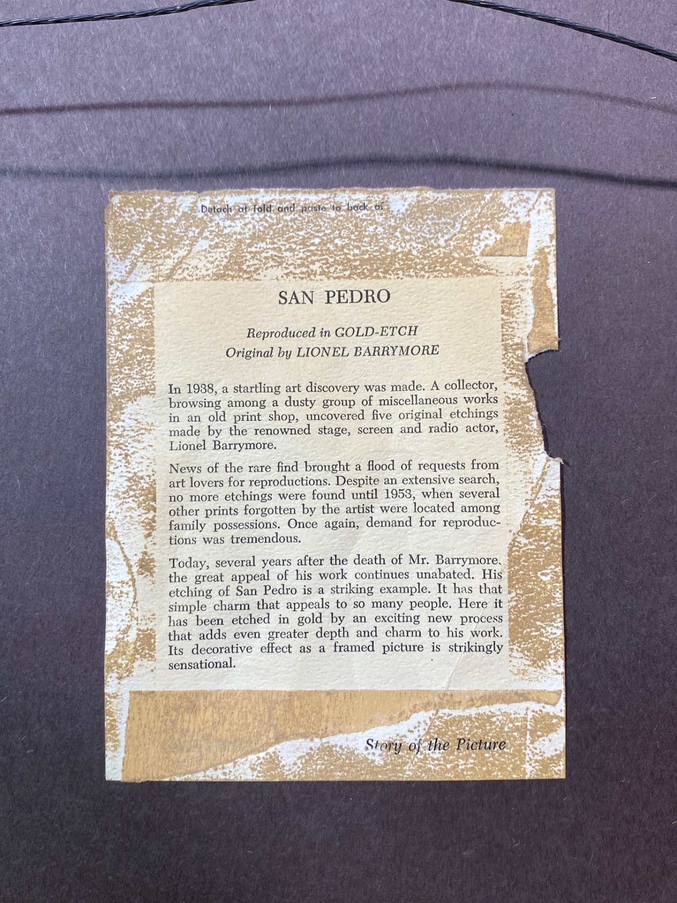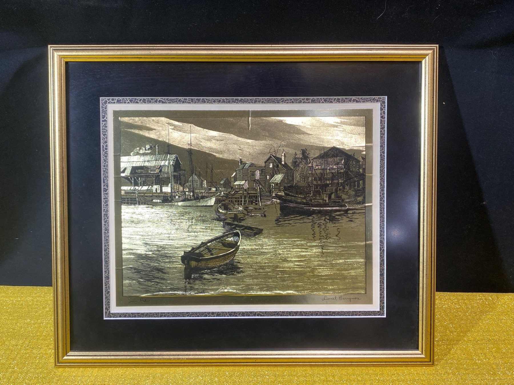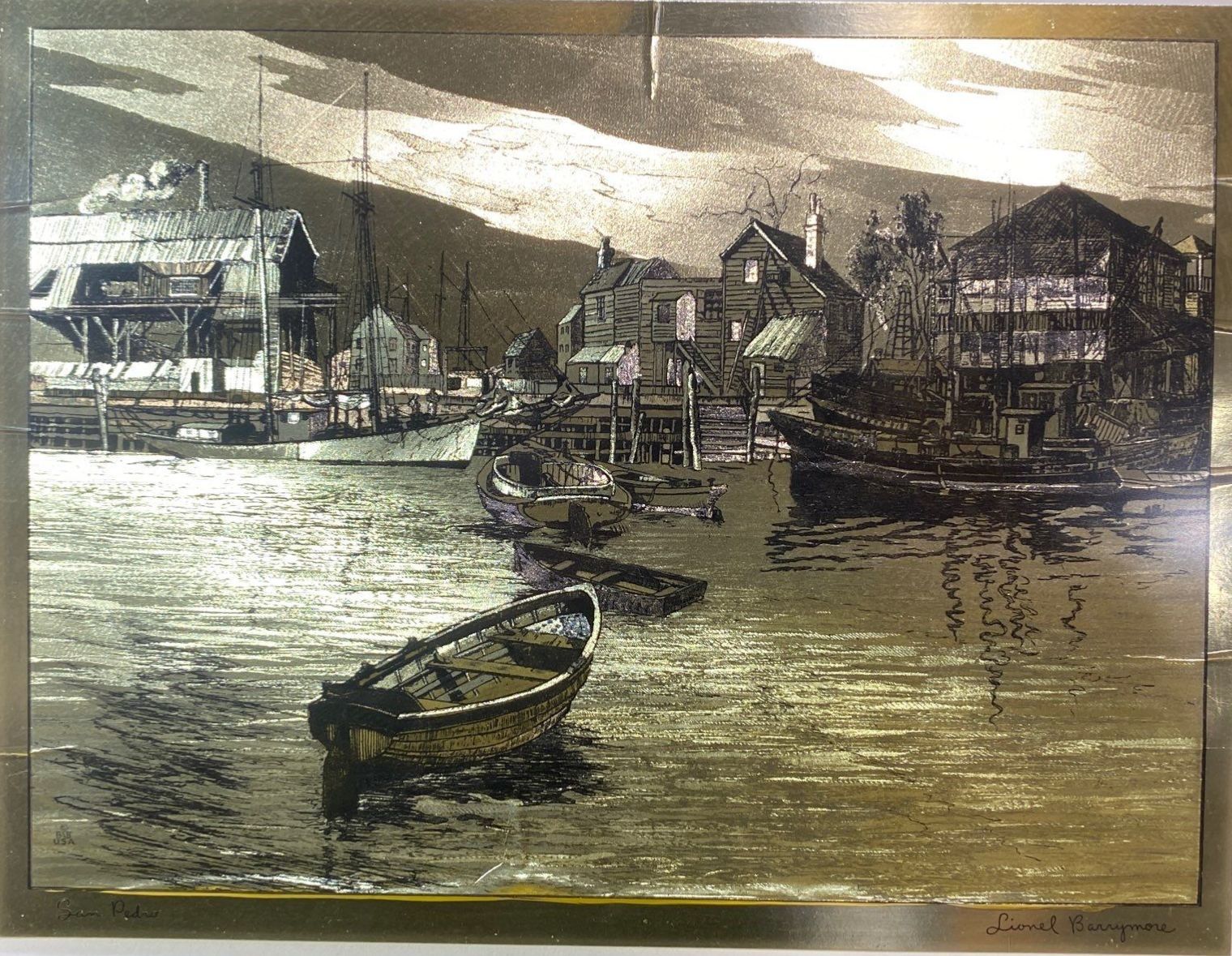 This exquisite gold foil etching, “San Pedro" by Lionel Barrymore, showcases the artist’s masterful line work and delicate detailing. Rendered in shimmering gold on a contrasting background, the etching captures the serene beauty and subtle textures of the coastal landscape. A rare and elegant example of Barrymore’s artistry, ideal for collectors of fine prints and distinguished decorative works.