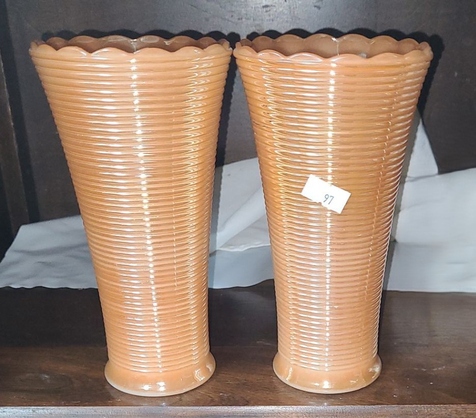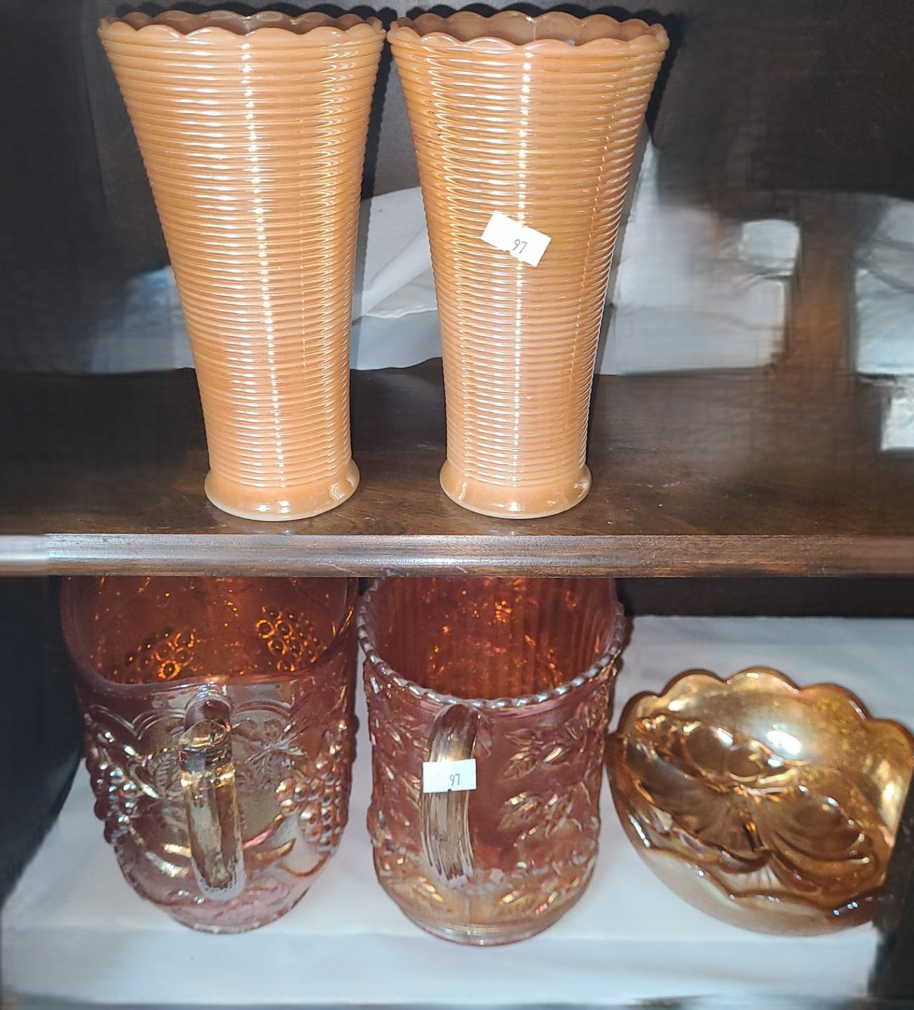 Vintage Glass: Pair of Vases 7 T, Pair of Pitchers 7 T, Bowl 7" Diameter, and Serving Dish