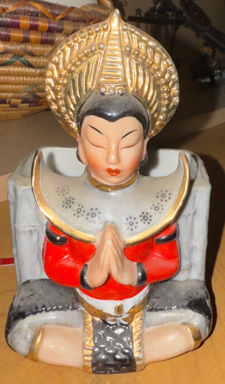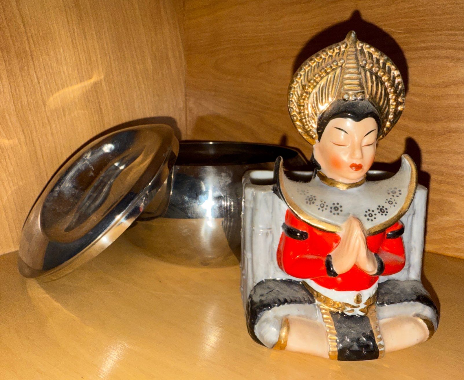 Vintage Golden Leaves L'Amour Japanese Hand Painted Woman Figurine 5T w/ Metal Bowl w/ Lid