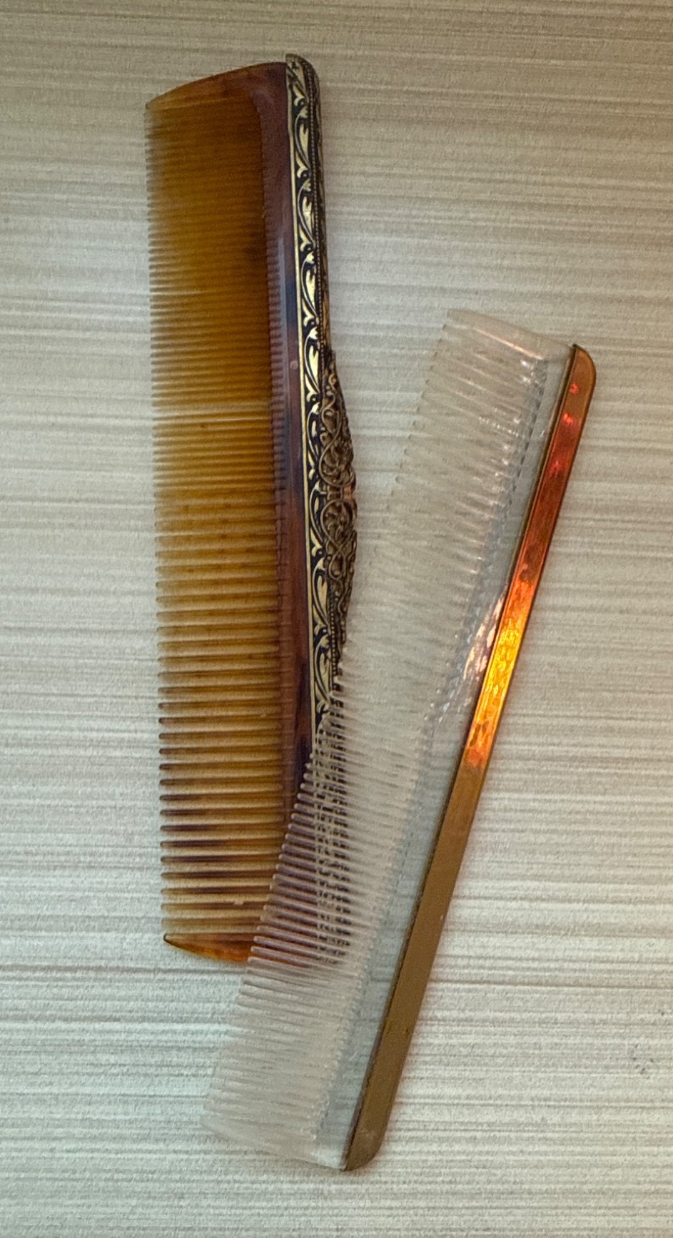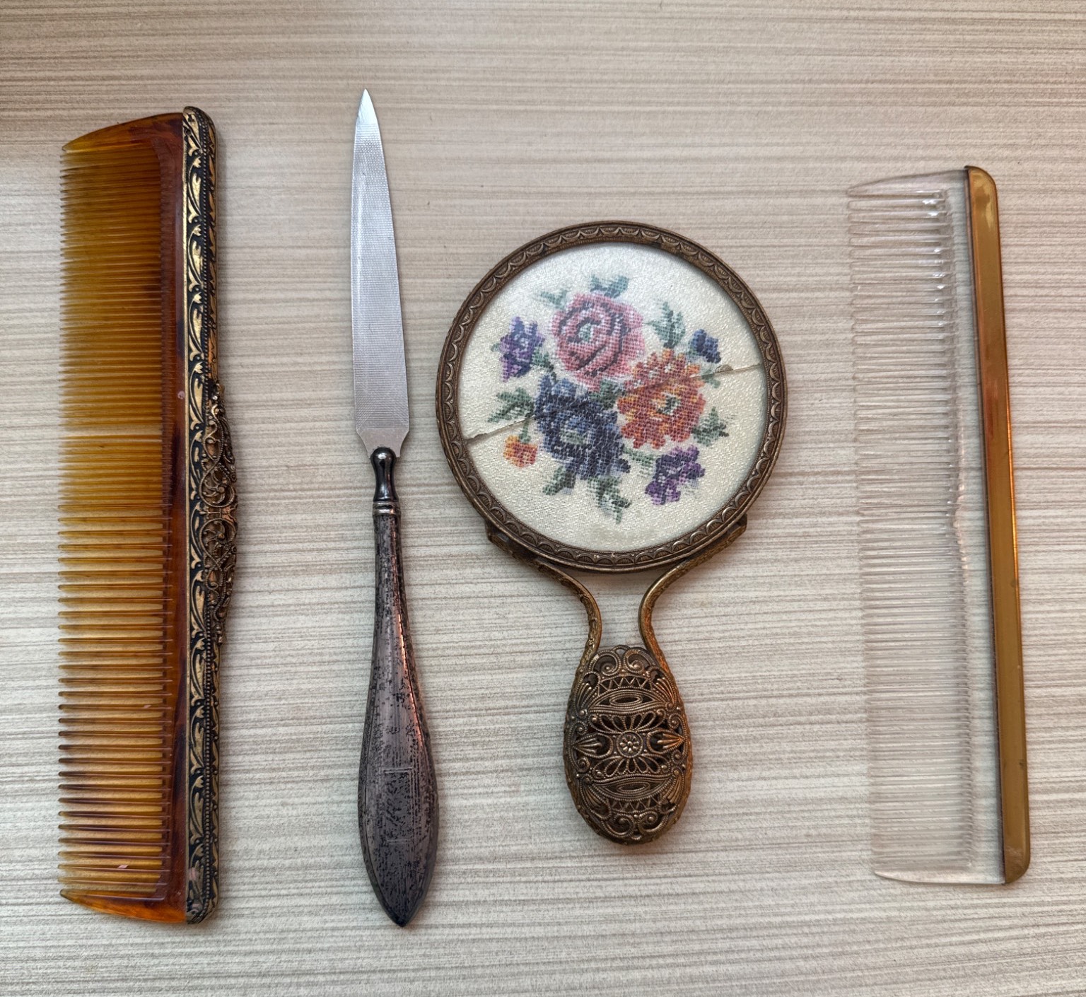 Four-piece vintage grooming set including a handheld mirror with floral embroidery under glass and an intricately detailed metal handle, a steel letter opener with textured blade and handle, and two combs–one tortoiseshell-style with metallic detailing and one clear plastic with a gold-tone edge. Items show minor wear consistent with use and age.