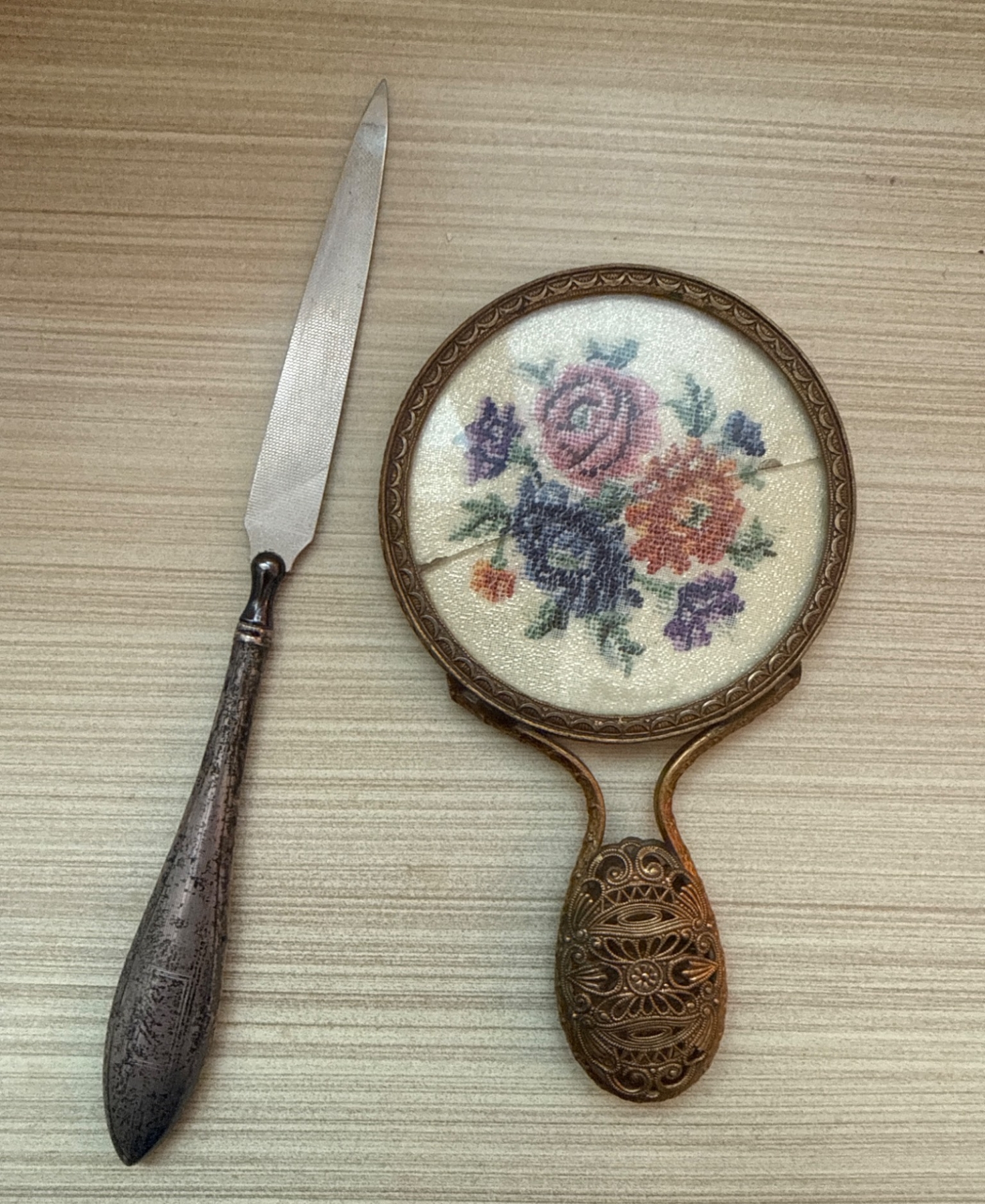 Vintage Grooming Set with Embroidered Mirror, Steel Letter Opener, and Decorative Combs