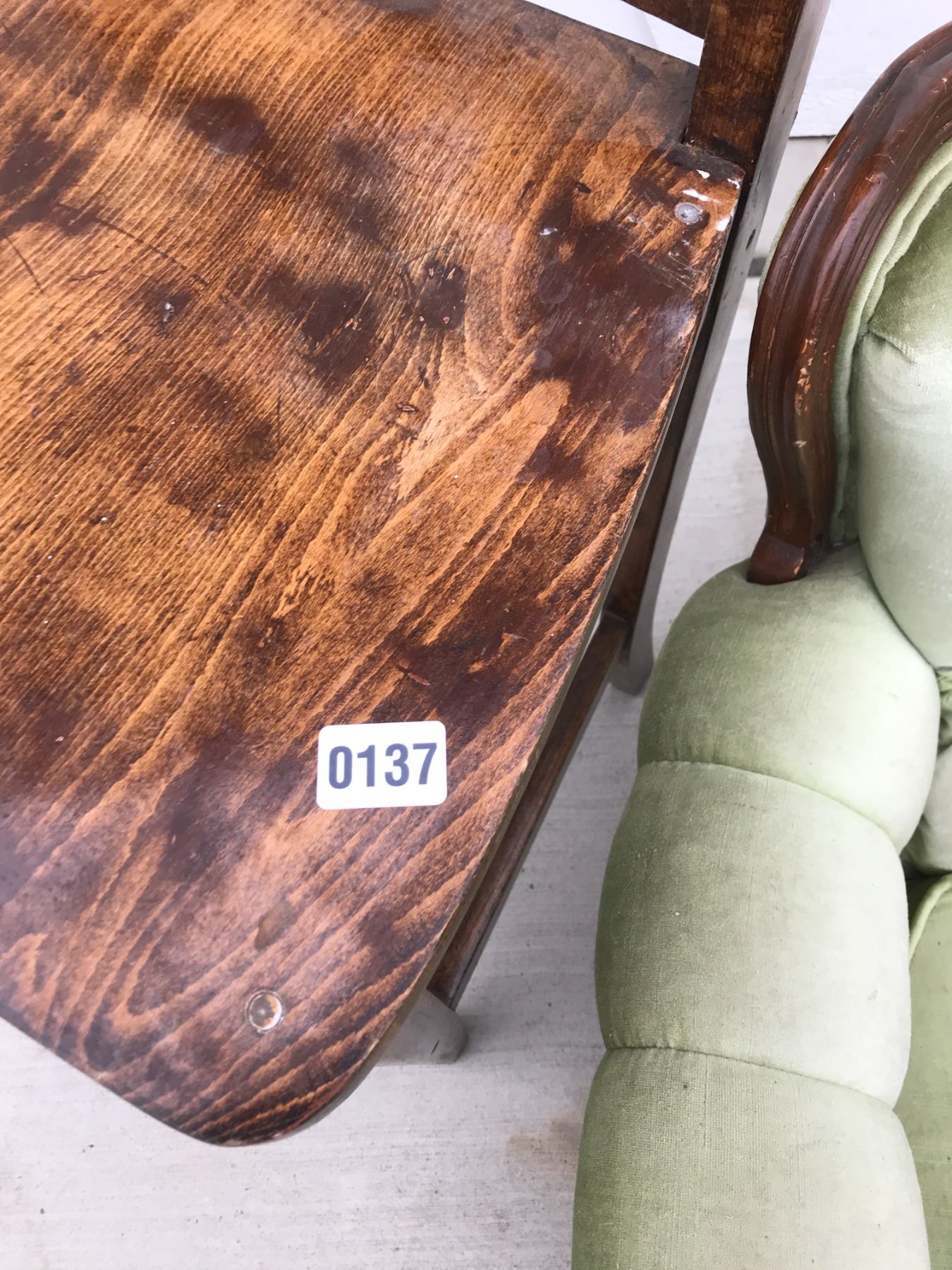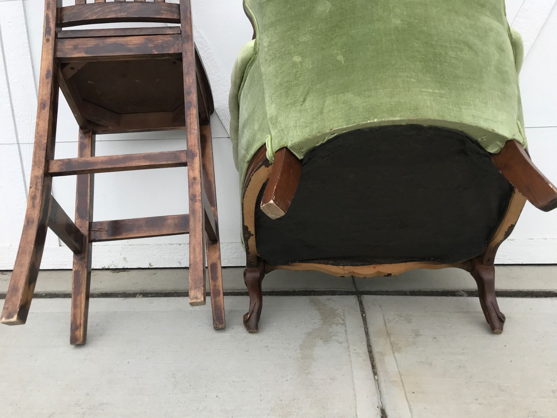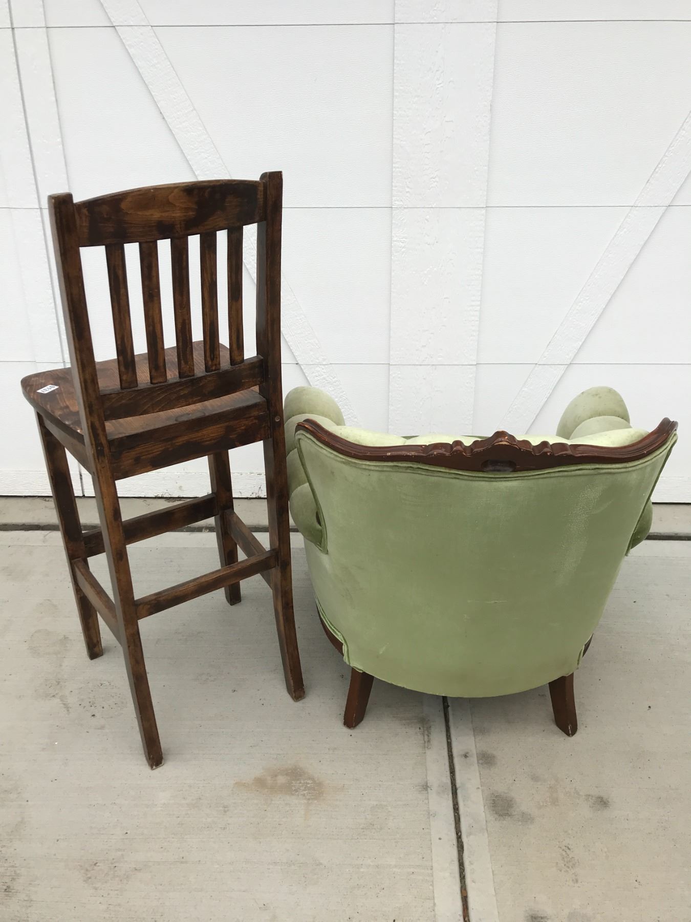 Vintage Hand Carved Wood Chair Upholstered w Green Velvet & Solid Wood Bar Stool