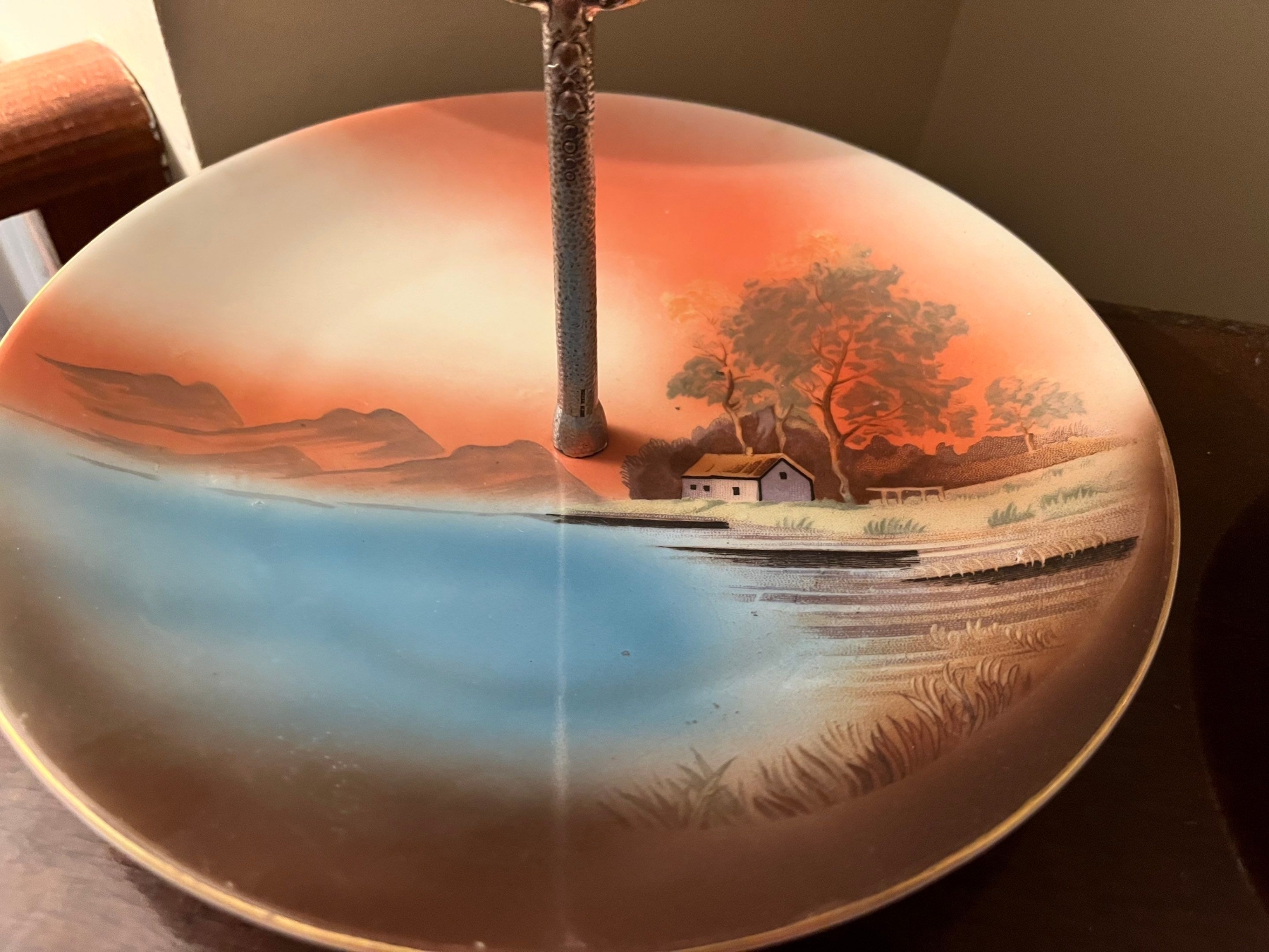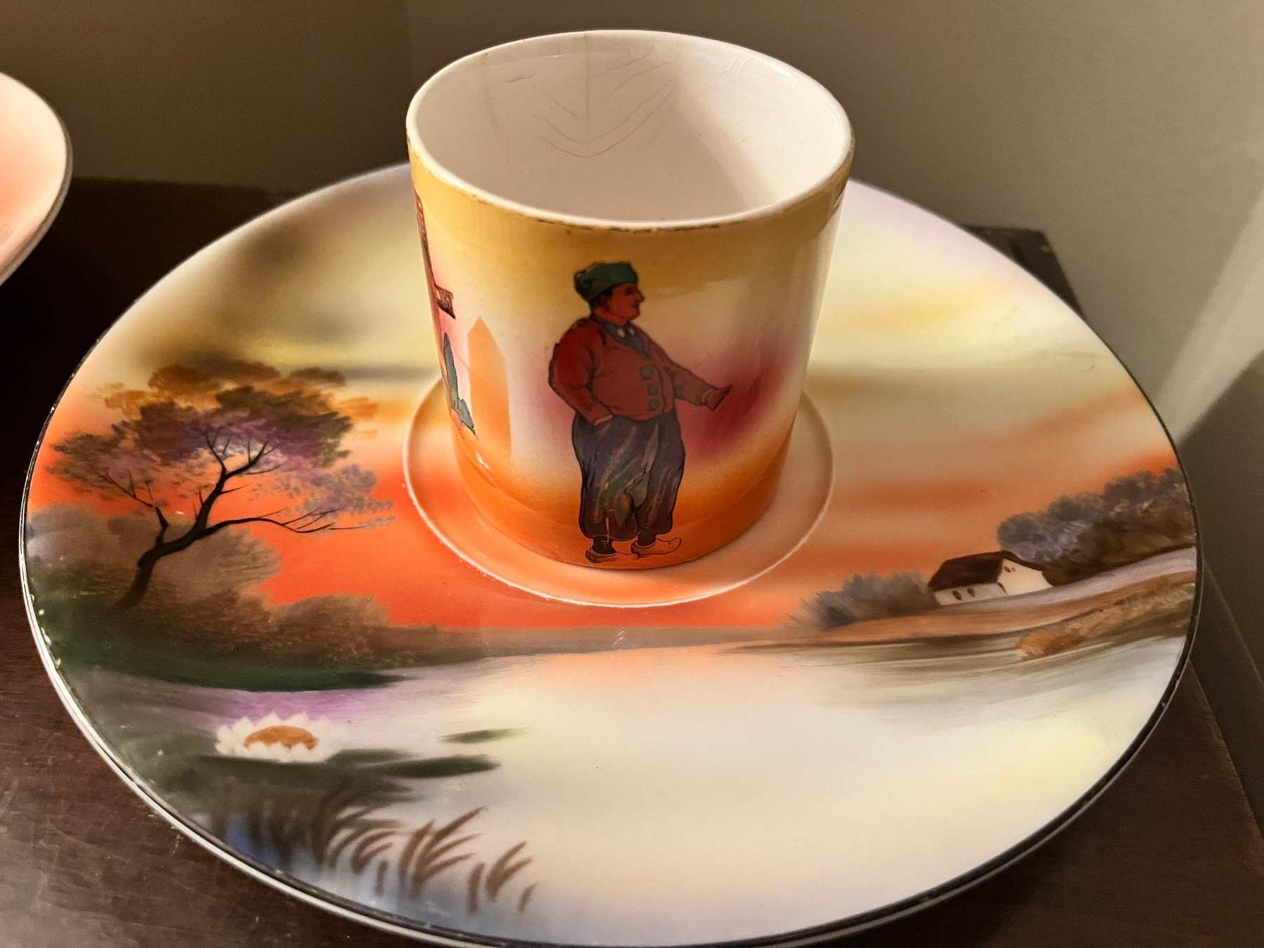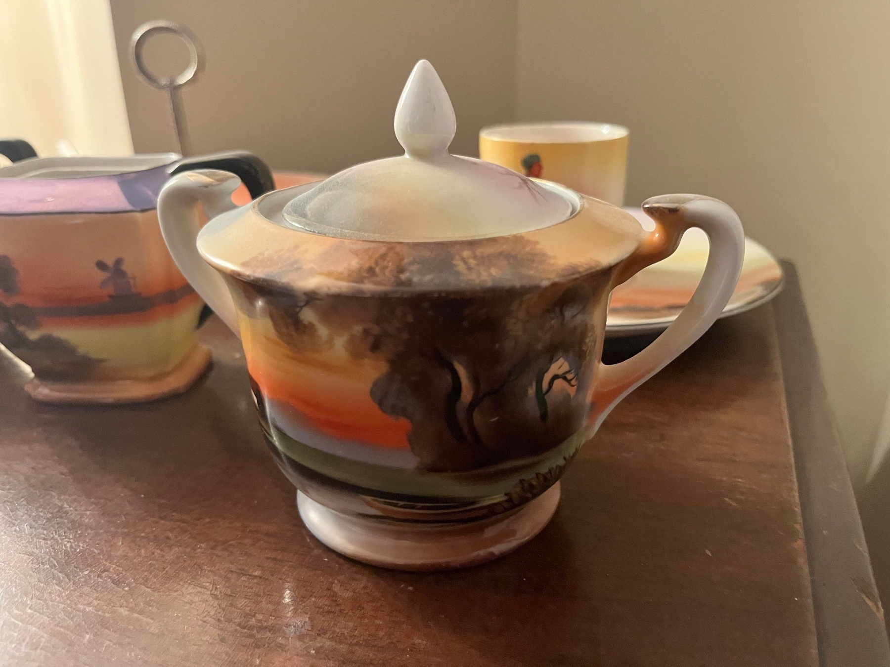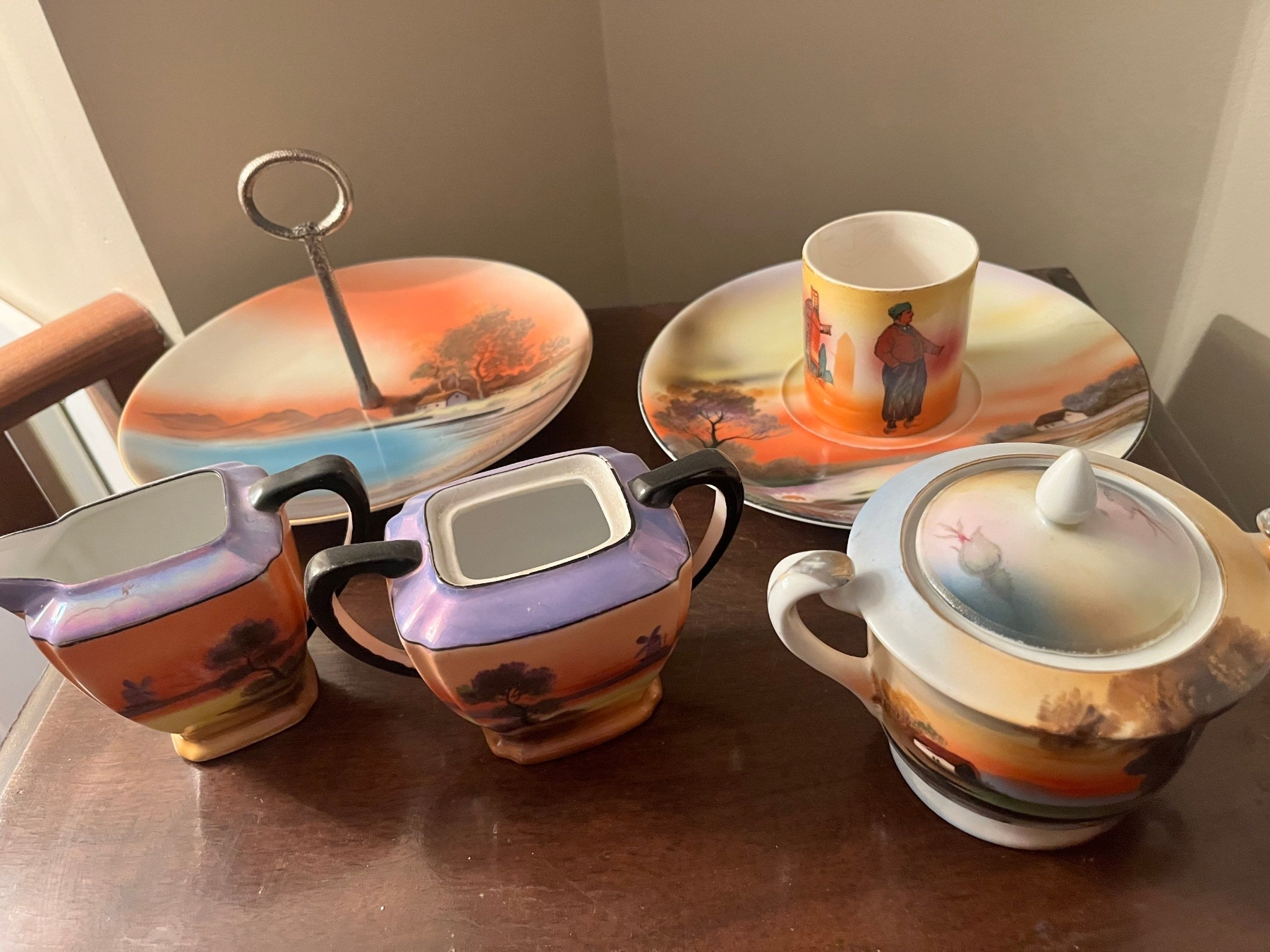 Vintage Hand Painted Noritake Trinket, Ring, Jewelry Dish With Center Handle creamer pot 2 teacups and a plate
