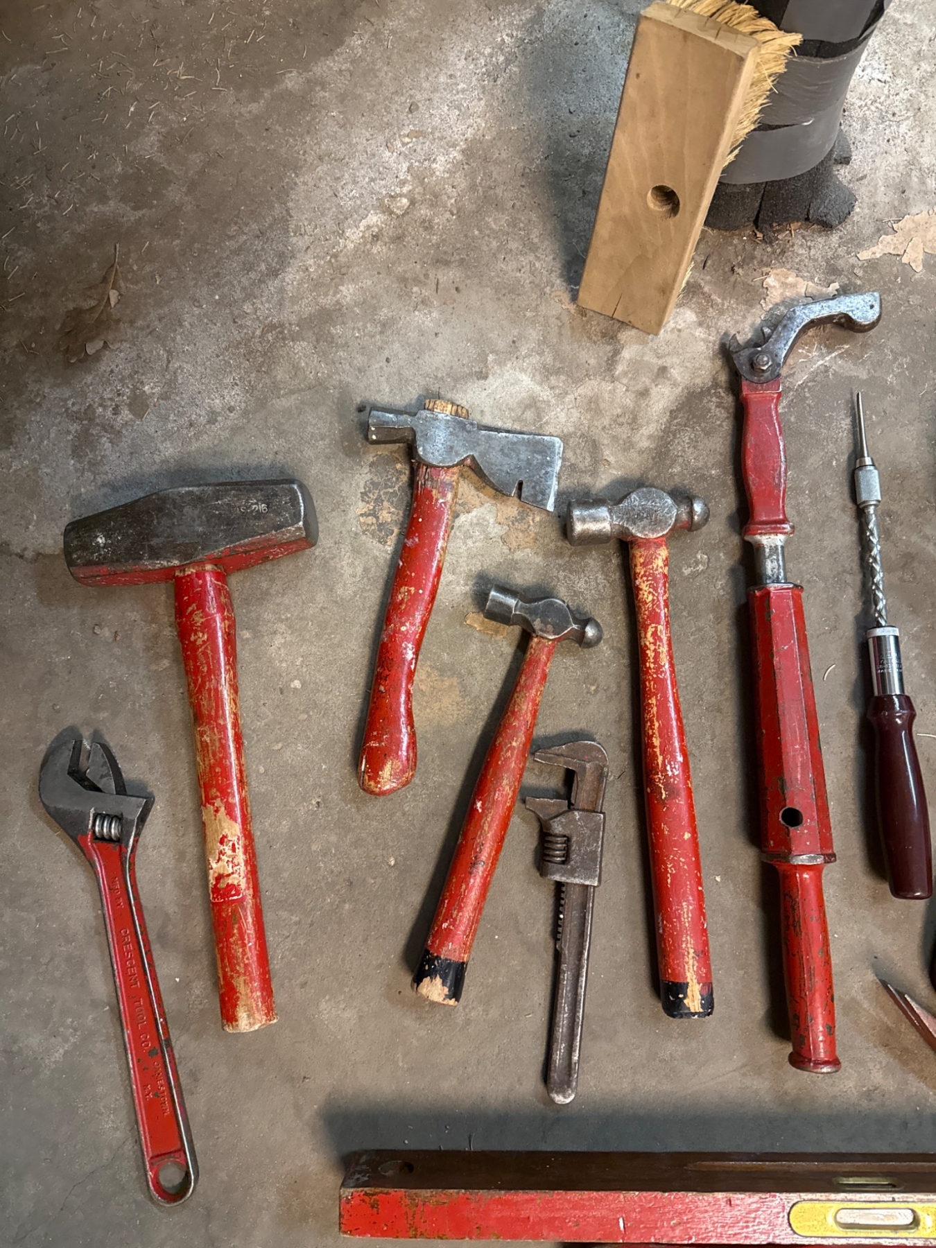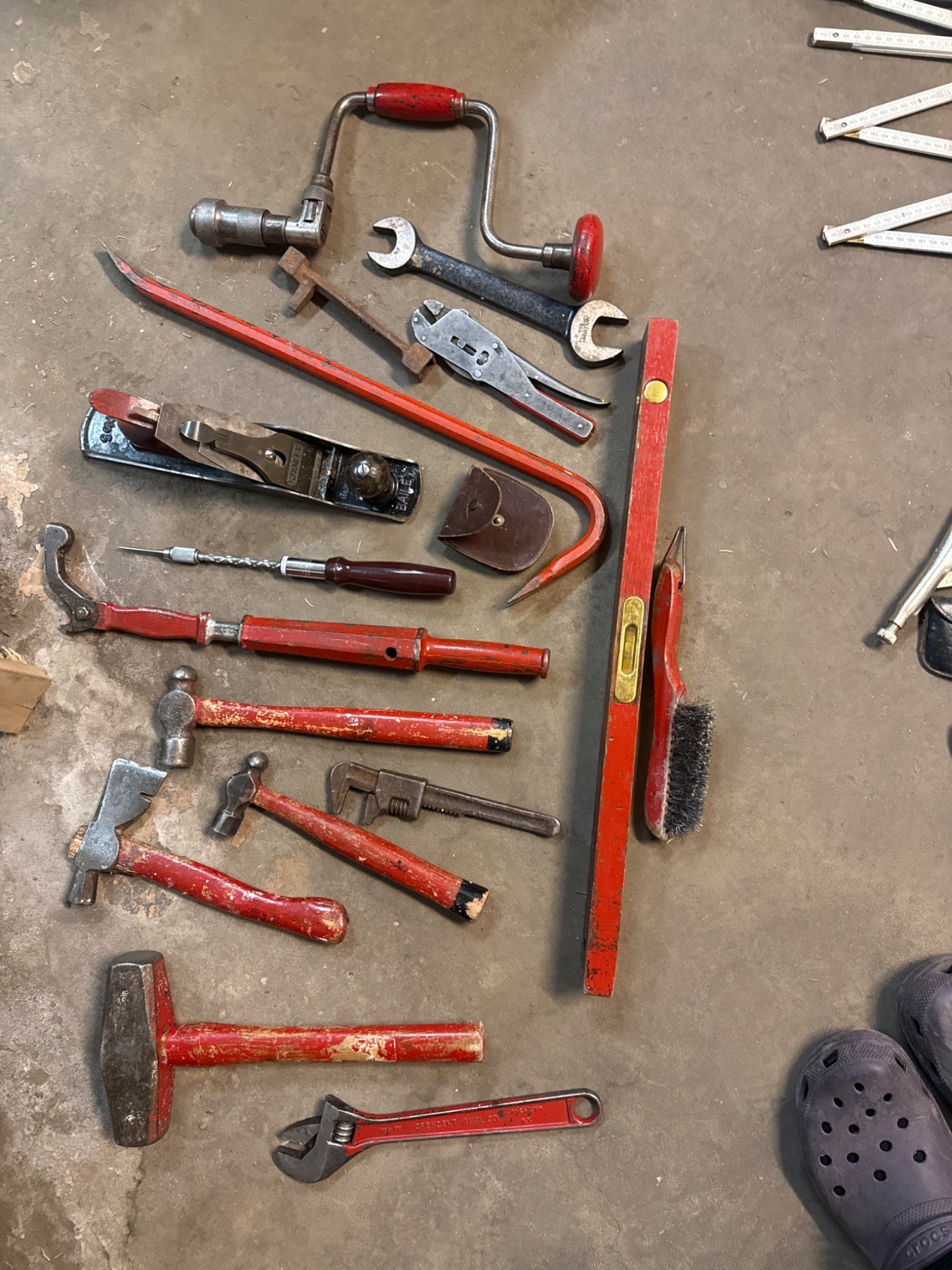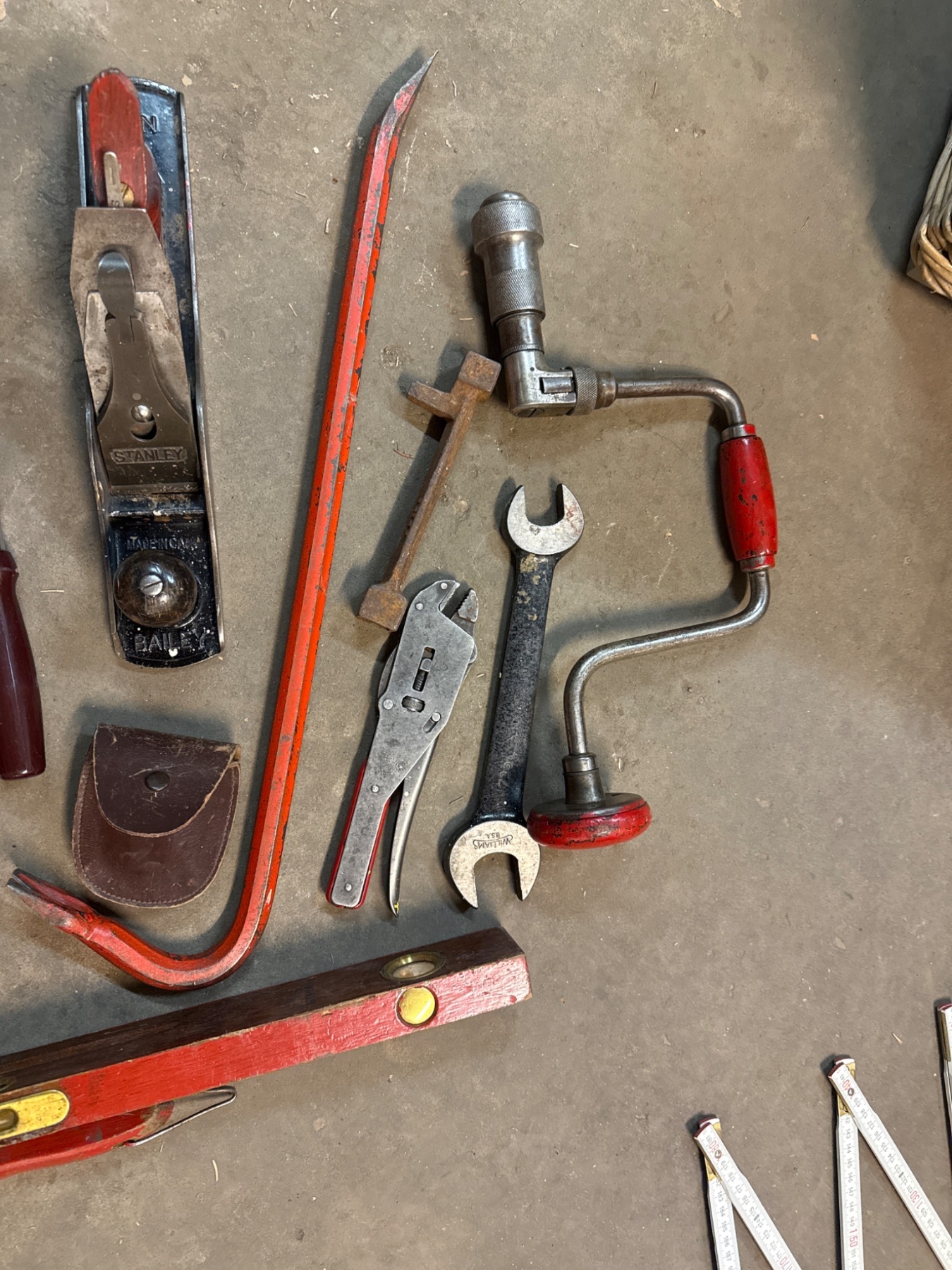 Vintage hand tools featuring various hammers, axes, a level (approx. 36 inches), a screwdriver, a hand drill, and a selection of wrenches and pliers. Tools display red wooden or metal handles. Includes a wire brush, a crowbar (approx. 24 inches long), and a hand plane. Some tools show wear from use, with surface marks and paint chipping visible. Ideal for collectors, crafters, or practical use.