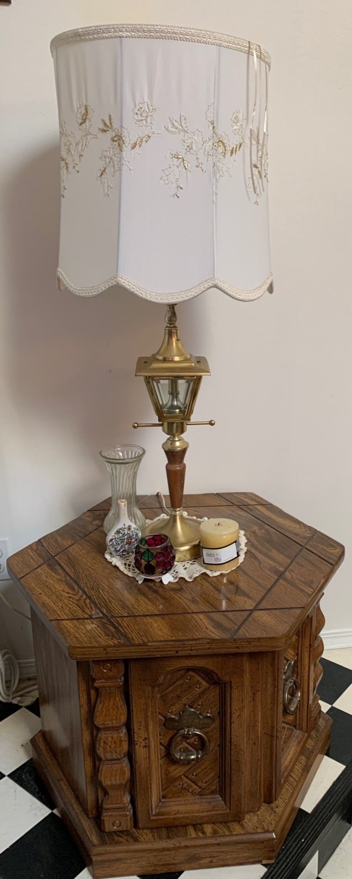 Vintage Hexagonal End Table 24x20 w/ Brass Lamp - Contents Included