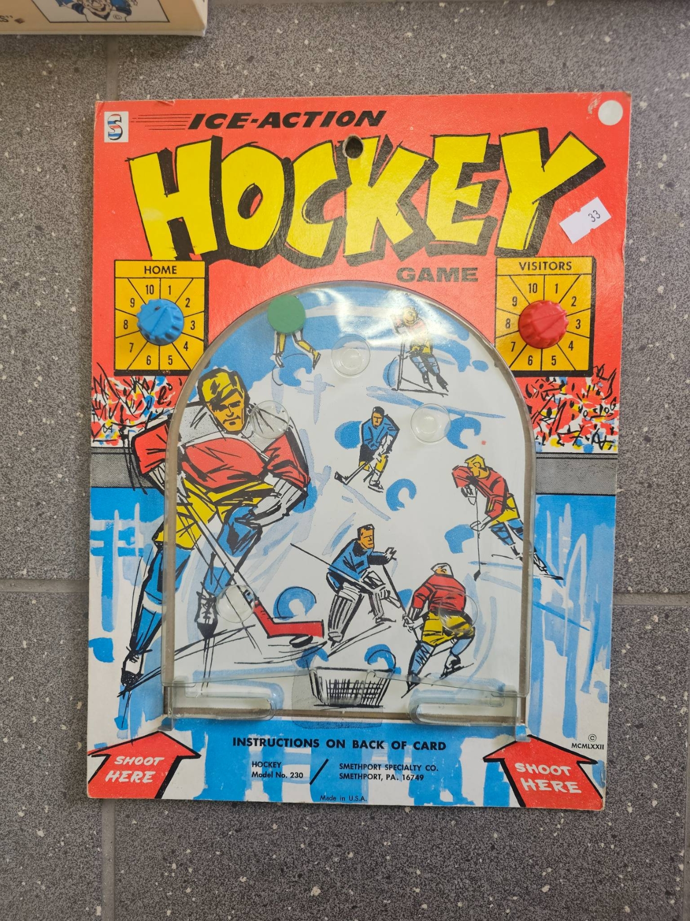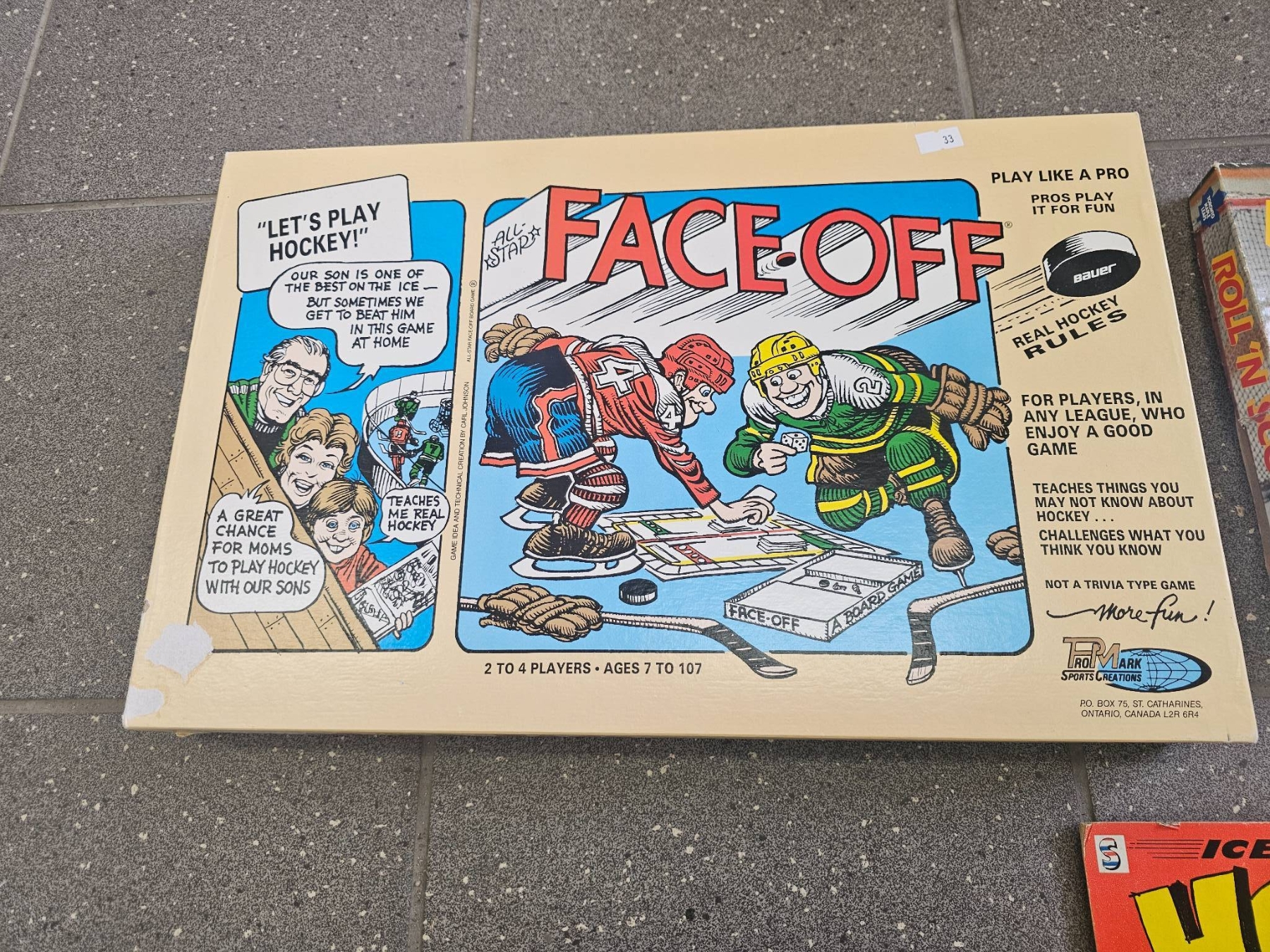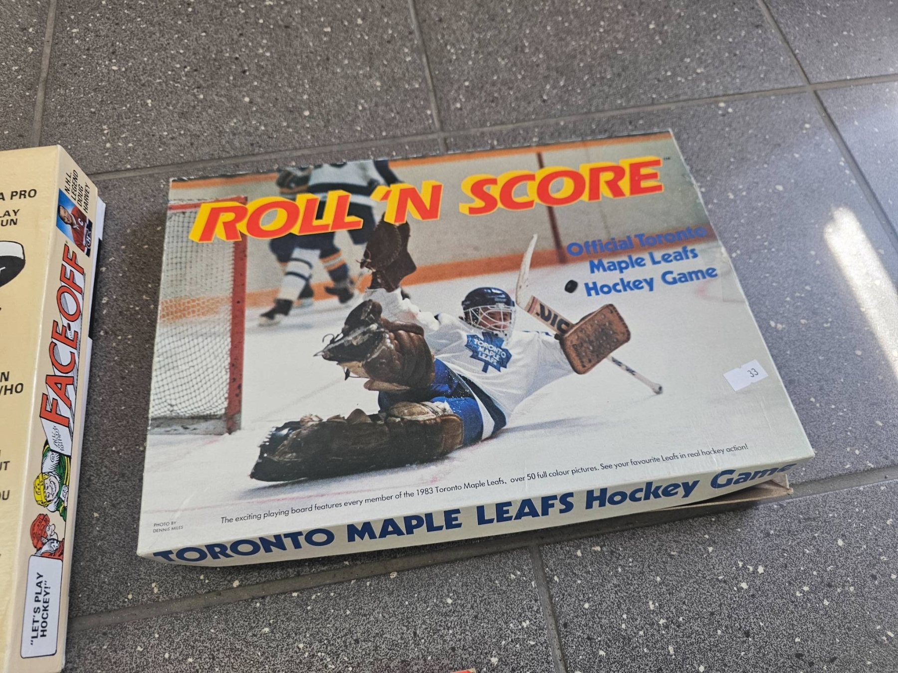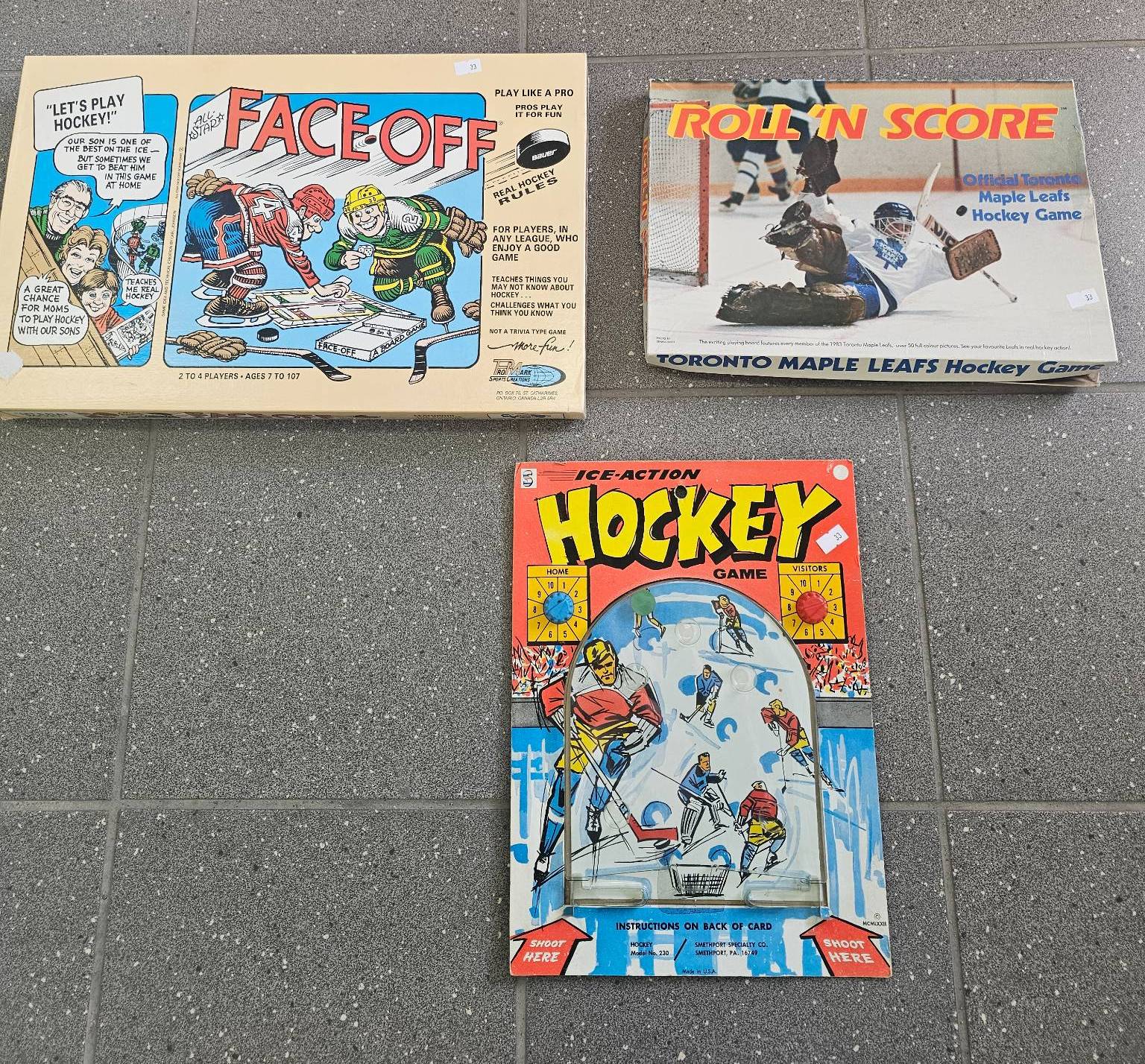 Three vintage hockey-themed games and toys. Includes a game labeled 'Ice-Action Hockey,' a vintage board game titled 'Faceoff,' and another game titled 'Roll 'n Score: Toronto Maple Leafs Hockey Game.' Items appear to feature colorful illustrations and graphics. Condition and completeness unknown.