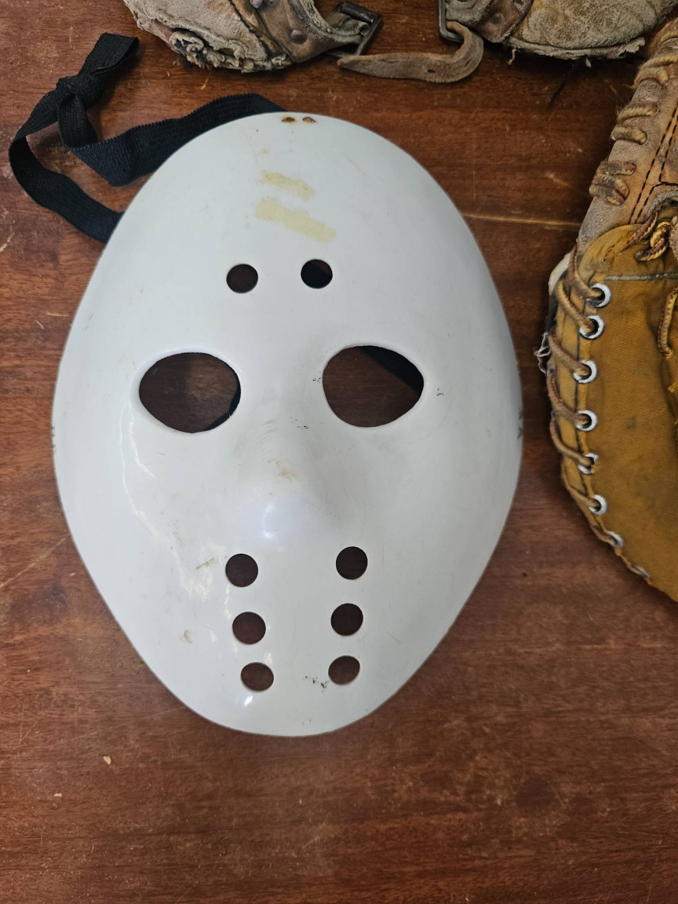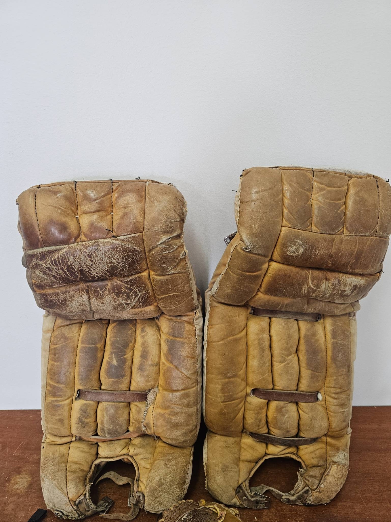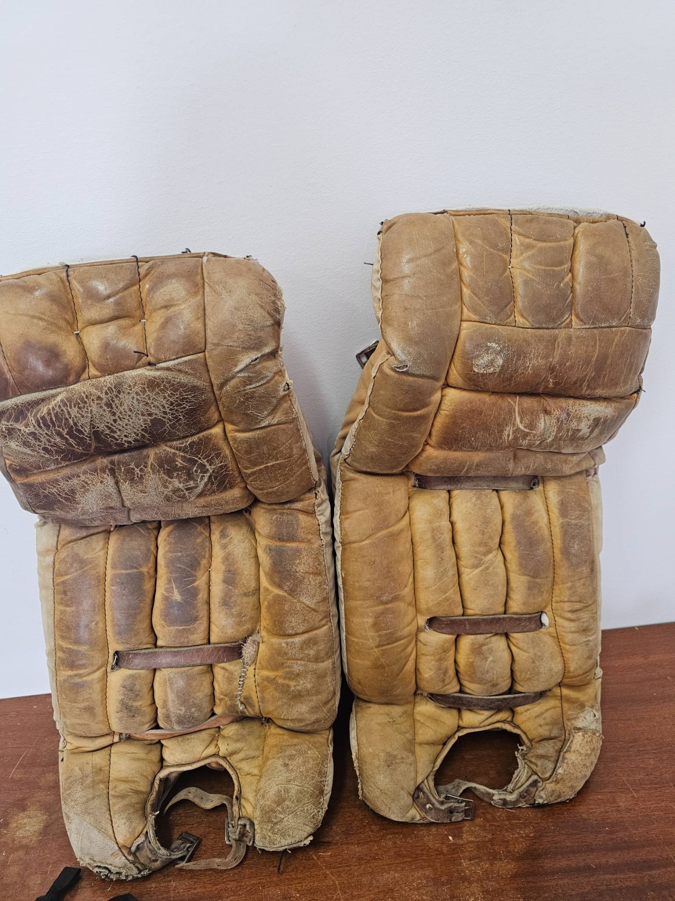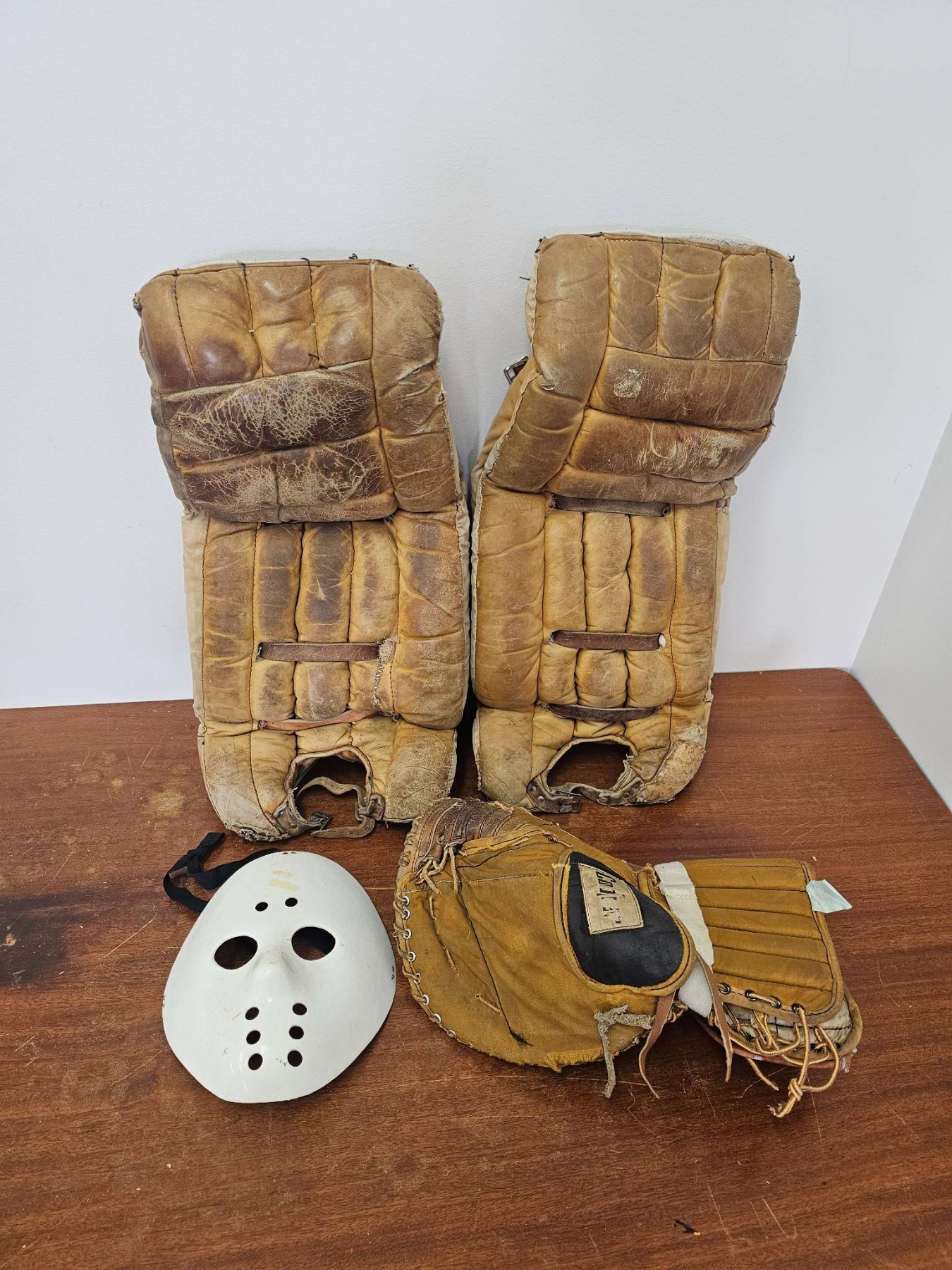 Includes a set of vintage leather hockey goalie pads, a white fiberglass goalie mask with ventilation holes, and a brown leather catcher glove with visible stitched detailing. The items show notable wear, consistent with previous use and age. Manufacturer markings on the glove suggest additional collectibility. A unique set for collectors or sports enthusiasts.