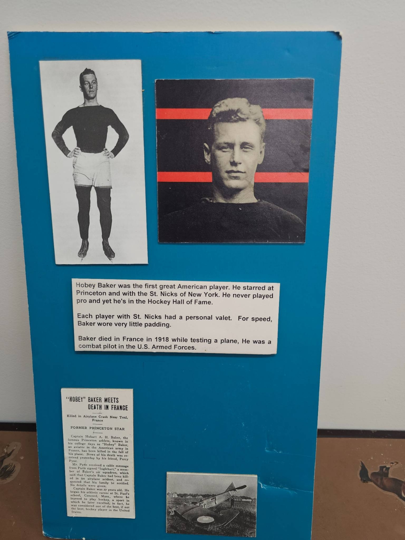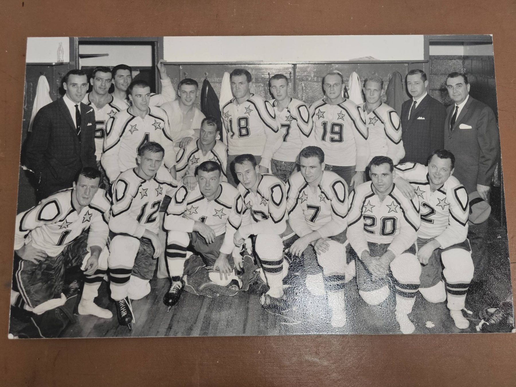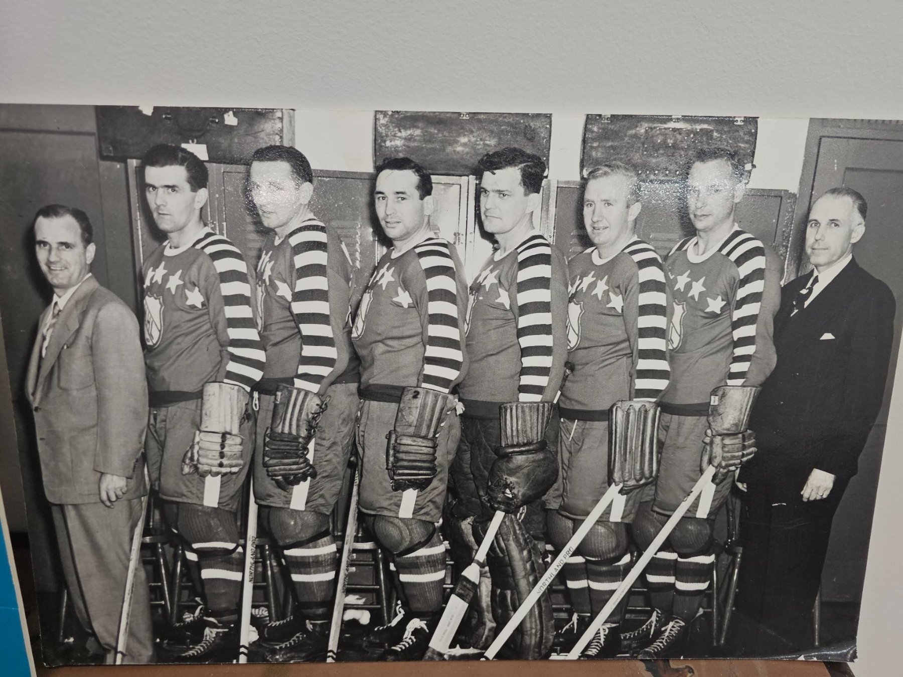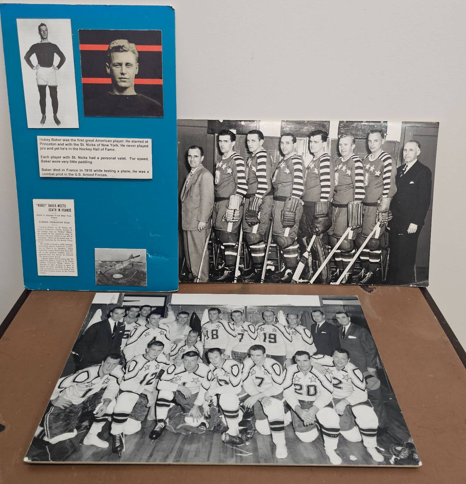 Delight hockey enthusiasts with this unique collection, including two black-and-white team photographs showcasing players in uniform with detailed equipment. Accompanied by a display board featuring historical hockey-related content and imagery, this lot brings a sense of nostalgia and sports history to your collection. A fantastic find for fans and collectors looking to preserve hockey's golden past.
