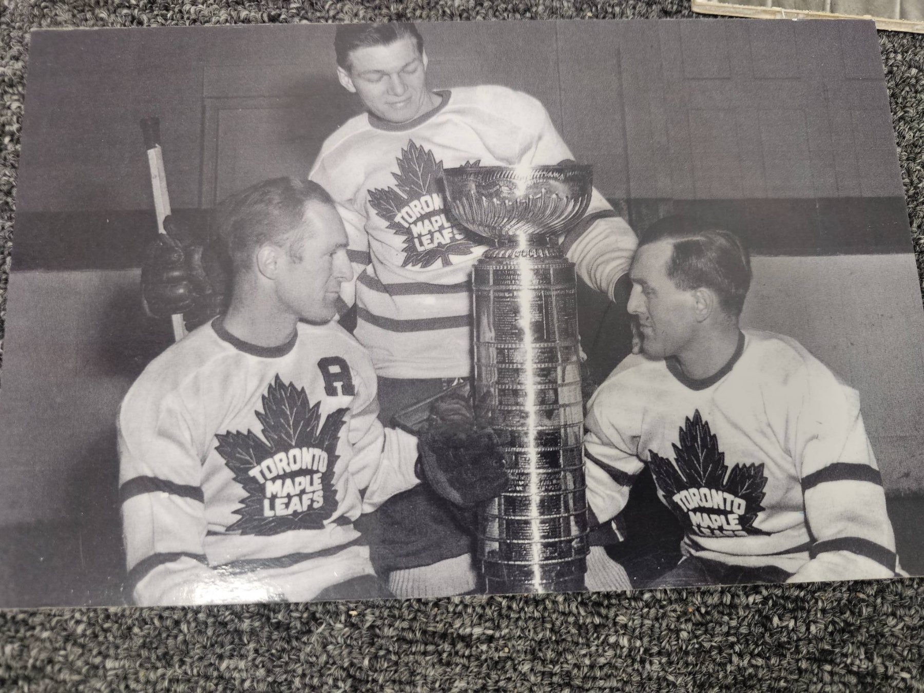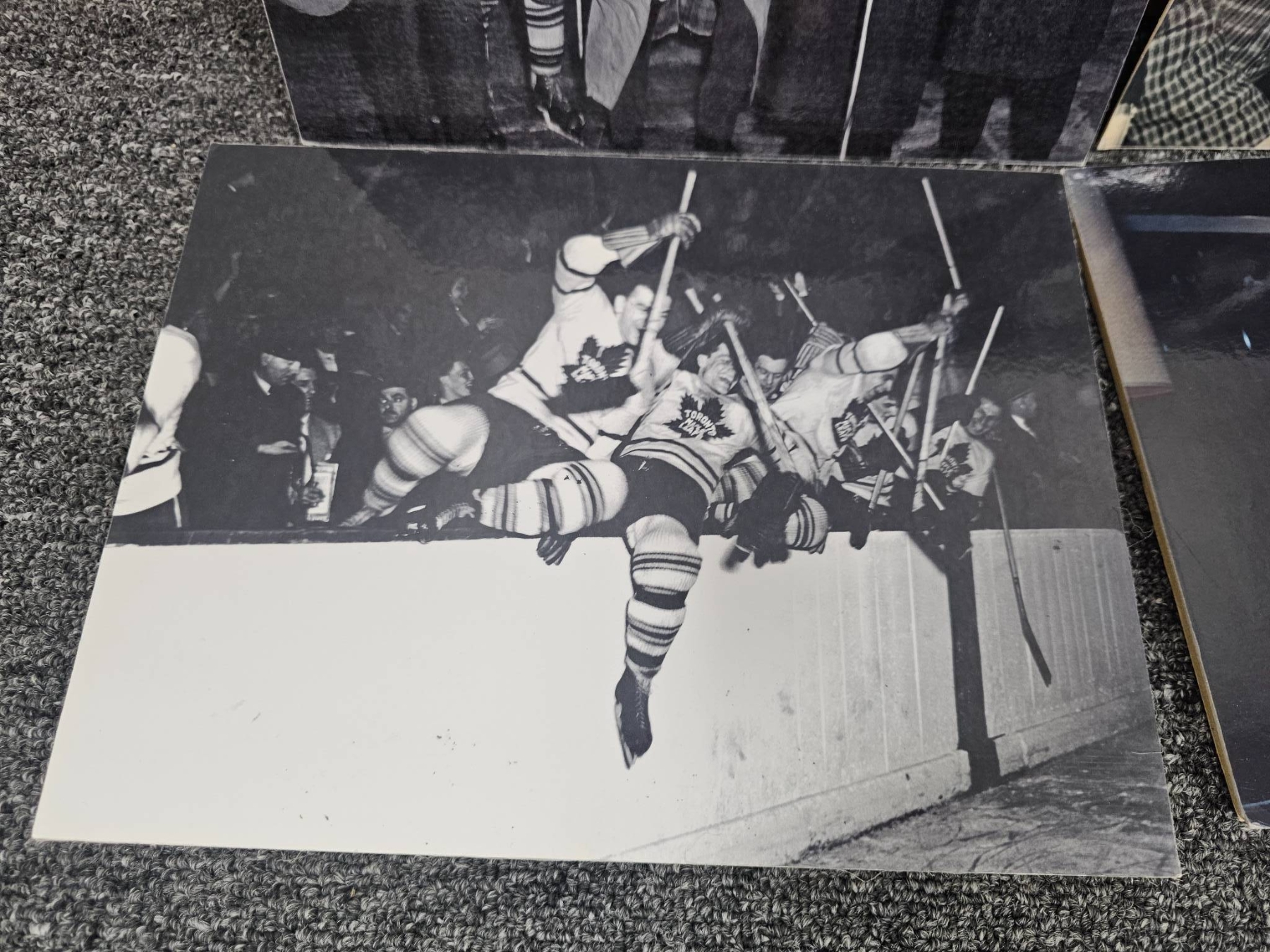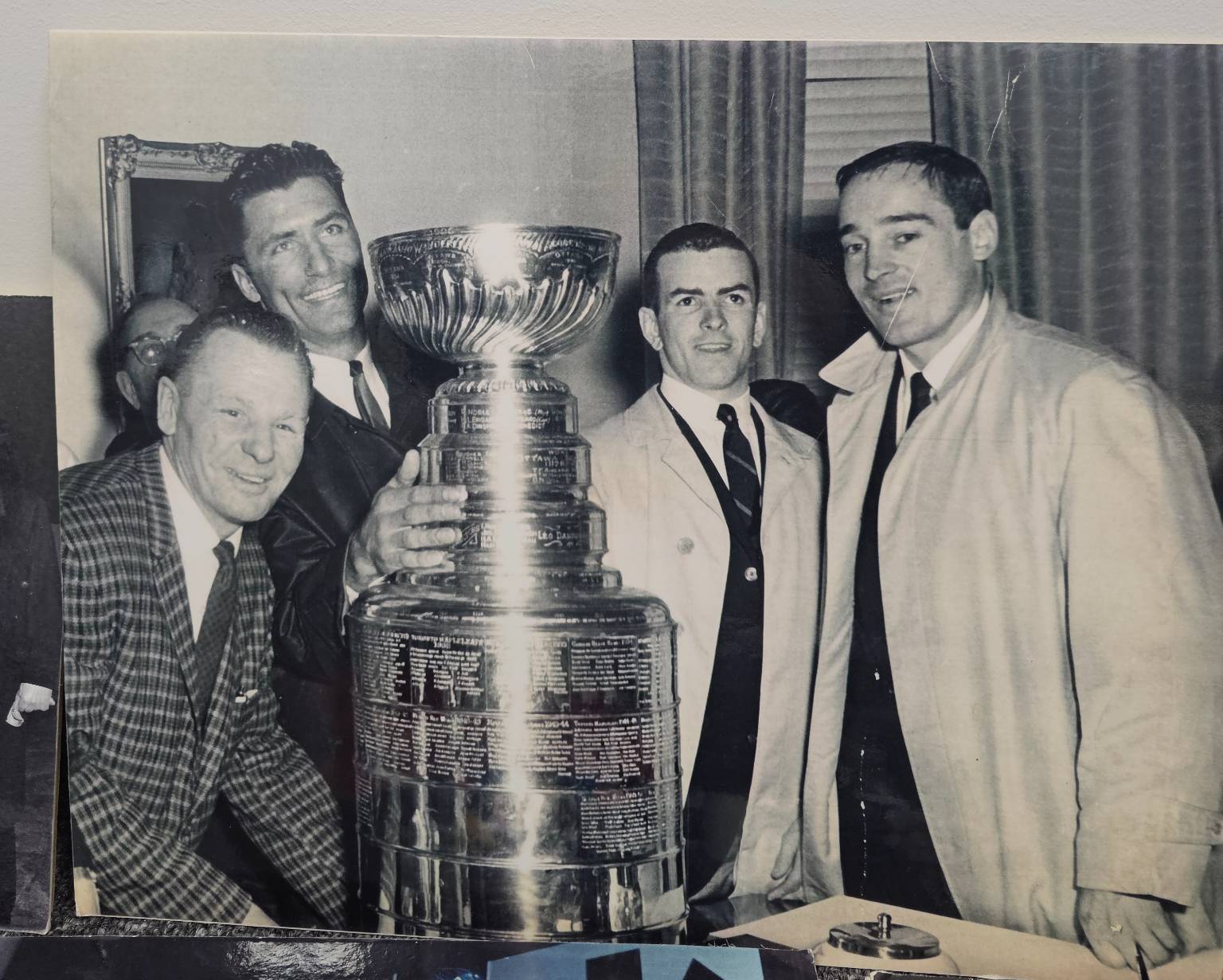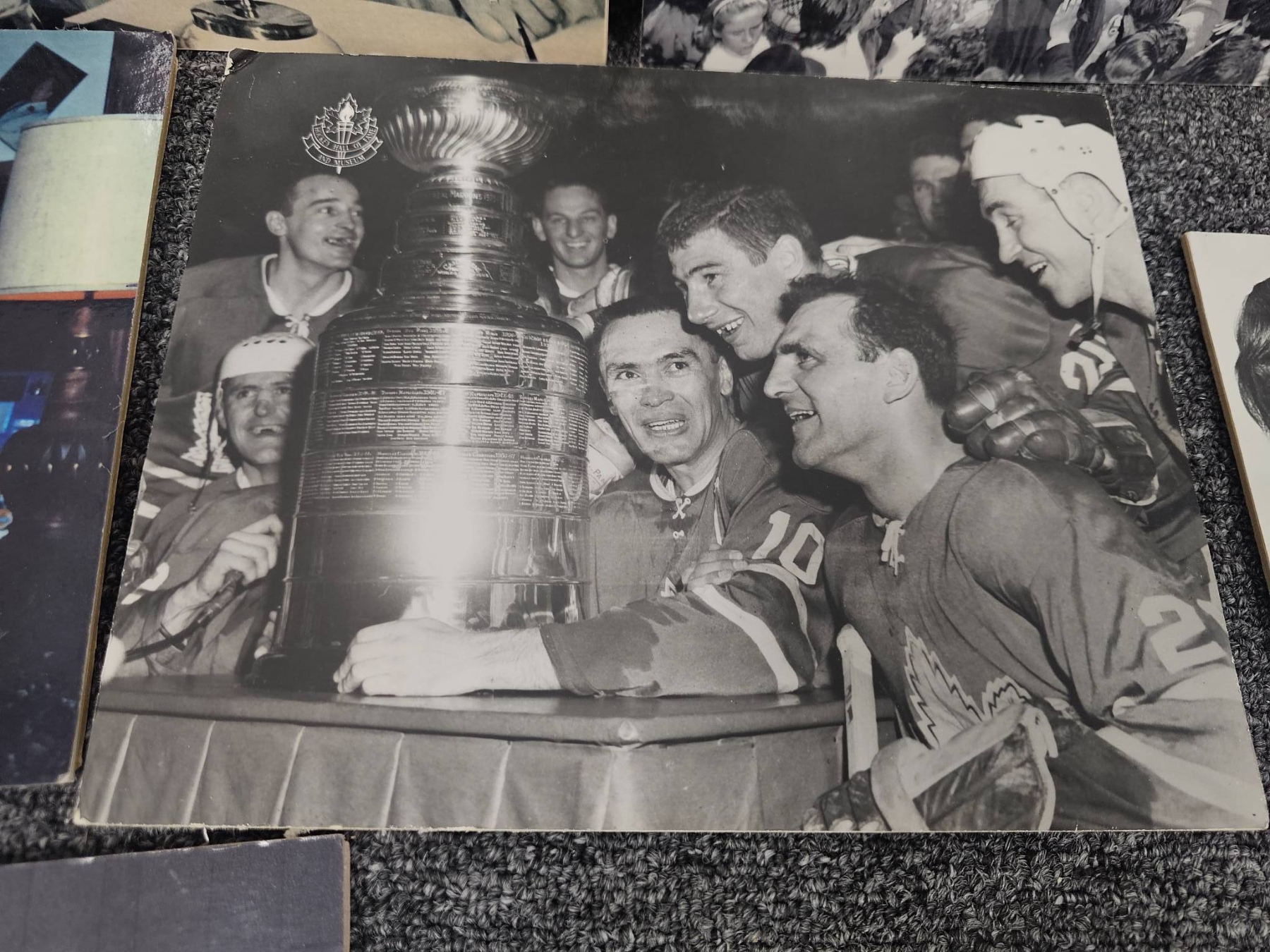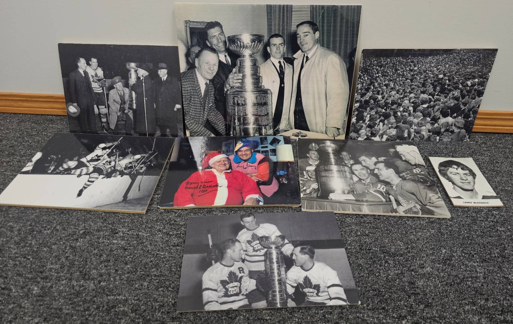 Black-and-white and color vintage hockey photos, showcasing iconic moments centered around the Stanley Cup. Includes images such as close-ups of players with the Cup, historic action shots, and crowd celebrations. One photo features Lanny McDonald. Perfect for collectors and hockey enthusiasts looking to own a piece of history.