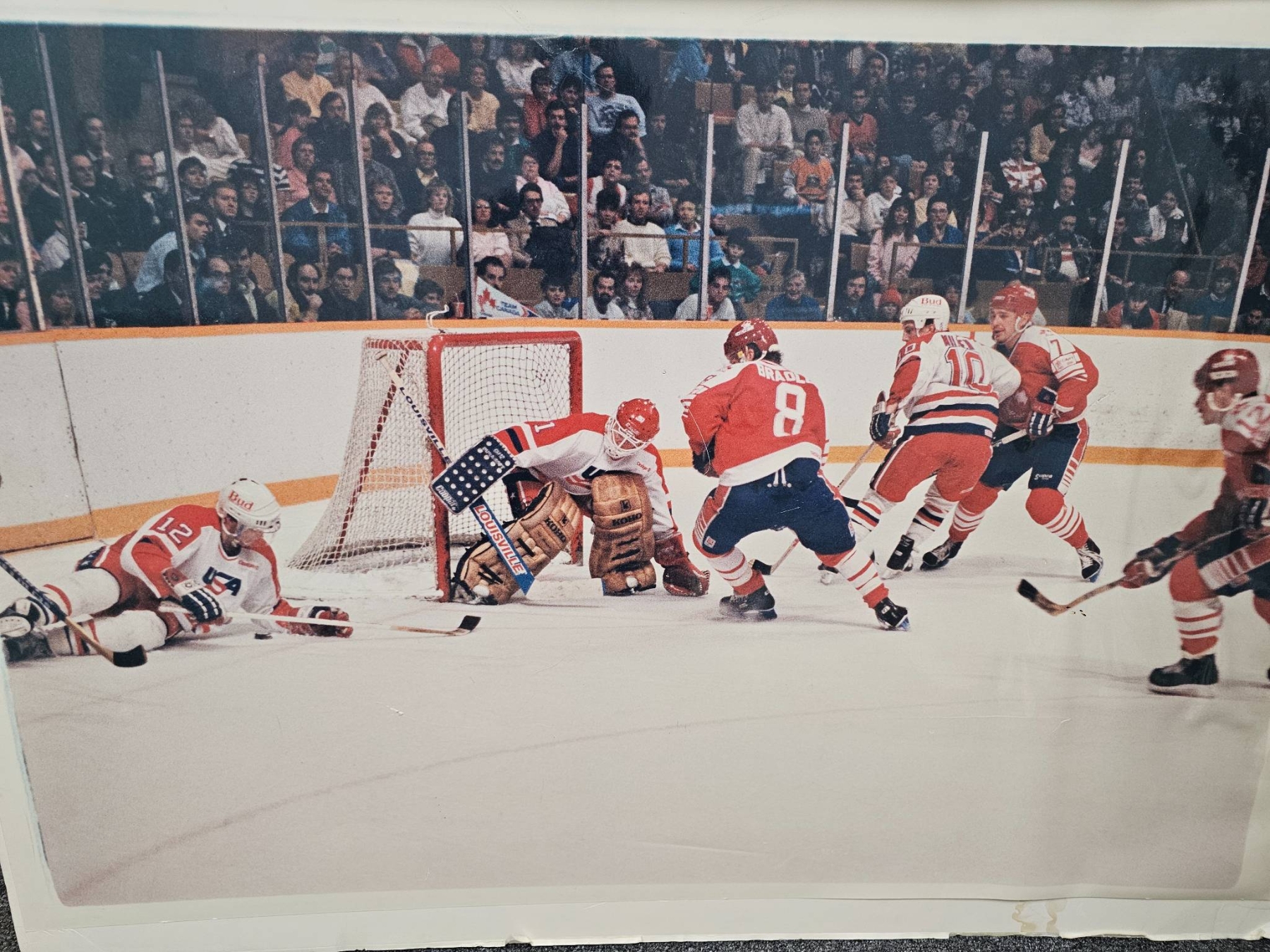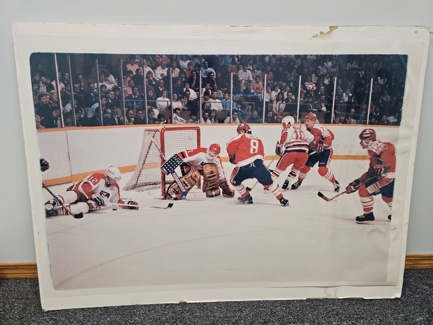 Large 40-inch wide by 29-inch tall vintage hockey print capturing a high-energy moment in an intense ice hockey game. The scene is set during active play, featuring players in colorful uniforms and an audience-filled arena in the background. Slight wear is visible along the edges, adding to its vintage character. Perfect for hockey enthusiasts or sports memorabilia collectors.