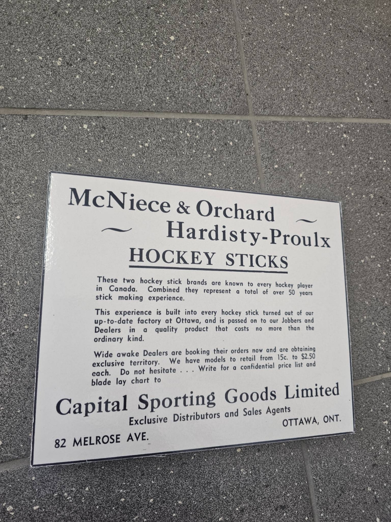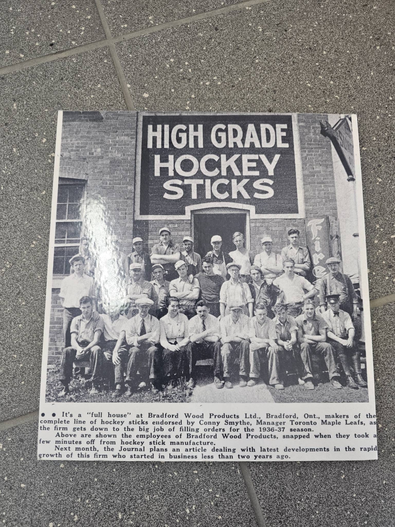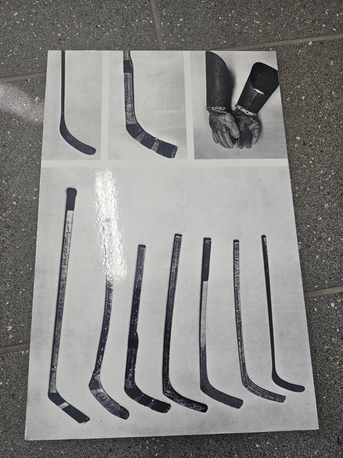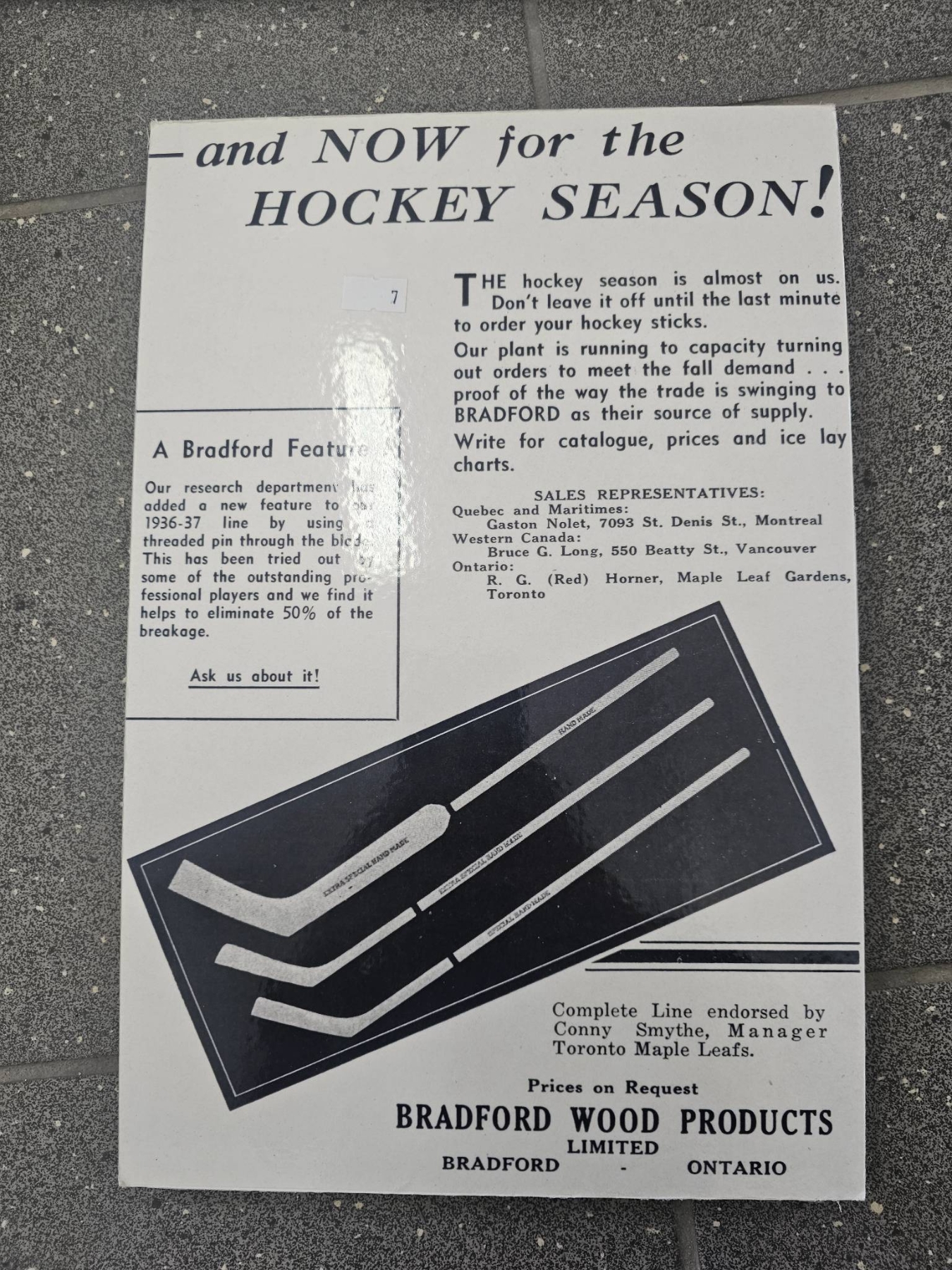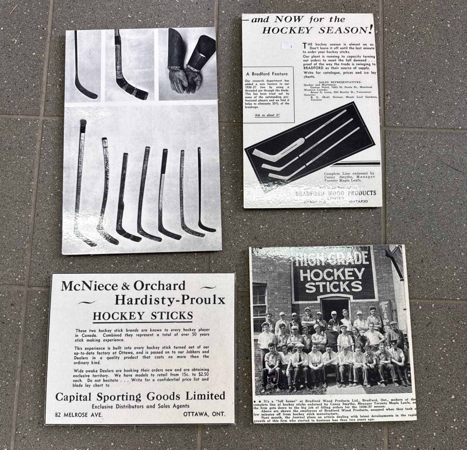 Vintage hockey stick advertisements, including promotional posters for Bradford Wood Products and McNiece & Orchard, showcasing branding and models of hockey sticks. Features historical imagery and textual promotions from the mid-20th century, with references to the Toronto Maple Leafs. Items printed in Canada and in clean condition with minor wear.