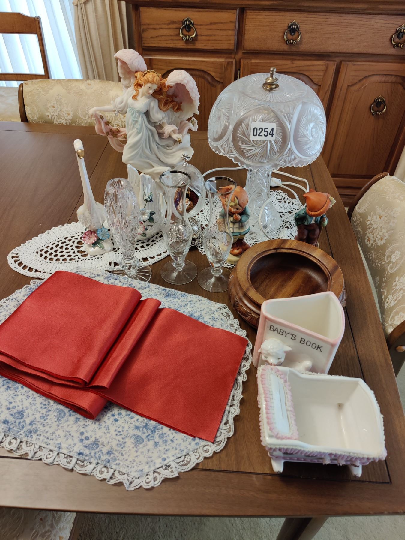 Crystal Lamp, Vases, table runner and doilies, swan and angel statues, pink baby deco and wodden bowl.