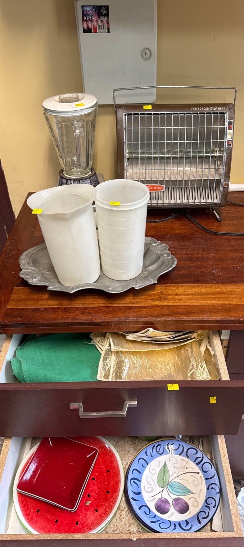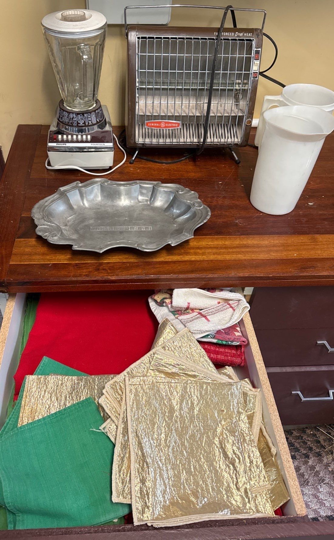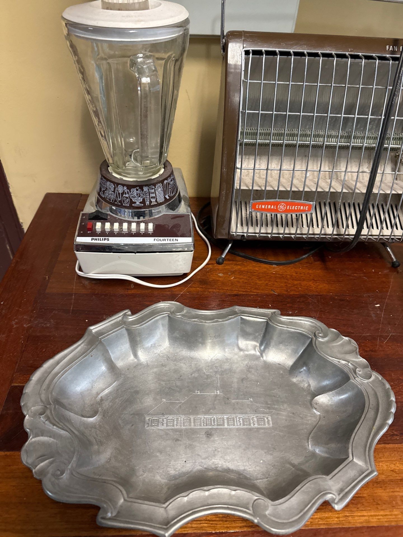 Vintage Home - Pewter Tray, General Electric Heater, Phillips Blender, Linens