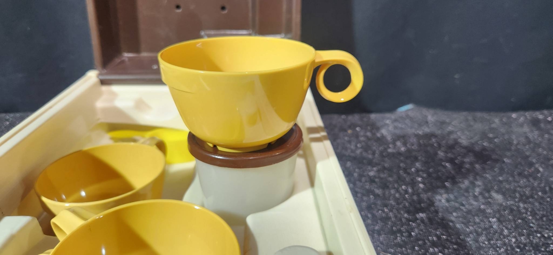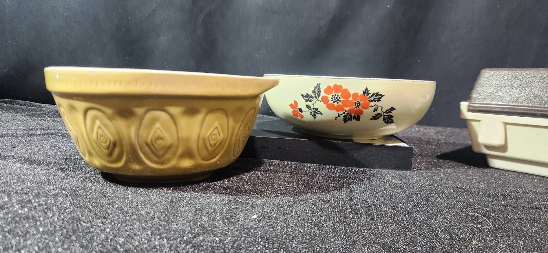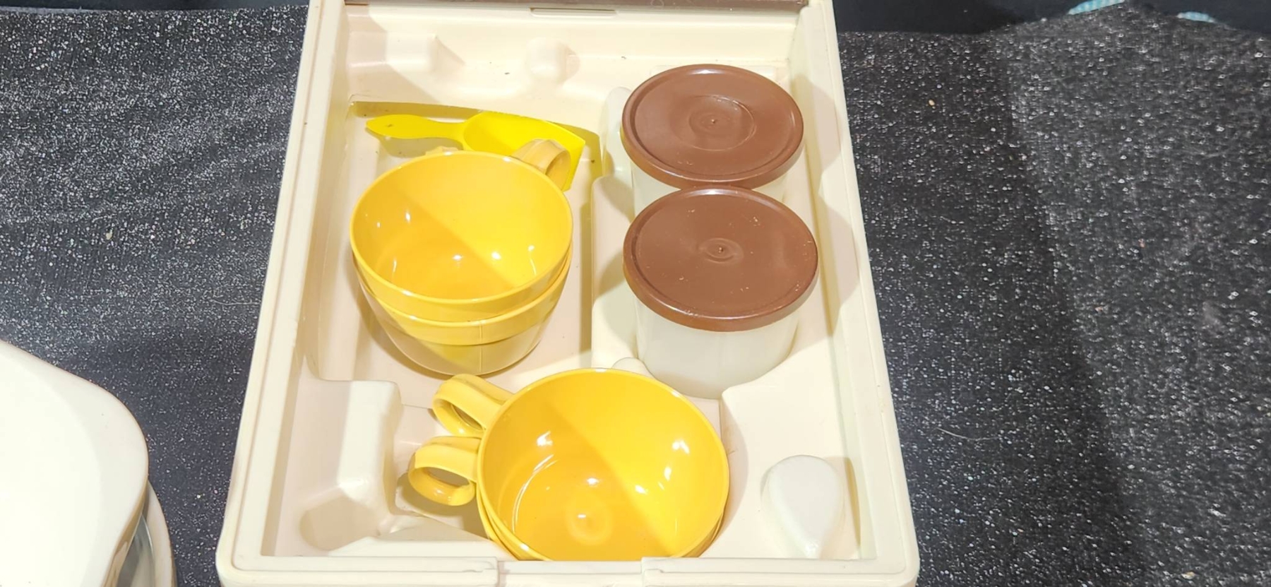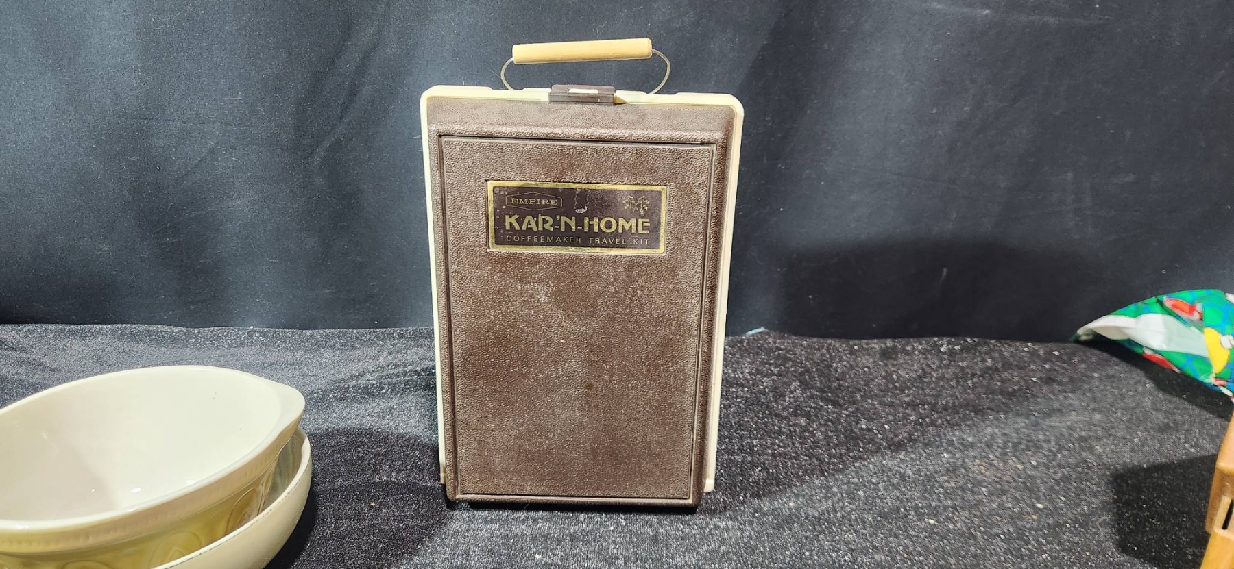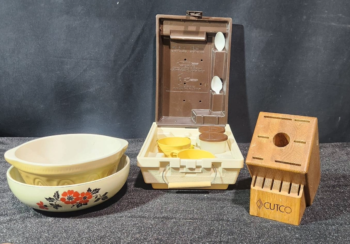 A versatile collection of vintage housewares, including a yellow ceramic bowl marked 401B and a floral bowl made in the USA, both offering a charming retro aesthetic. Also included is a Cutco knife block, ideal for compact knife storage, and a Kar-N- Home portable beverage set with yellow cups, brown lids, and a sturdy case. Perfect for collectors or those seeking functional vintage pieces.