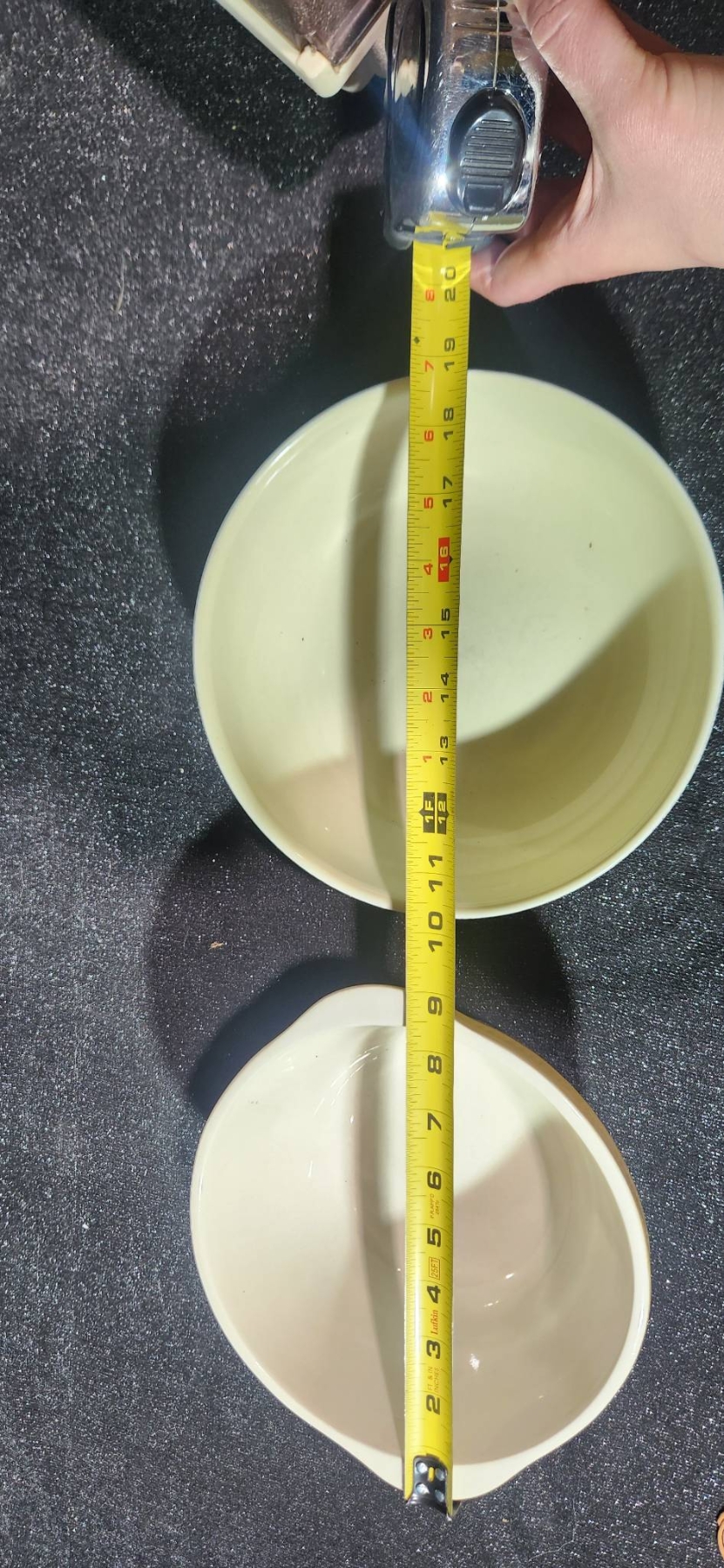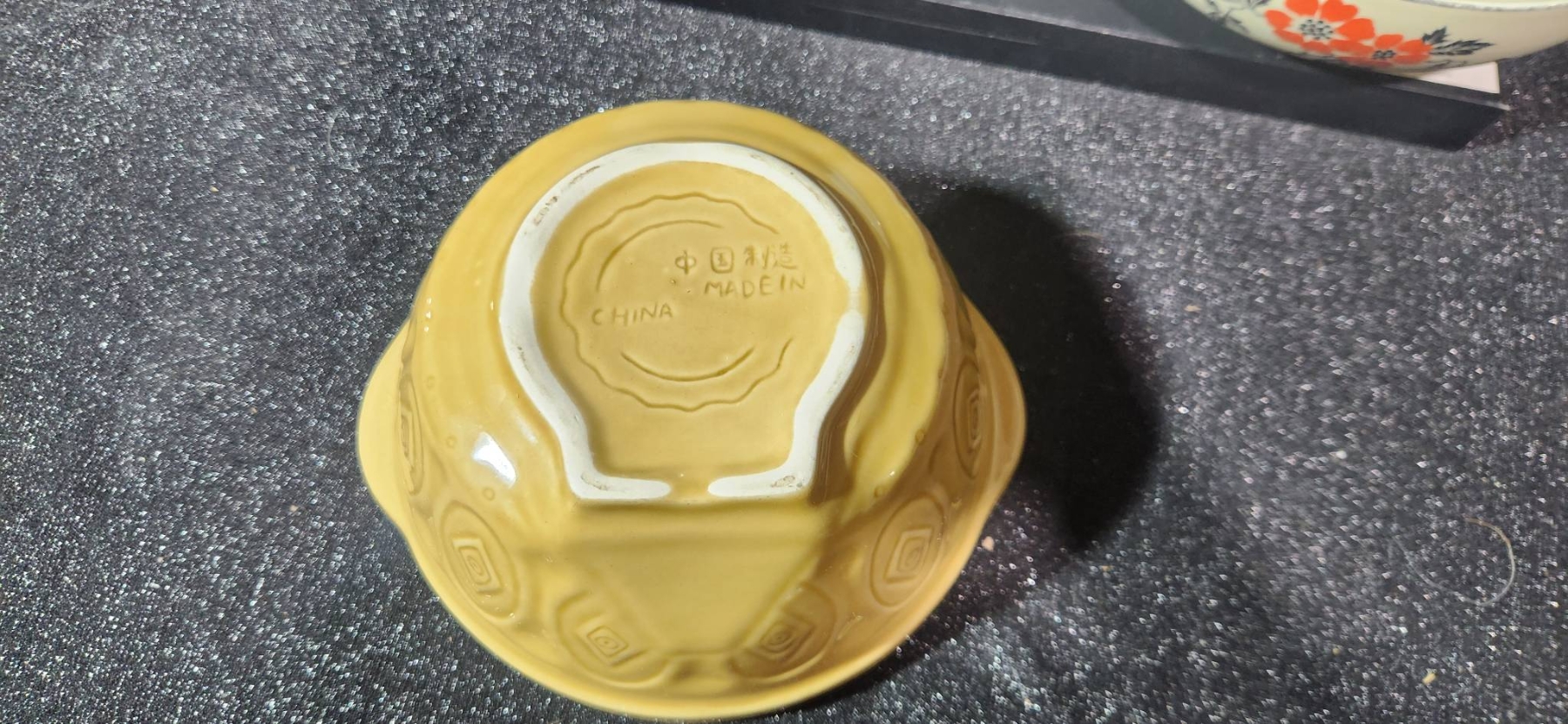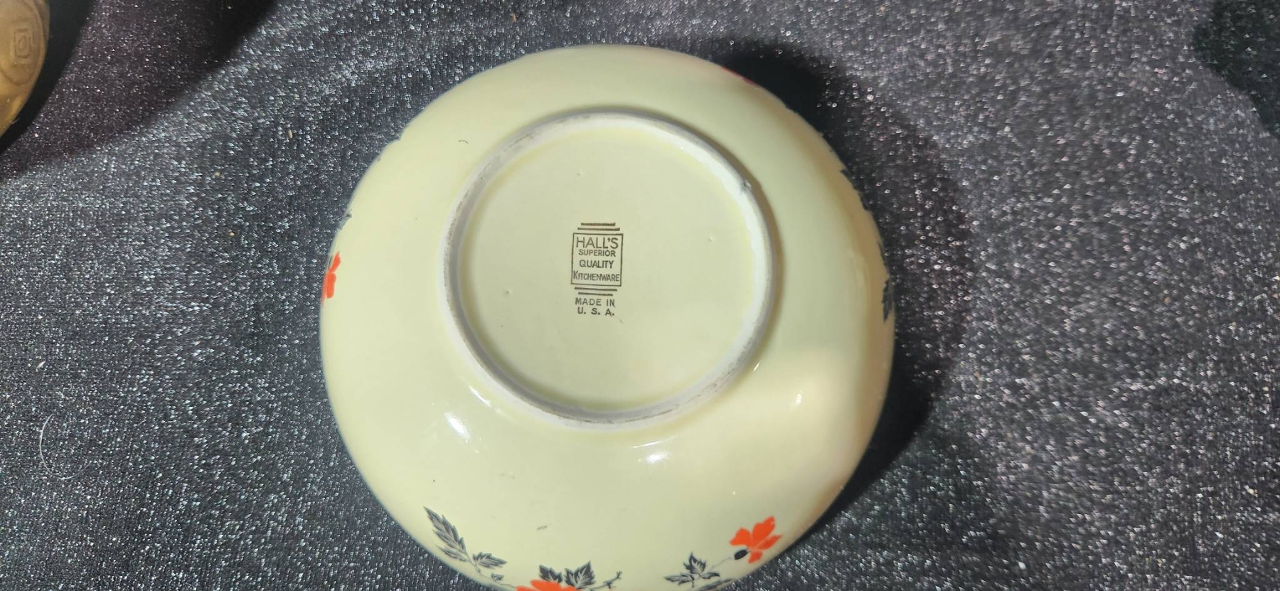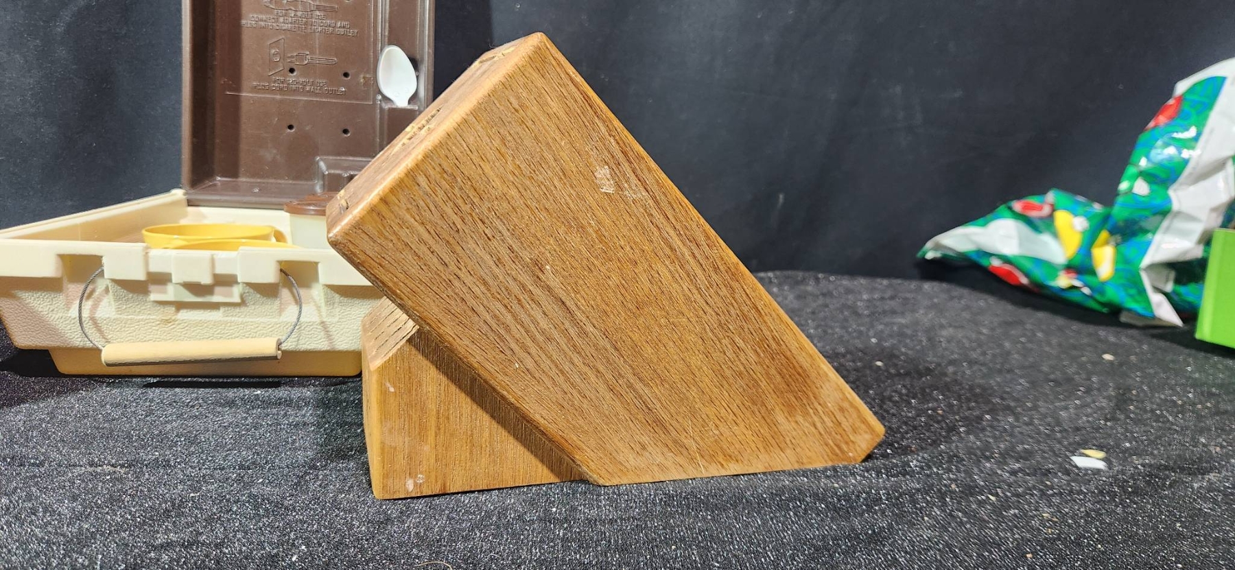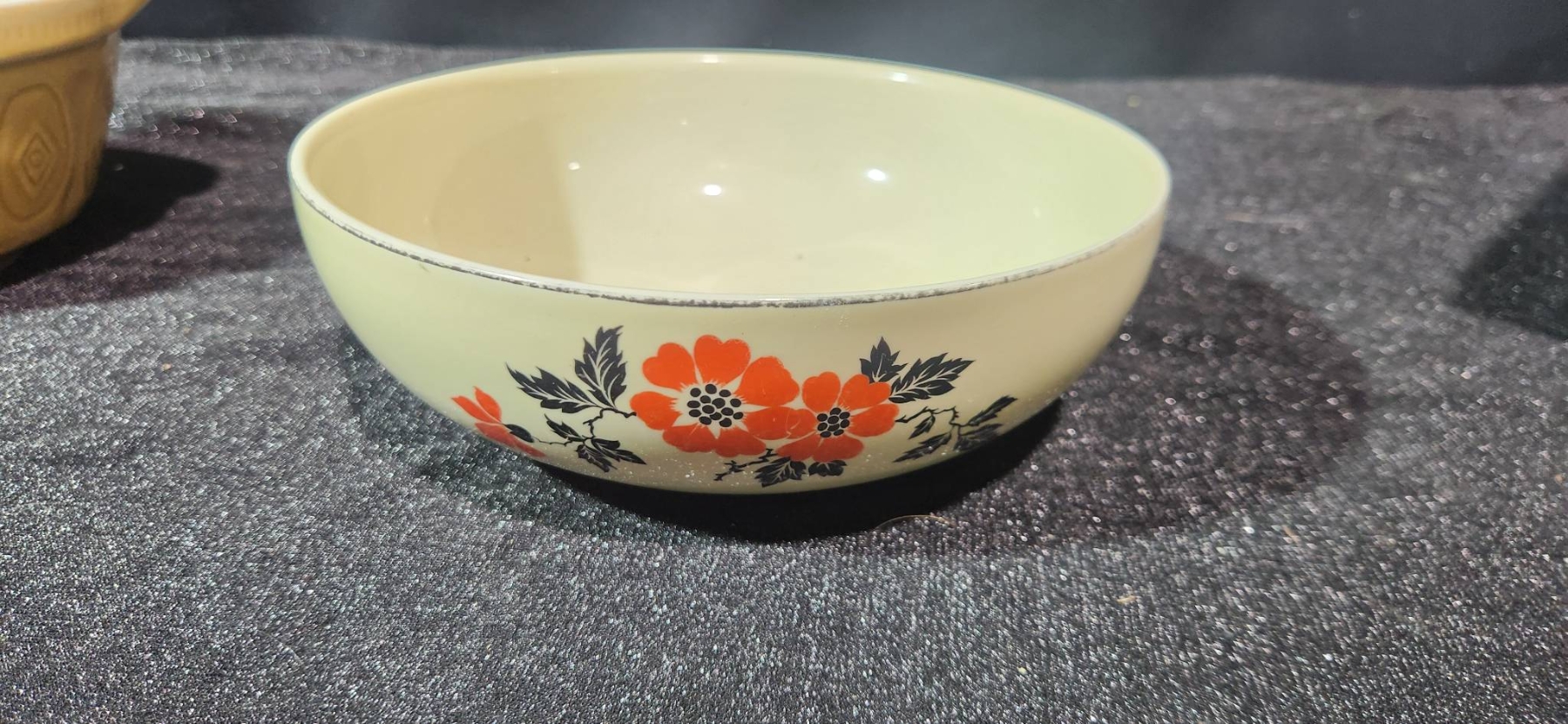 A versatile collection of vintage housewares, including a yellow ceramic bowl marked 401B and a floral bowl made in the USA, both offering a charming retro aesthetic. Also included is a Cutco knife block, ideal for compact knife storage, and a Kar-N- Home portable beverage set with yellow cups, brown lids, and a sturdy case. Perfect for collectors or those seeking functional vintage pieces.
