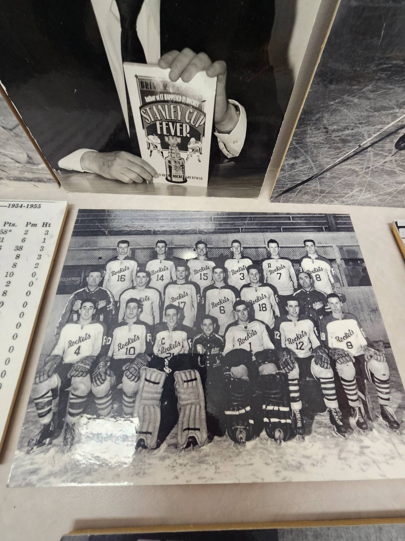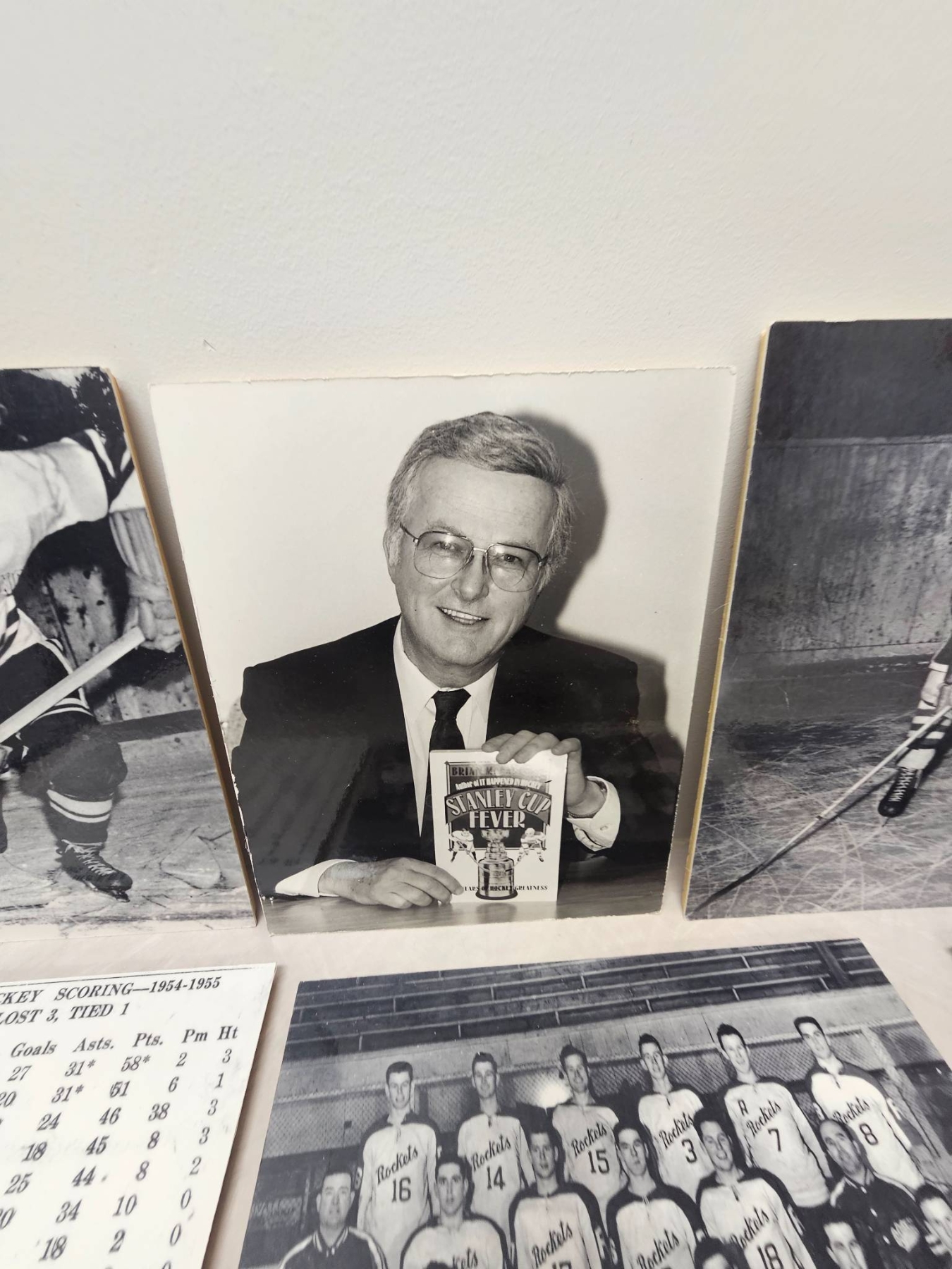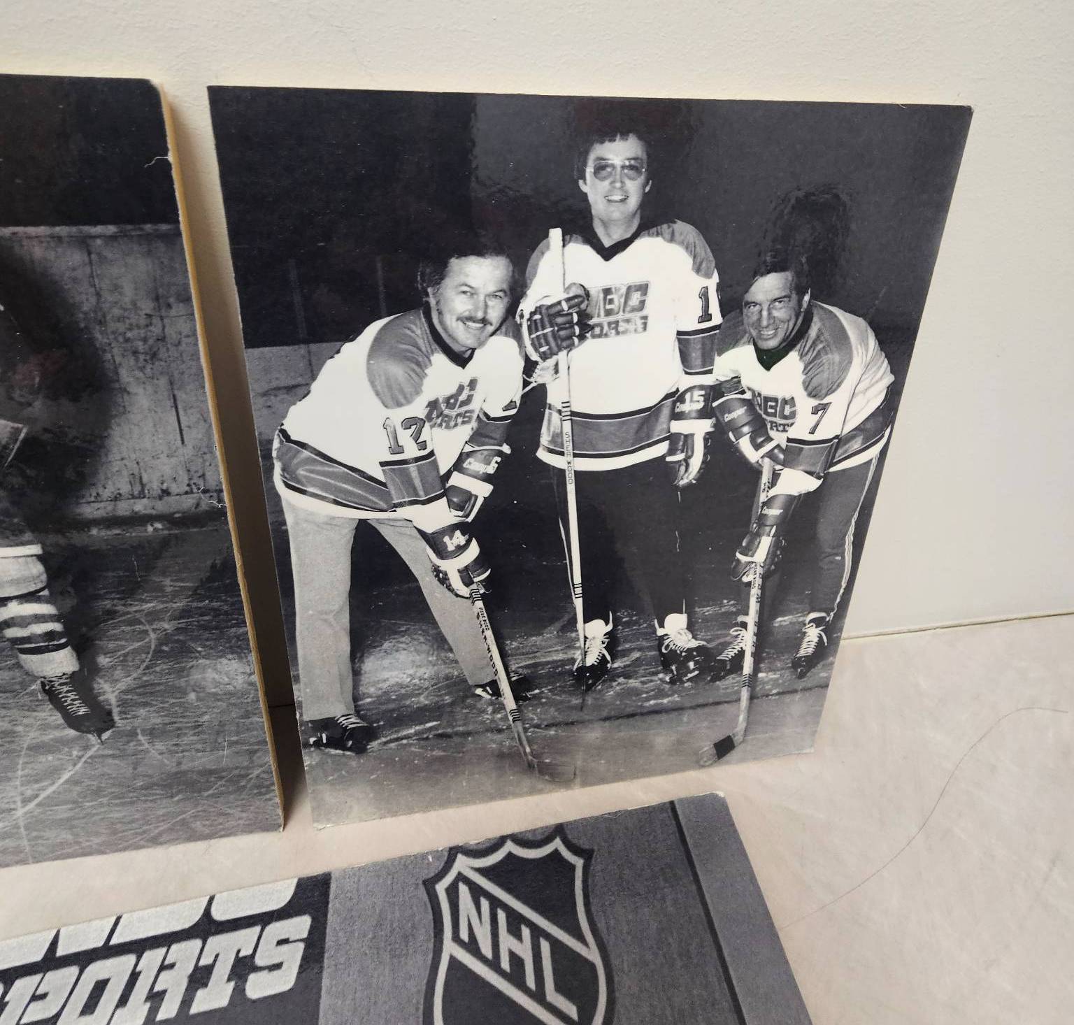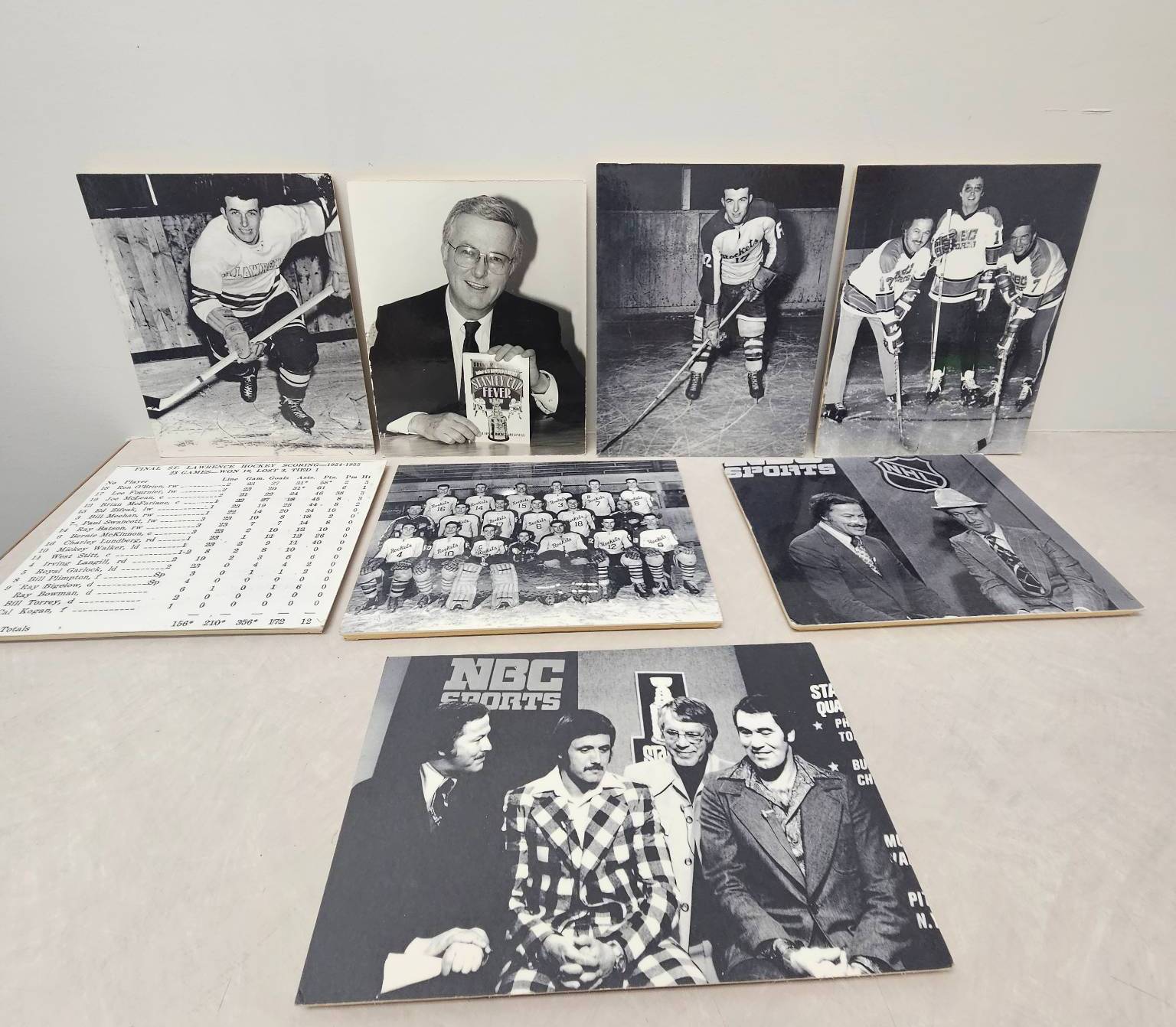 A curated lot of black-and-white photographs highlighting ice hockey history. Includes action shots, team photos, NBC Sports coverage images, and a stats sheet detailing St. Lawrence Hockey scoring from 1954-1955. These photographs capture moments spanning players, commentary, and publications, offering a nostalgic glimpse into hockey's classic era. A must-have for enthusiasts and collectors of sports memorabilia.