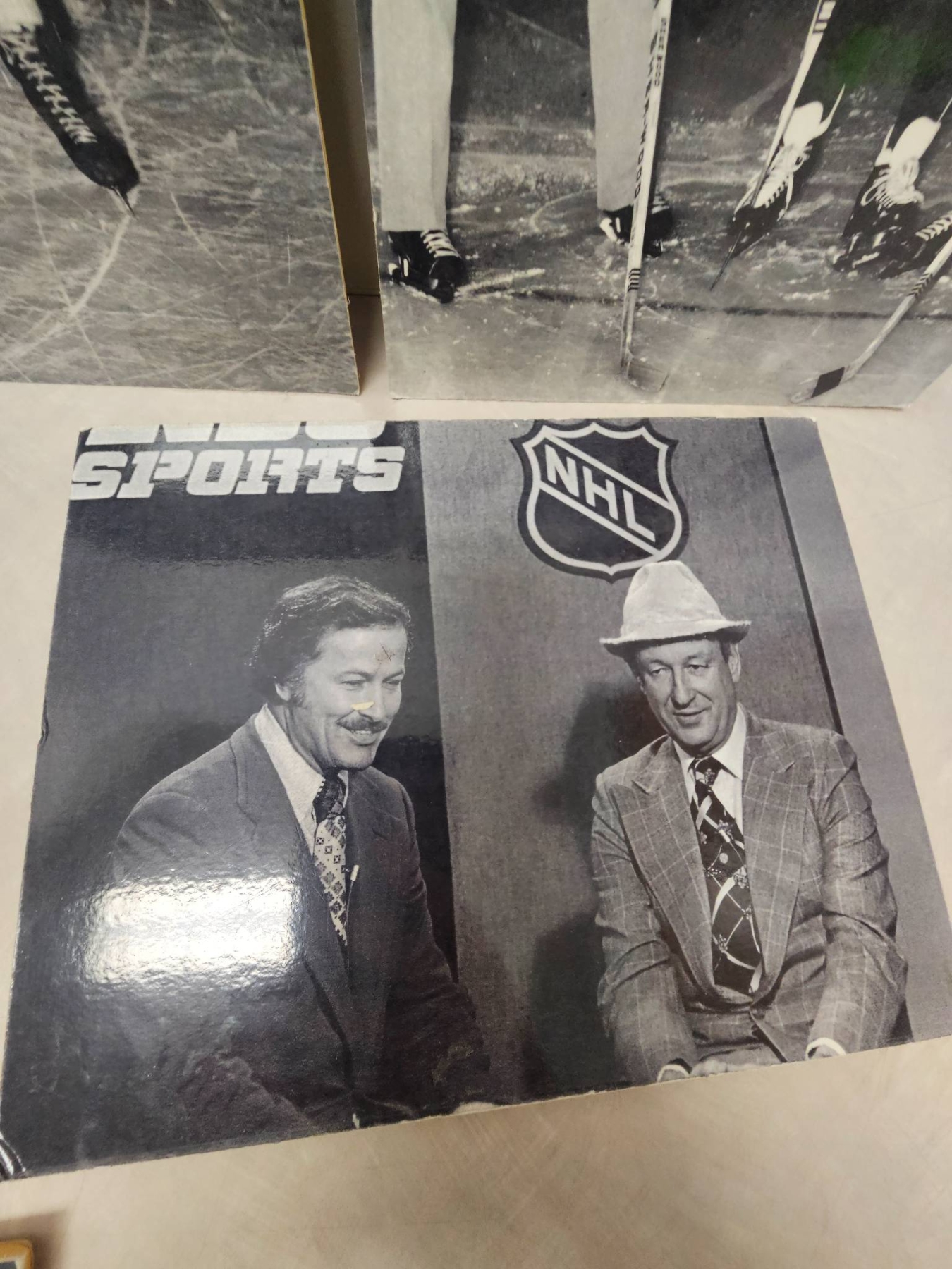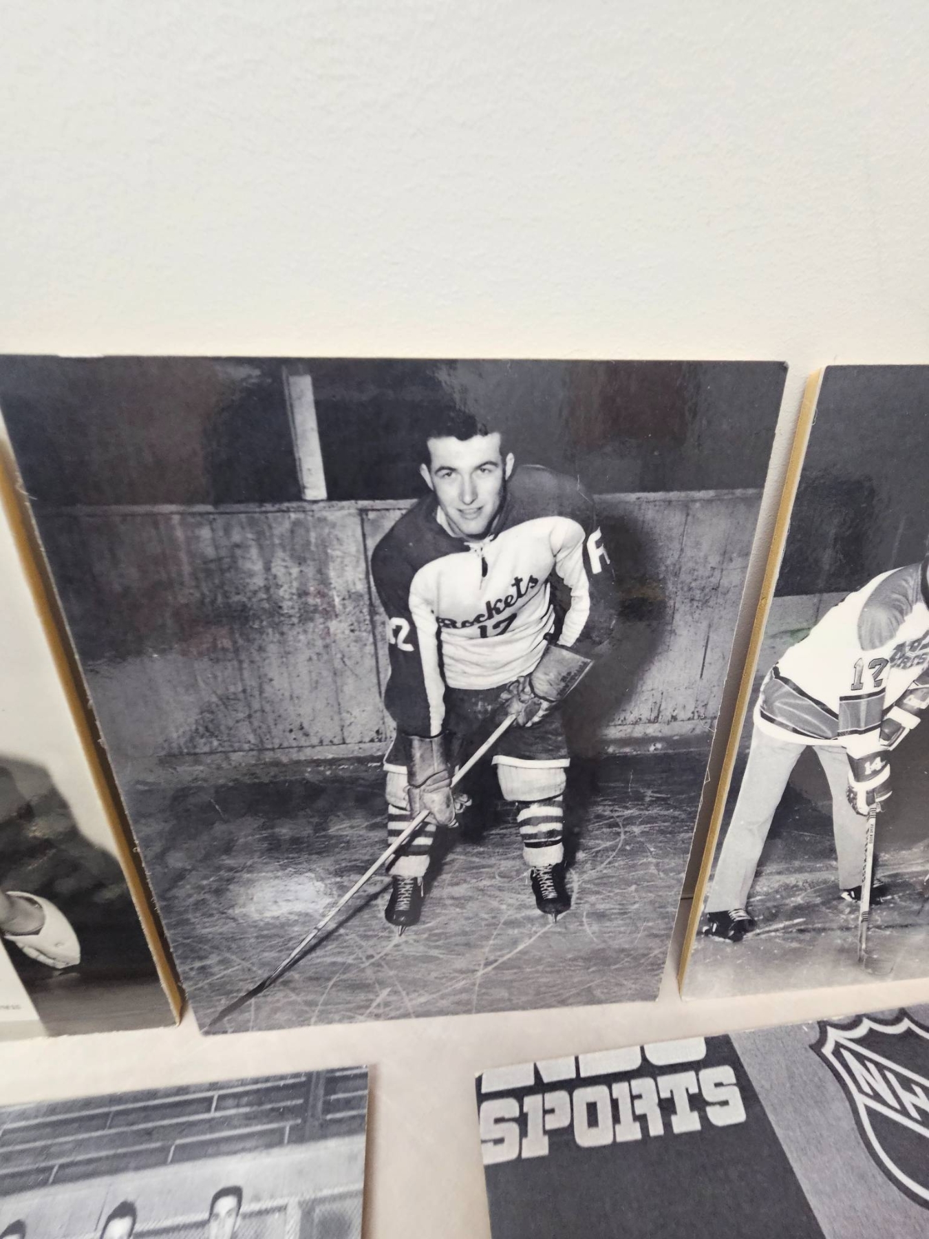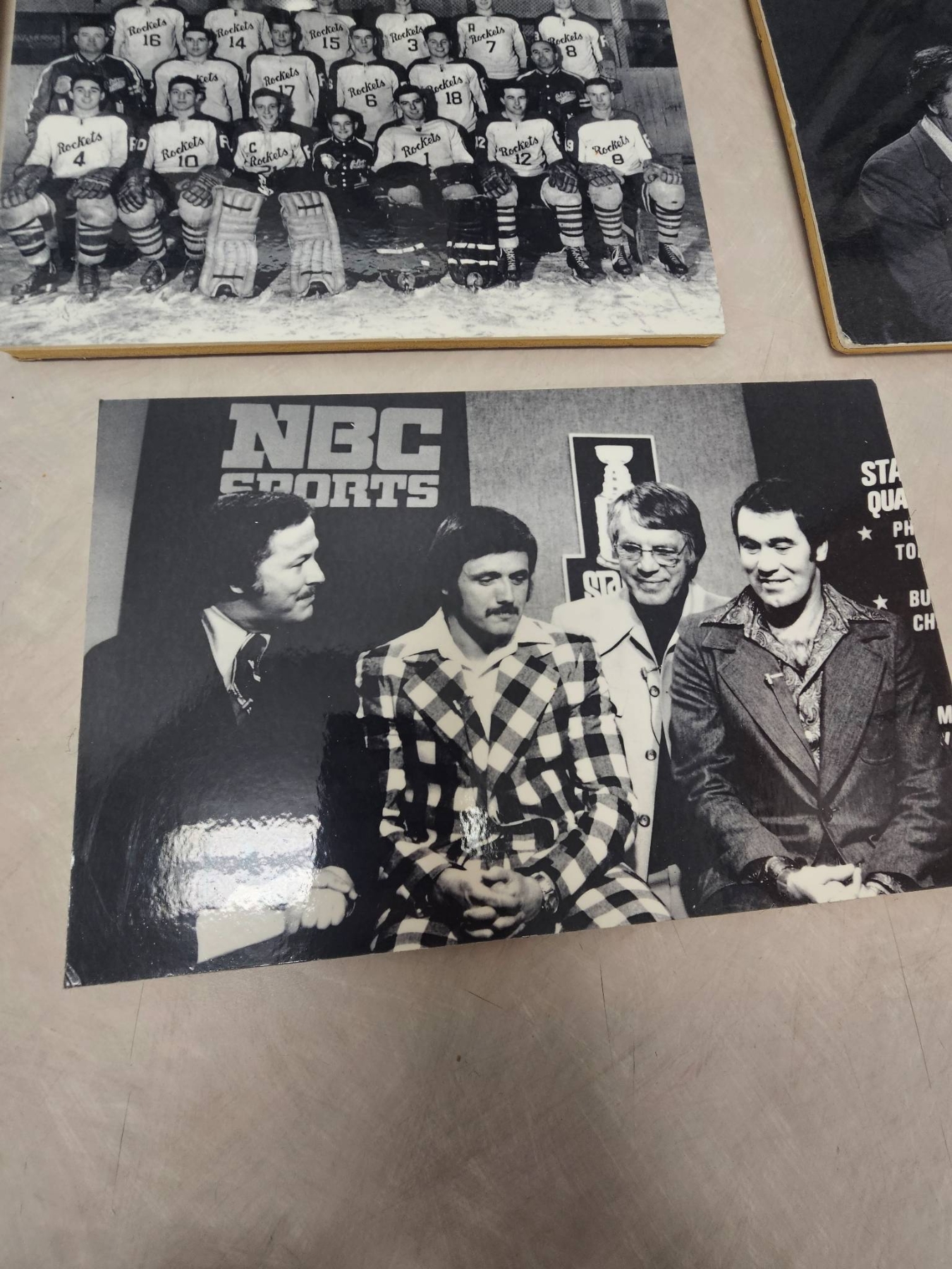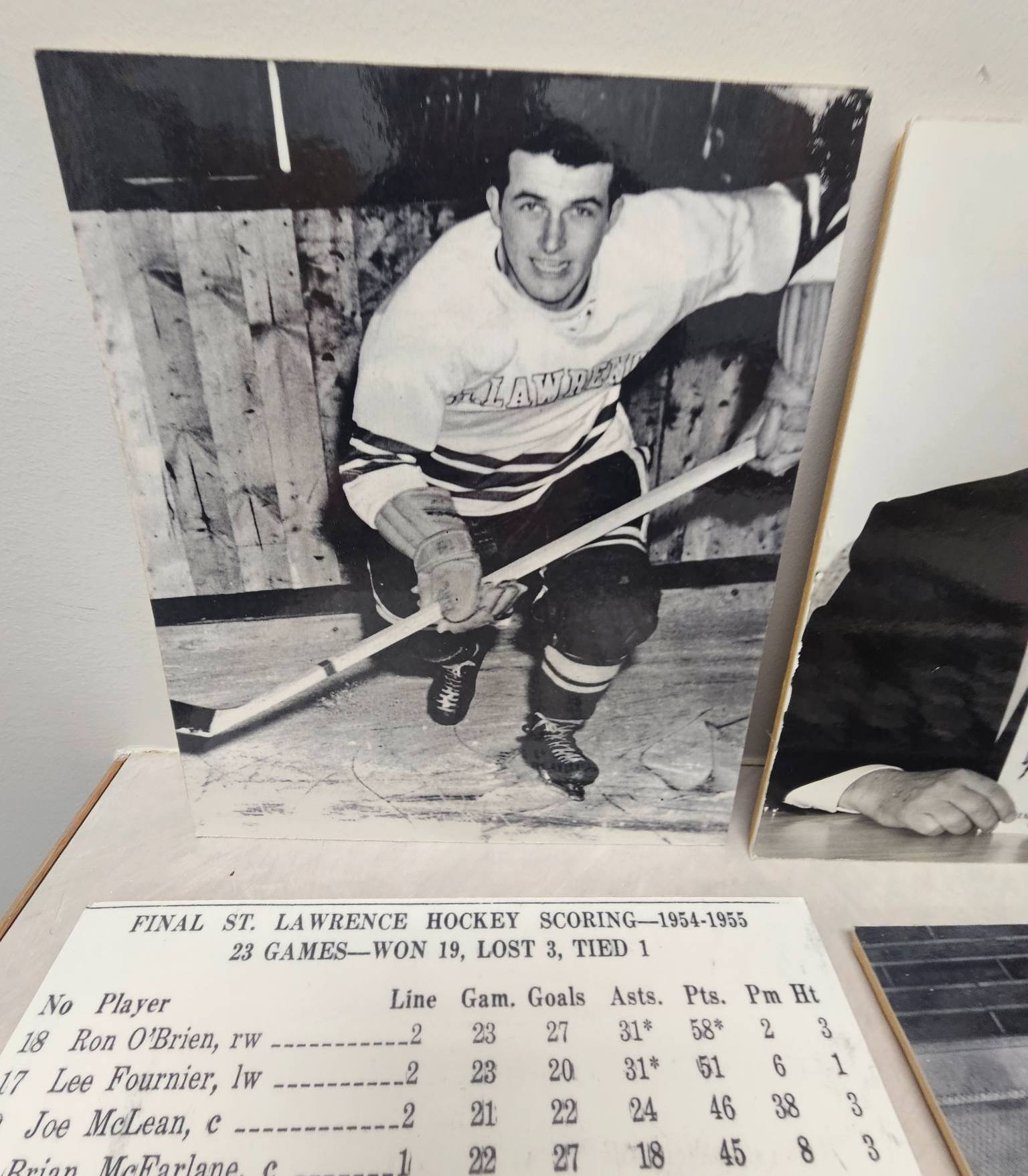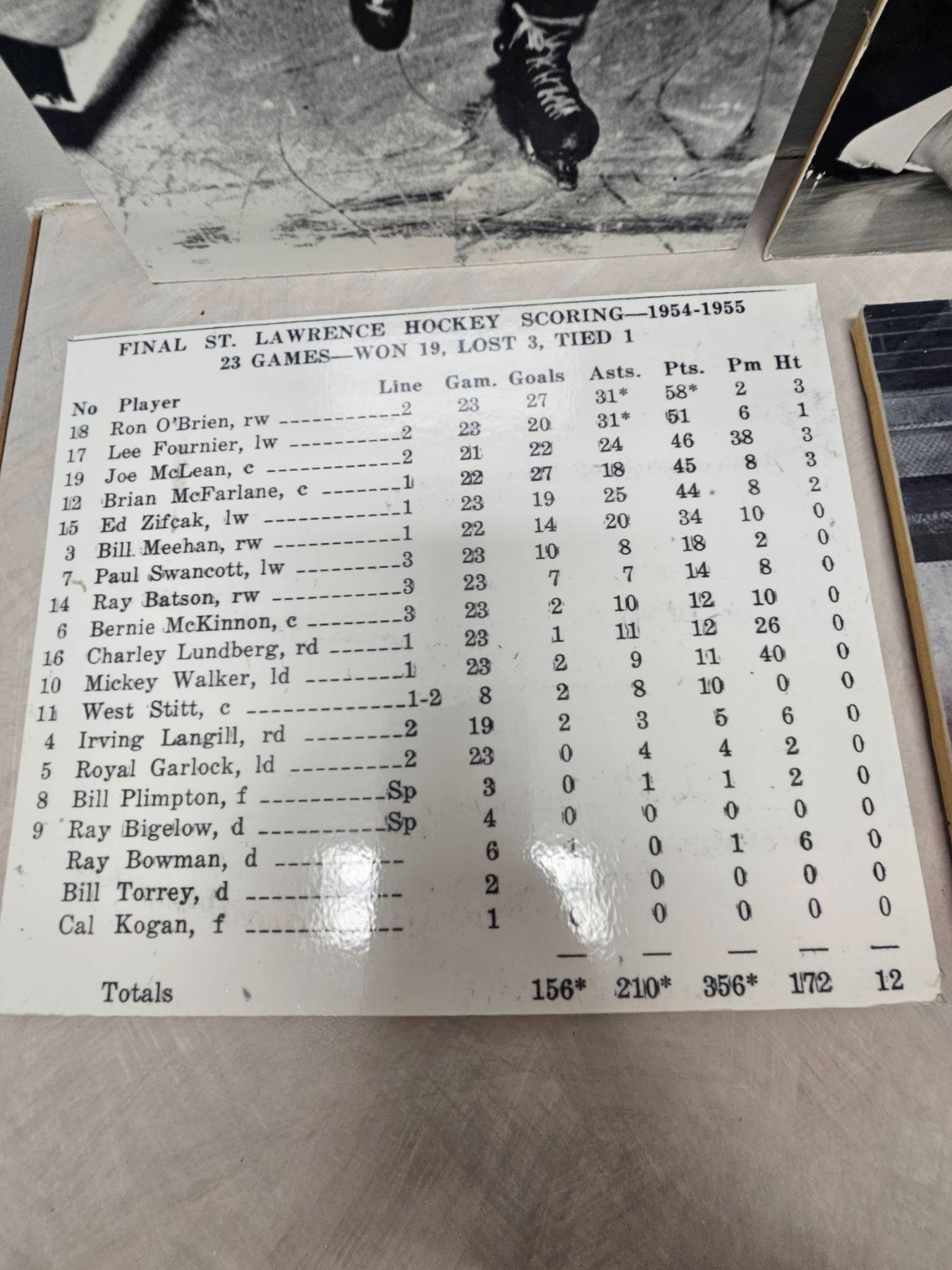 A curated lot of black-and-white photographs highlighting ice hockey history. Includes action shots, team photos, NBC Sports coverage images, and a stats sheet detailing St. Lawrence Hockey scoring from 1954-1955. These photographs capture moments spanning players, commentary, and publications, offering a nostalgic glimpse into hockey's classic era. A must-have for enthusiasts and collectors of sports memorabilia.