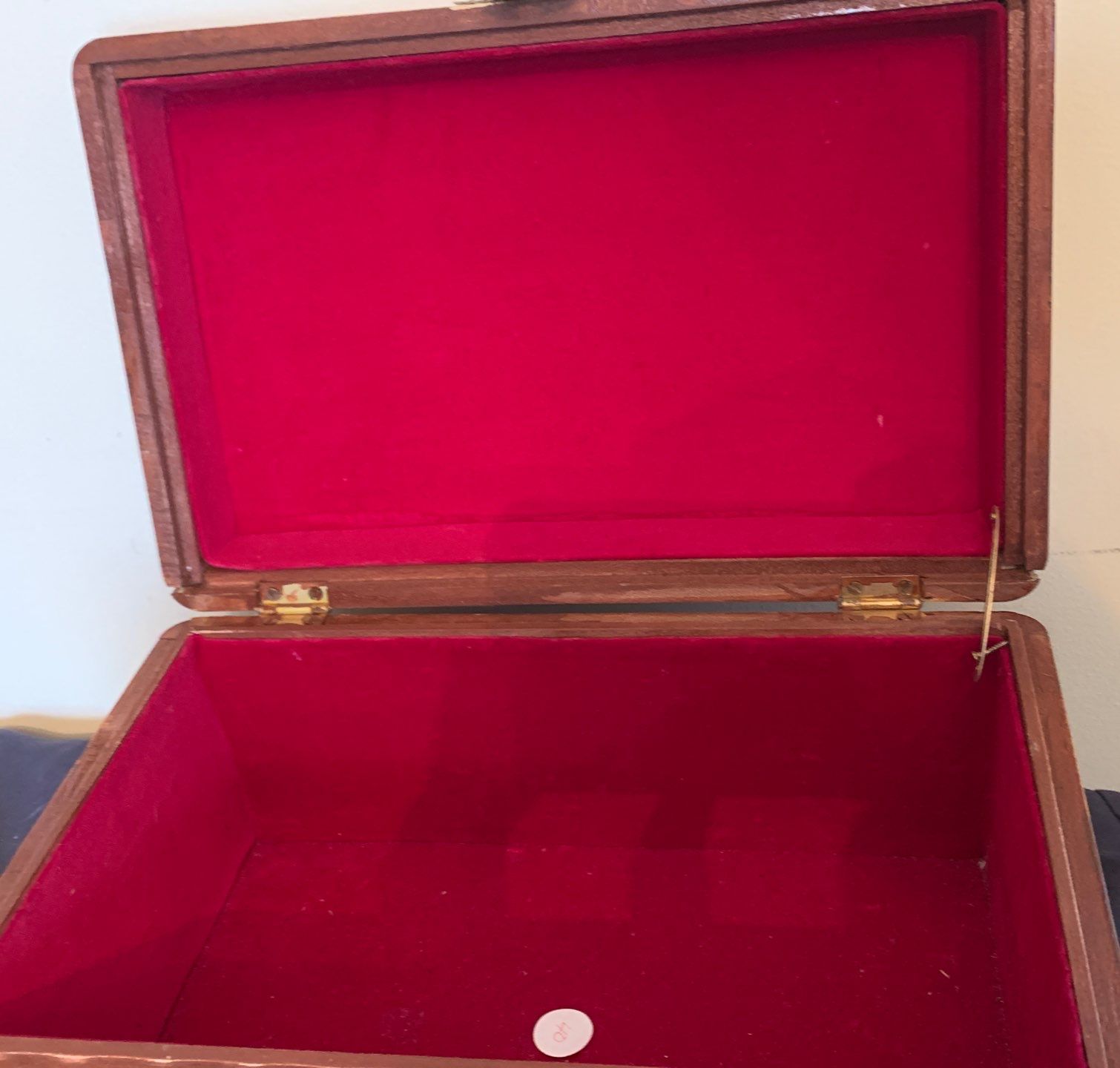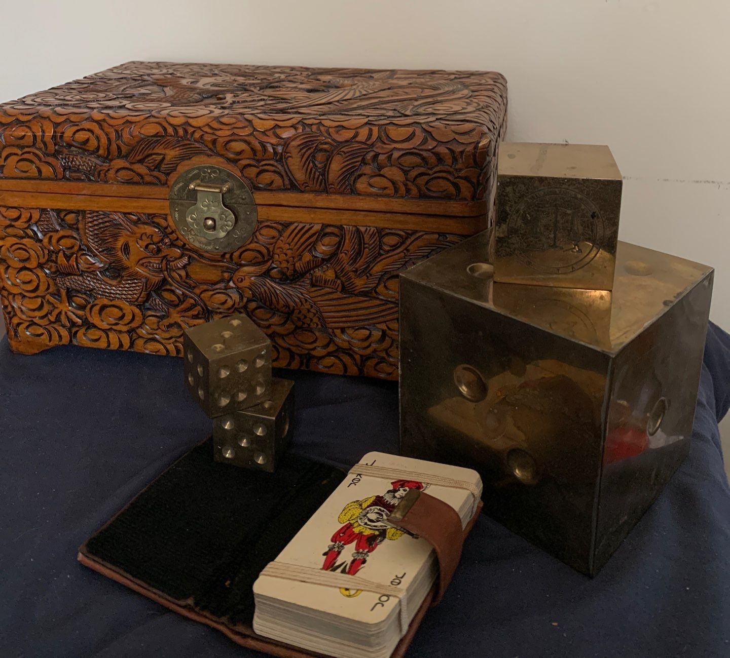 Vintage Intricate Carved Jewelry Box w/ Brass Dice, Cards & More