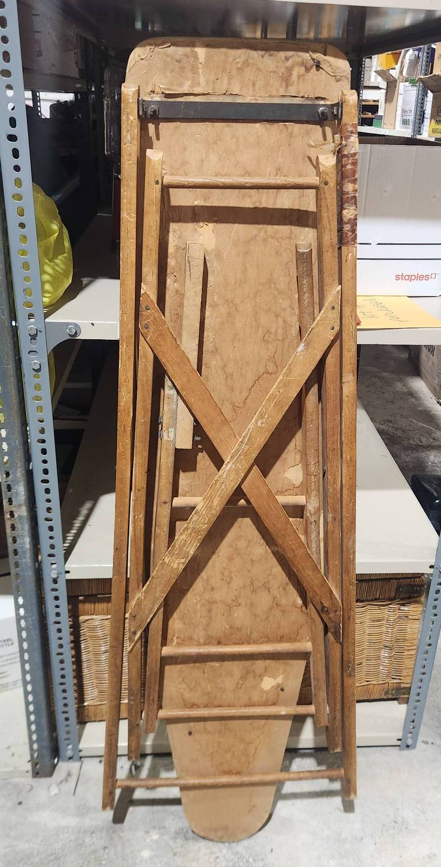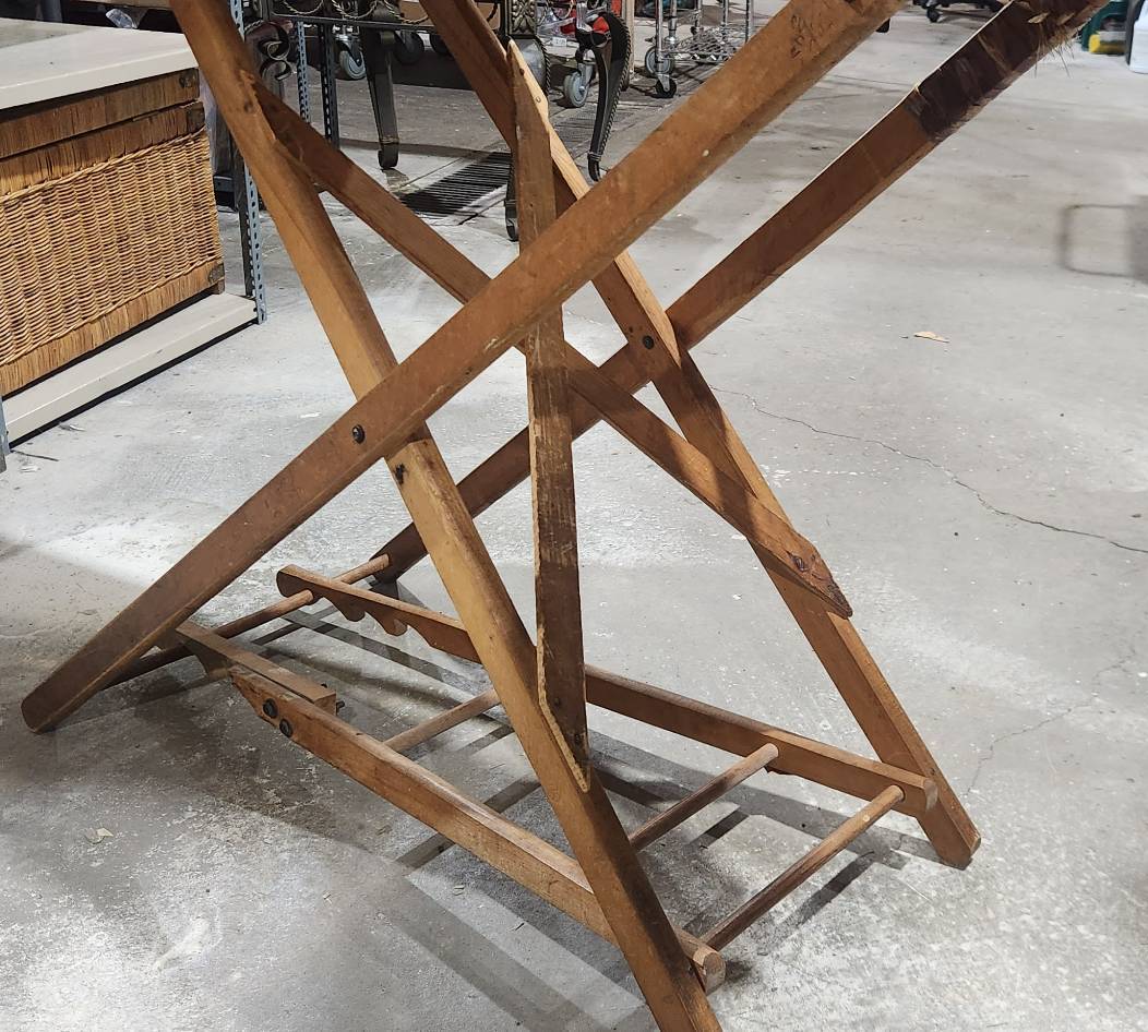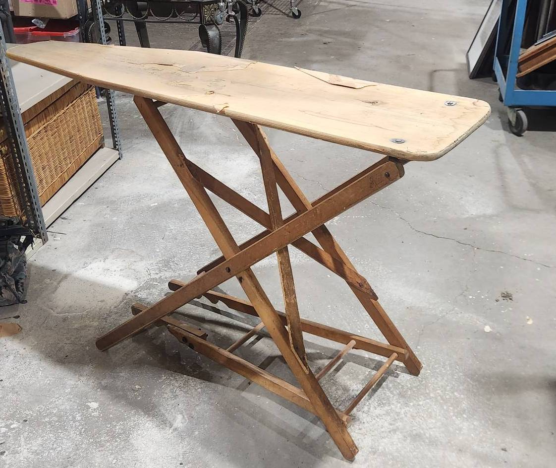 Vintage folding wooden ironing board with signs of wear and chipping on the top, presenting an opportunity for a refinishing project. Features a sturdy wood construction, foldable legs, and a well-worn top surface. Ideal for restoration enthusiasts or for repurposing. Functional mechanics appear intact.