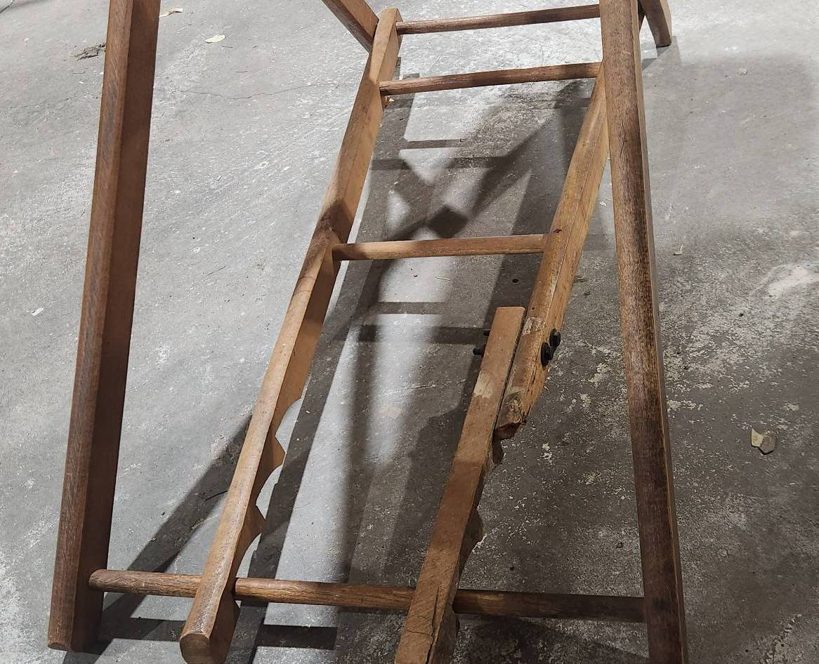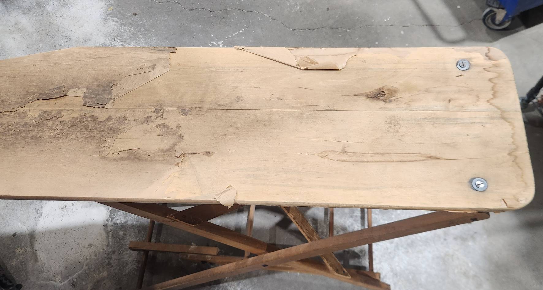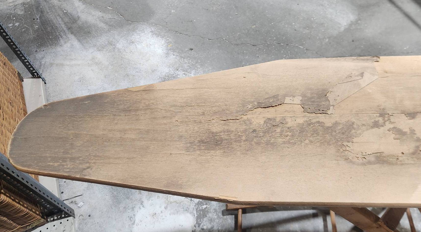 Vintage folding wooden ironing board with signs of wear and chipping on the top, presenting an opportunity for a refinishing project. Features a sturdy wood construction, foldable legs, and a well-worn top surface. Ideal for restoration enthusiasts or for repurposing. Functional mechanics appear intact.
