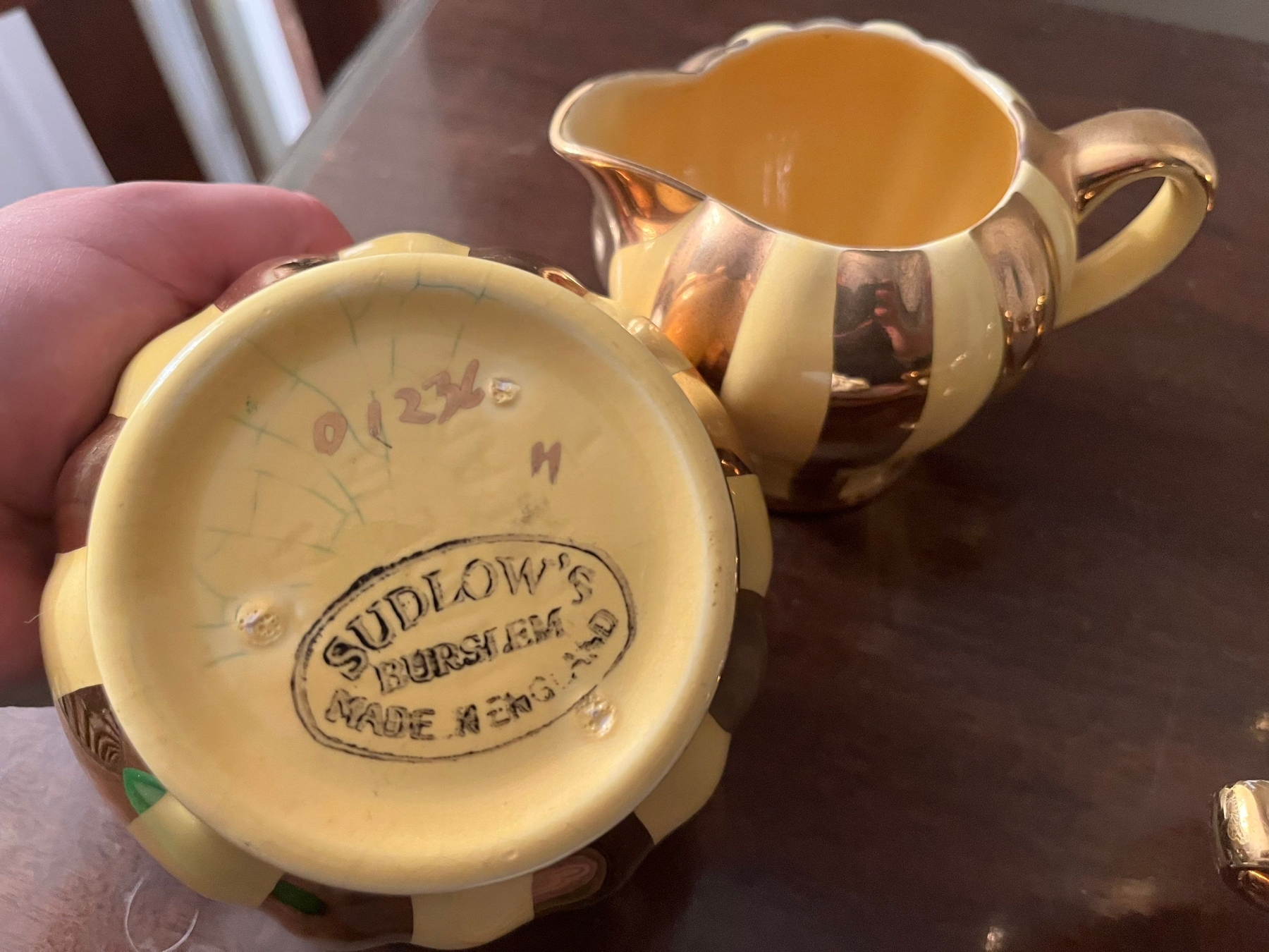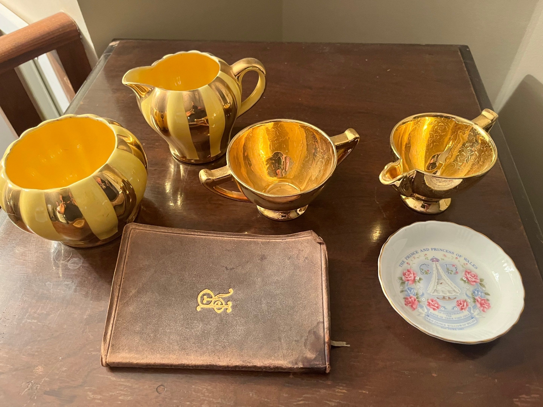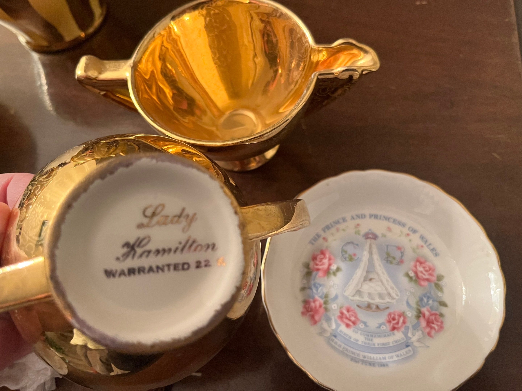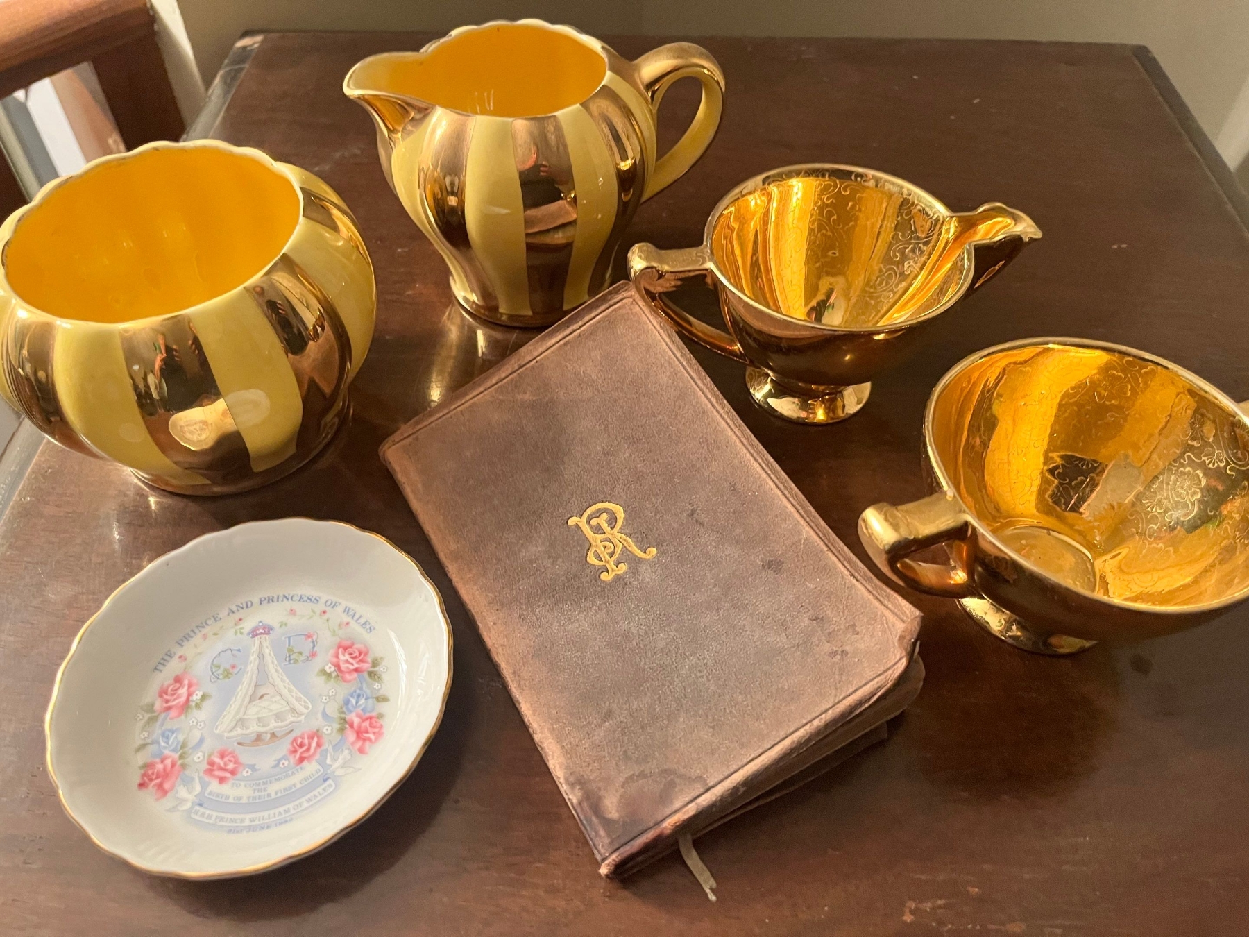 Vintage Lady Hamilton tea cups with 22 karat gold leaf along with sugar bowl and creamer made by sun Lowes of England and small vintage book