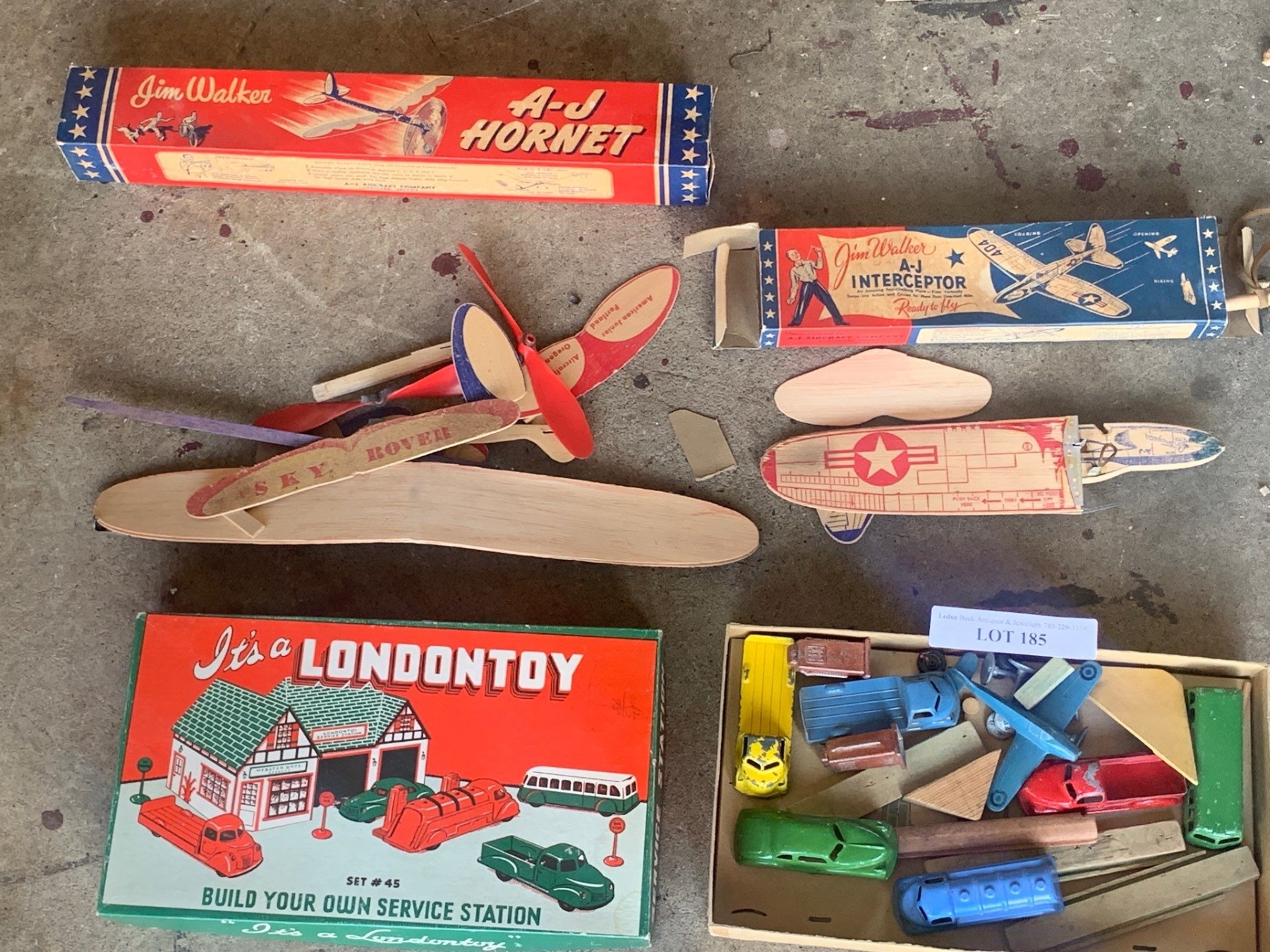 Vintage Londontoy Vehicle & Jim Walker A-J Hornet Rubber Band Plane & Inceptor Folding Wing Glider