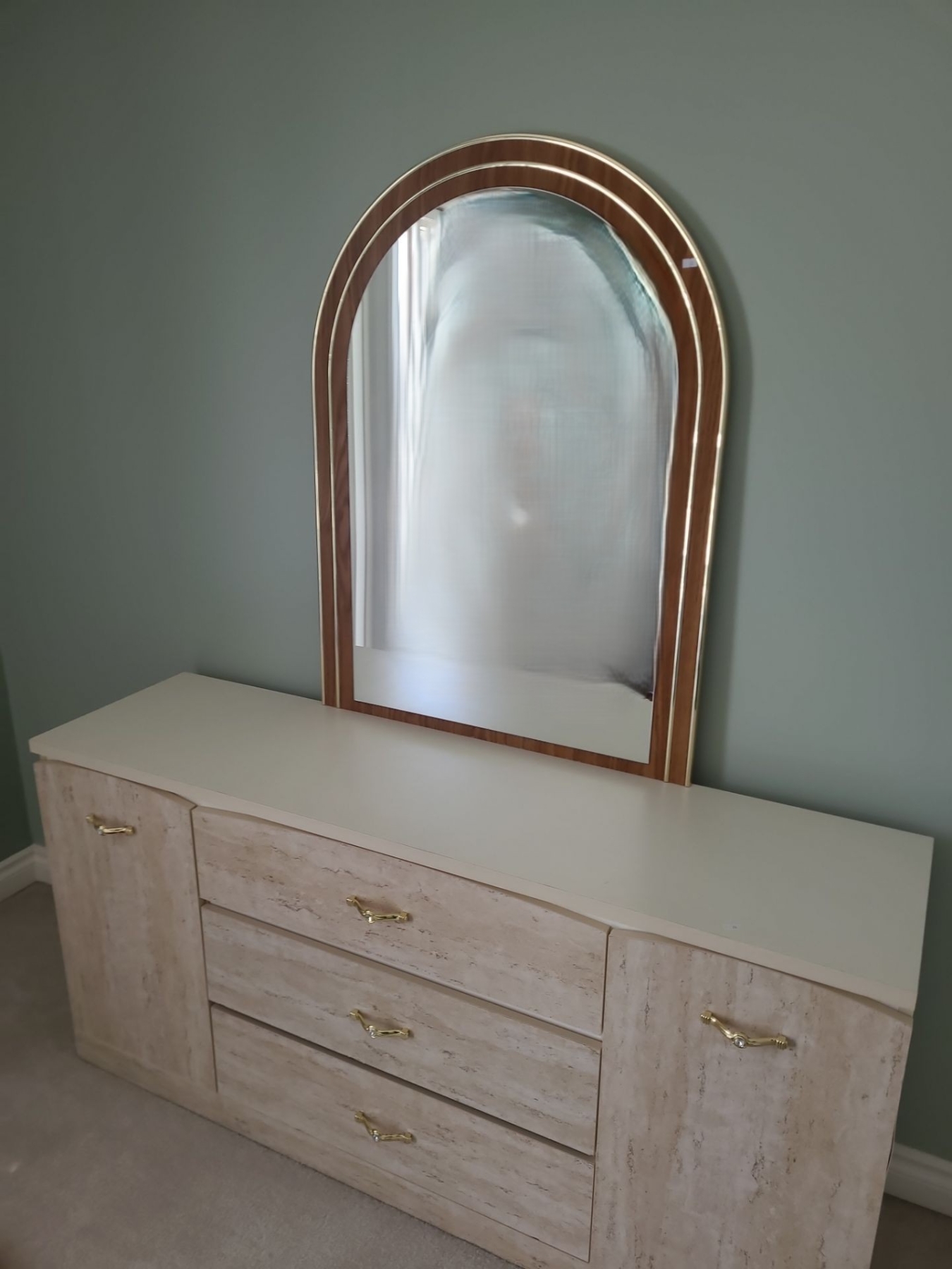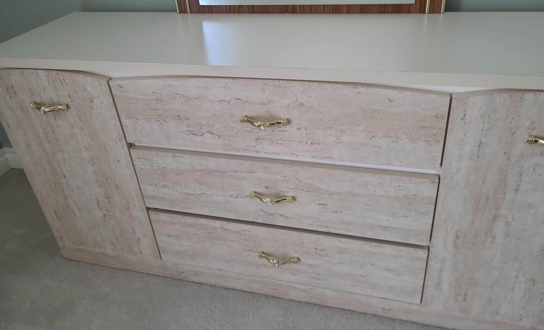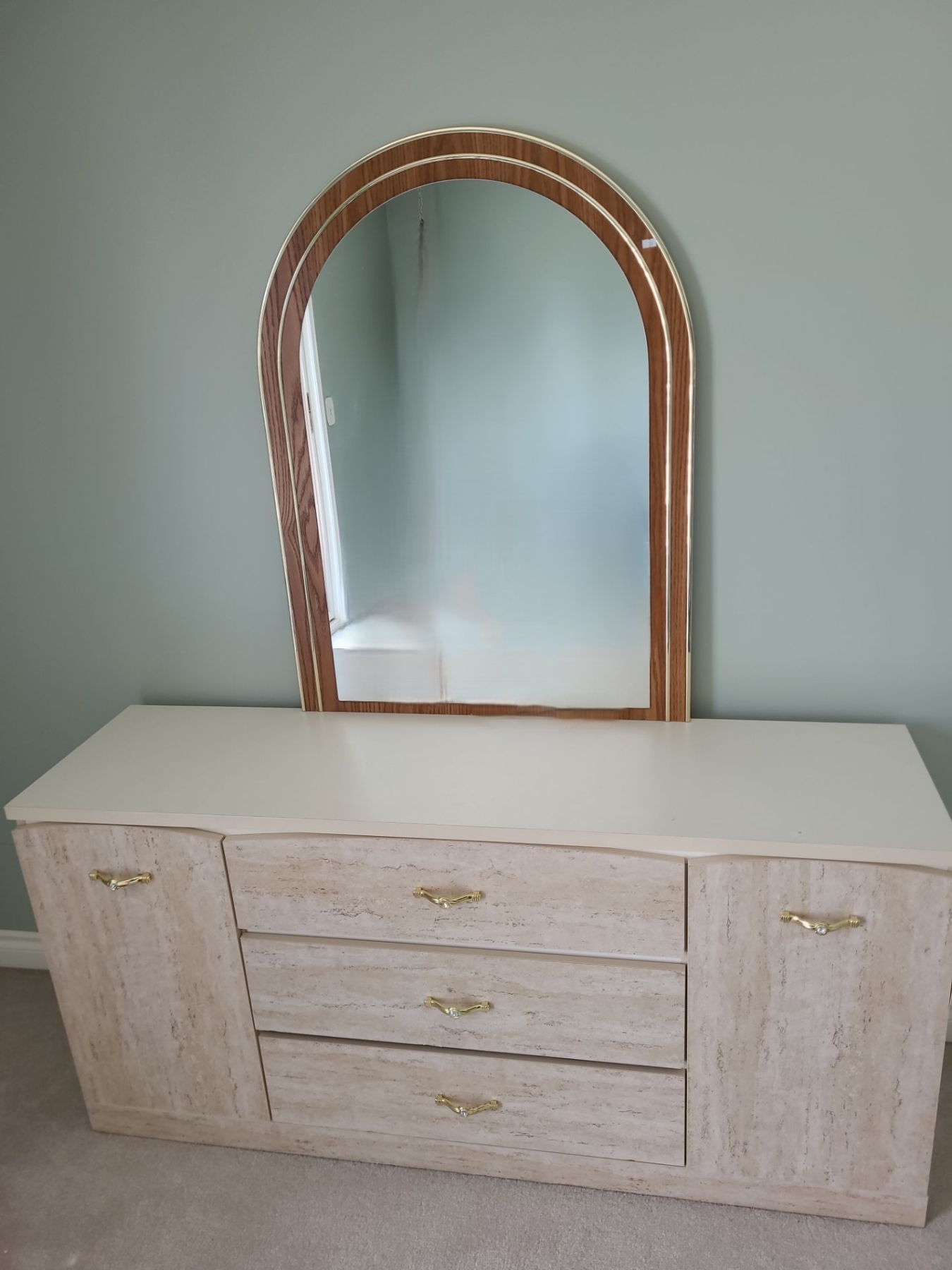 Vintage MDF Dresser w/ 3 Drawers, Side Cabinets 60 W, 16 D, 28.5 T and Attached Mirror 30 X 40
