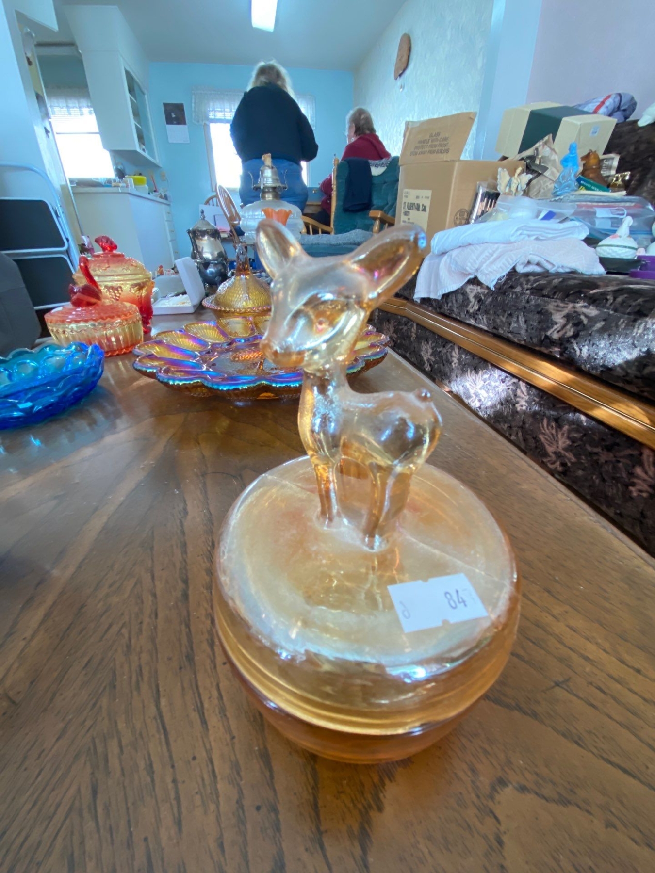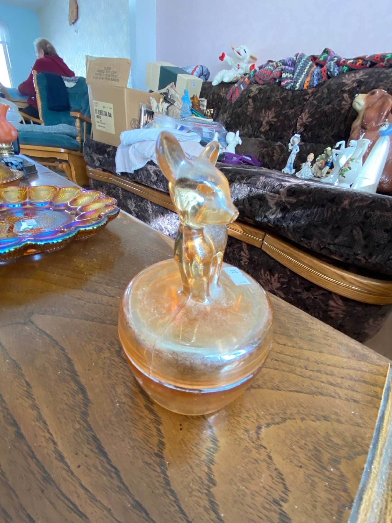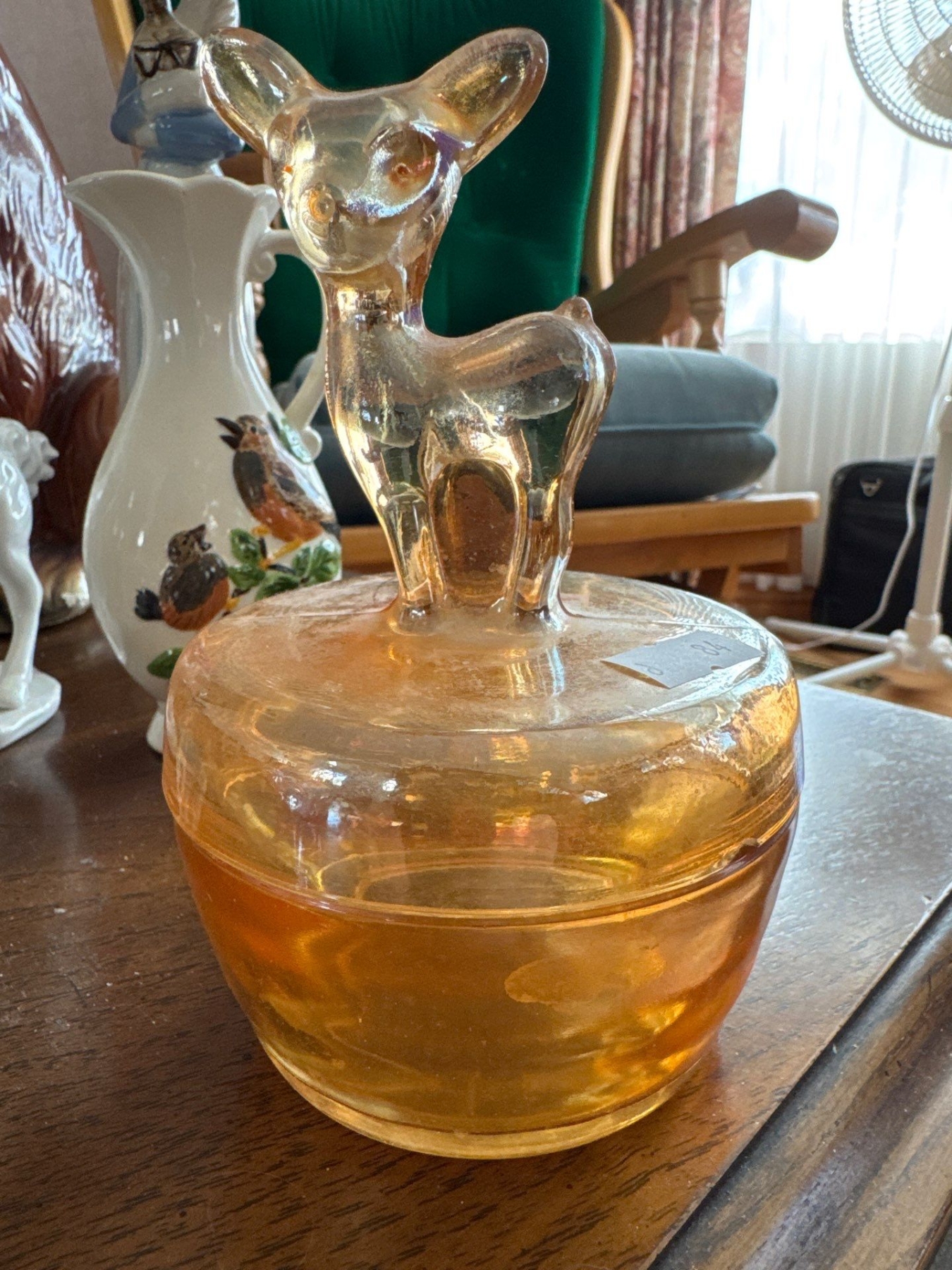 Vintage Marigold, carnival glass deer, fawn vanity, jar, glass deer 1930s