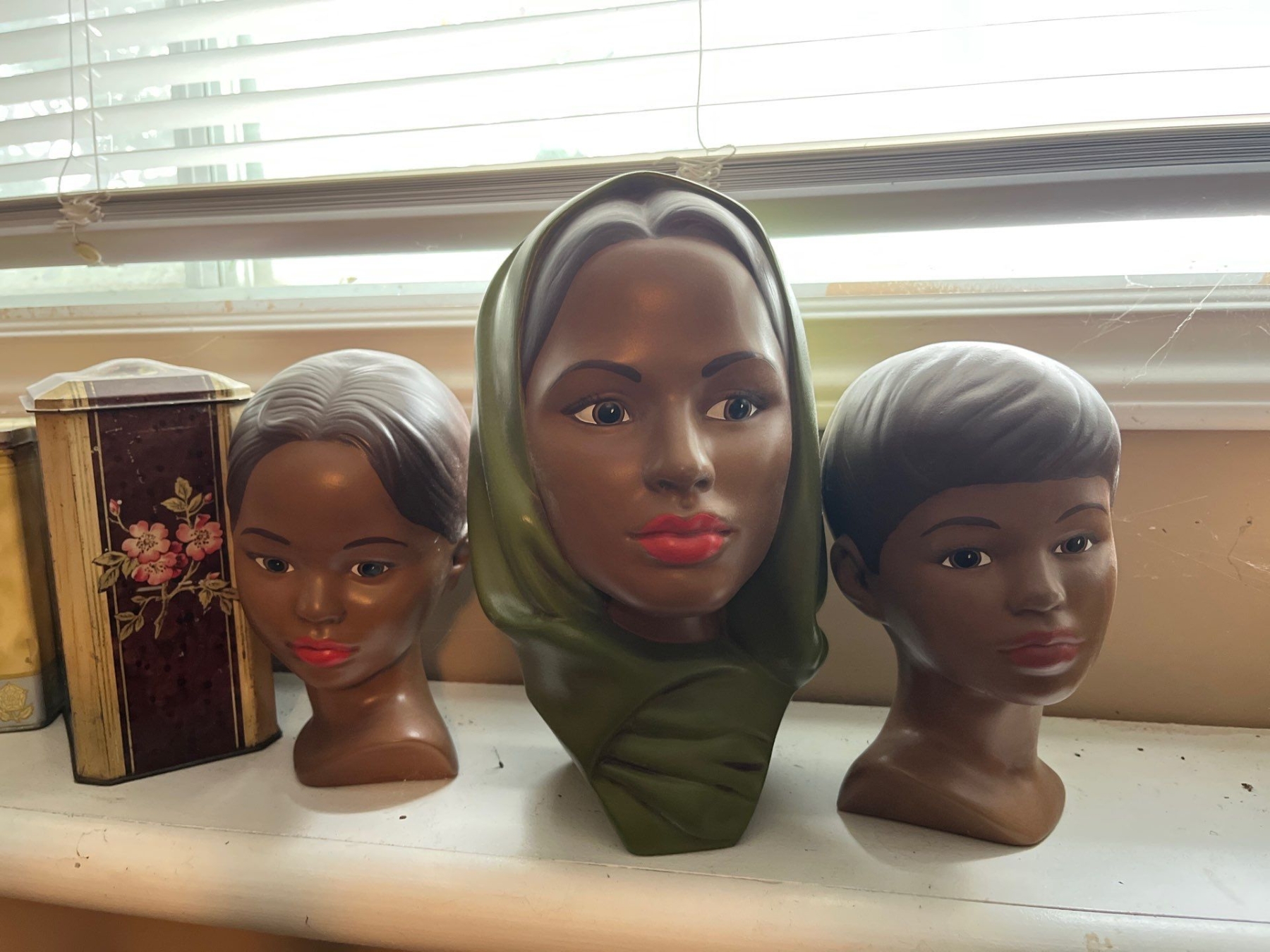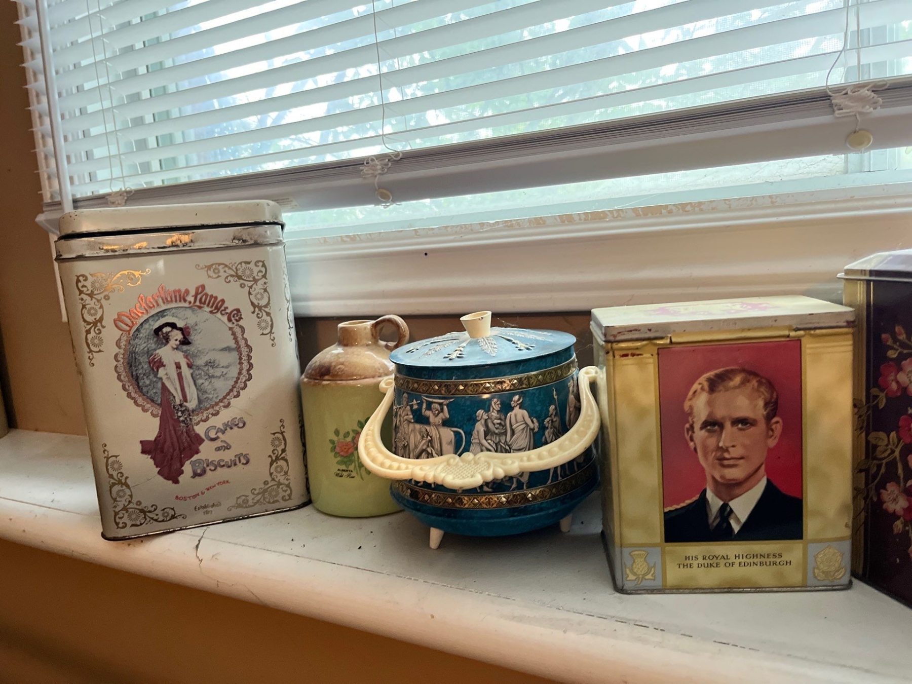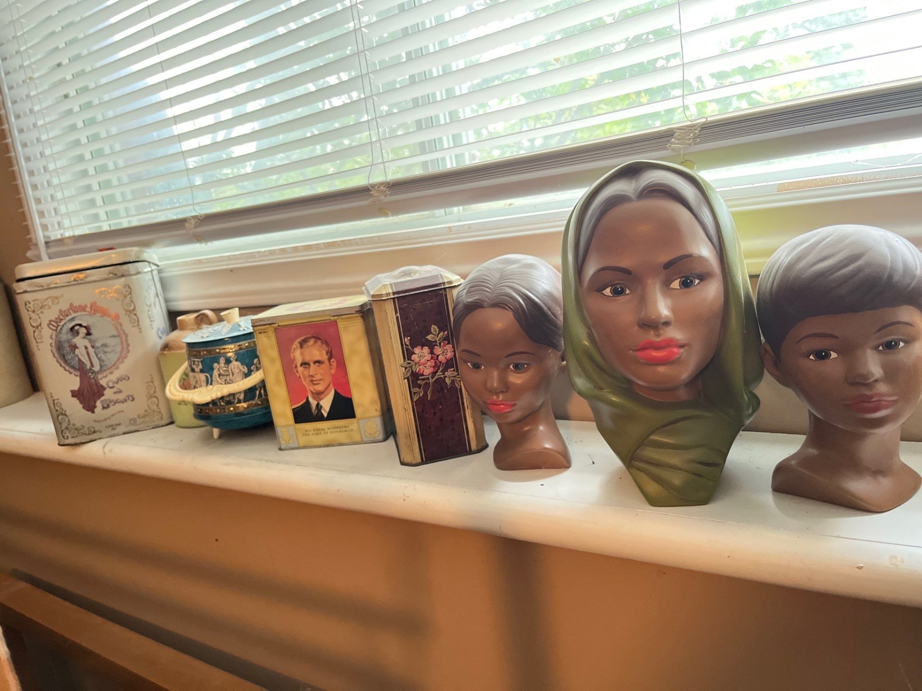 Vintage Marwal MOTHER, DAUGHTER Statuary Middle Eastern Family Plaster of Paris with a collection of tins and a small ceramic jug
