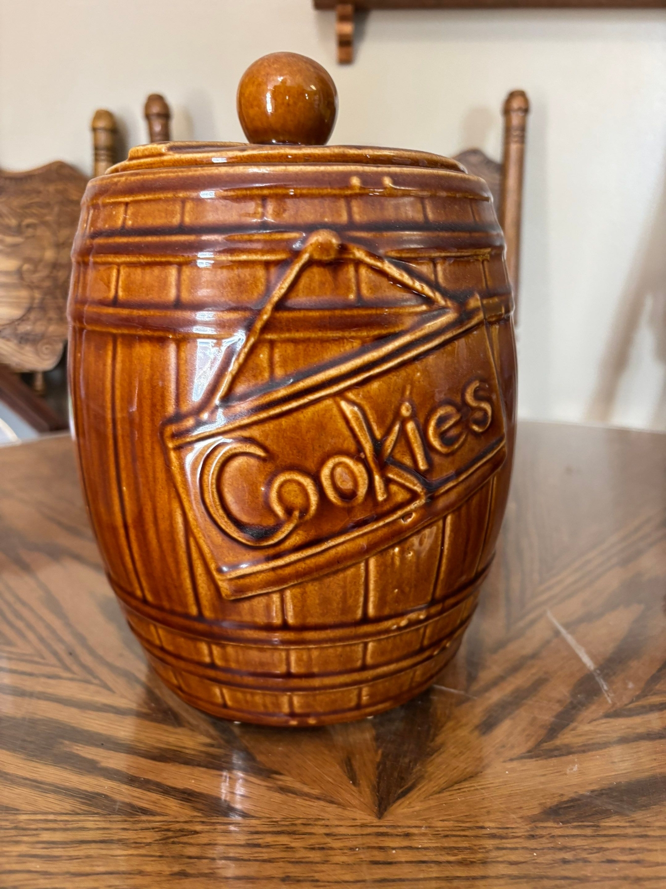 Vintage McCoy Barrel Cookie Jar, likely from the 1950s.
