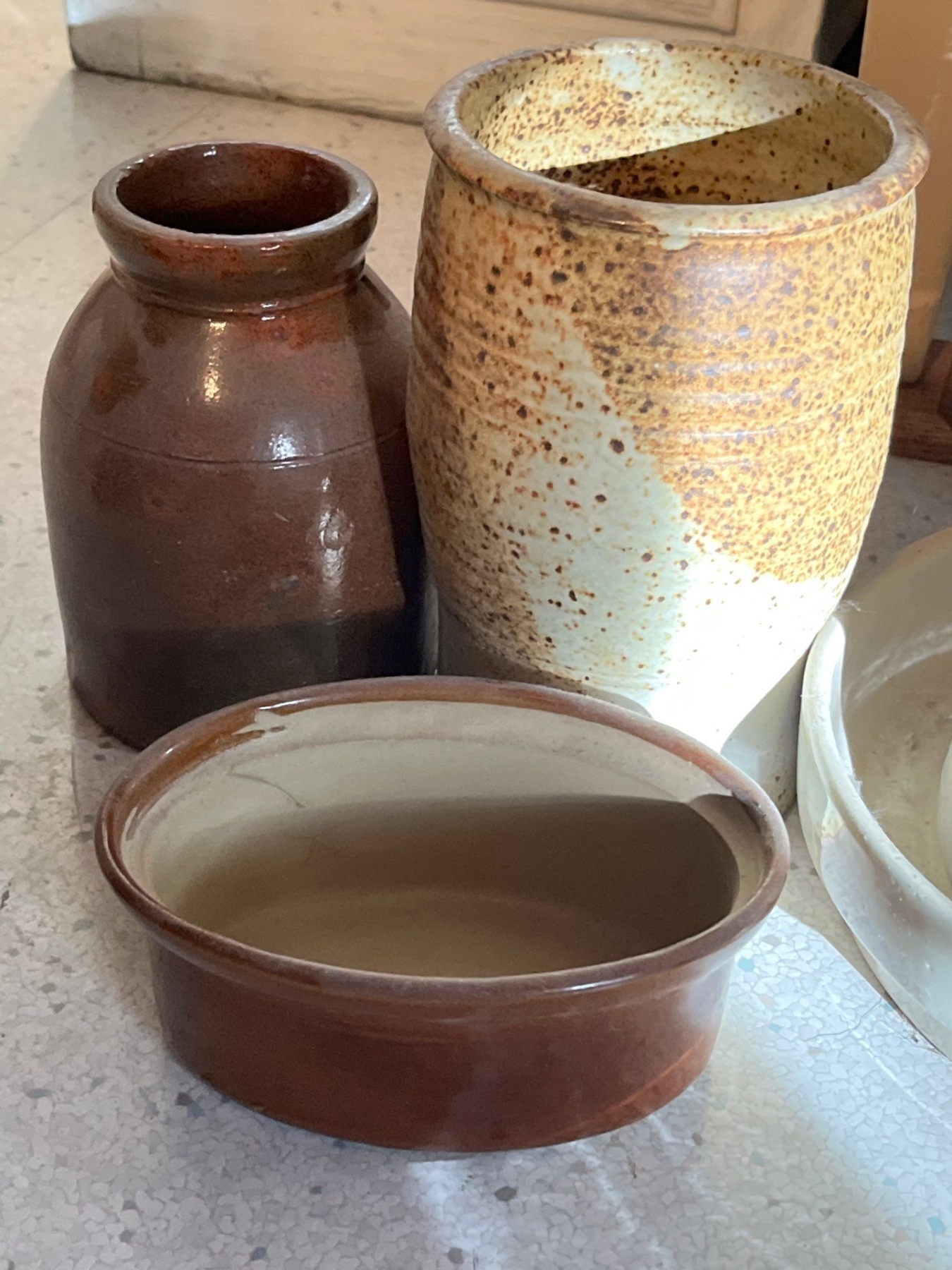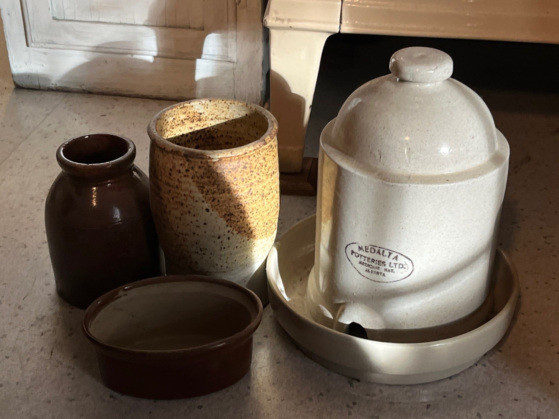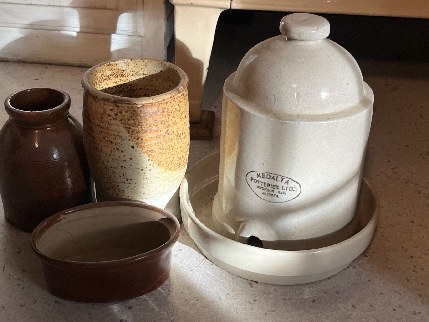 Vintage Medalta Potteries LTD, Medicine Hat, Alberta, Canada Poultry Feeder with 3 other antique pieces of pottery