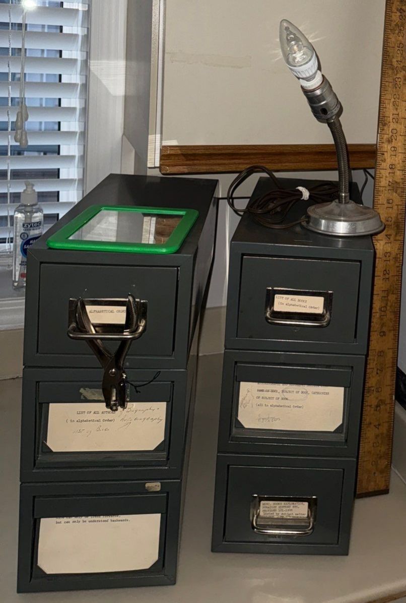Vintage Meter Stick with Mini Filing Drawers & Small Lamp